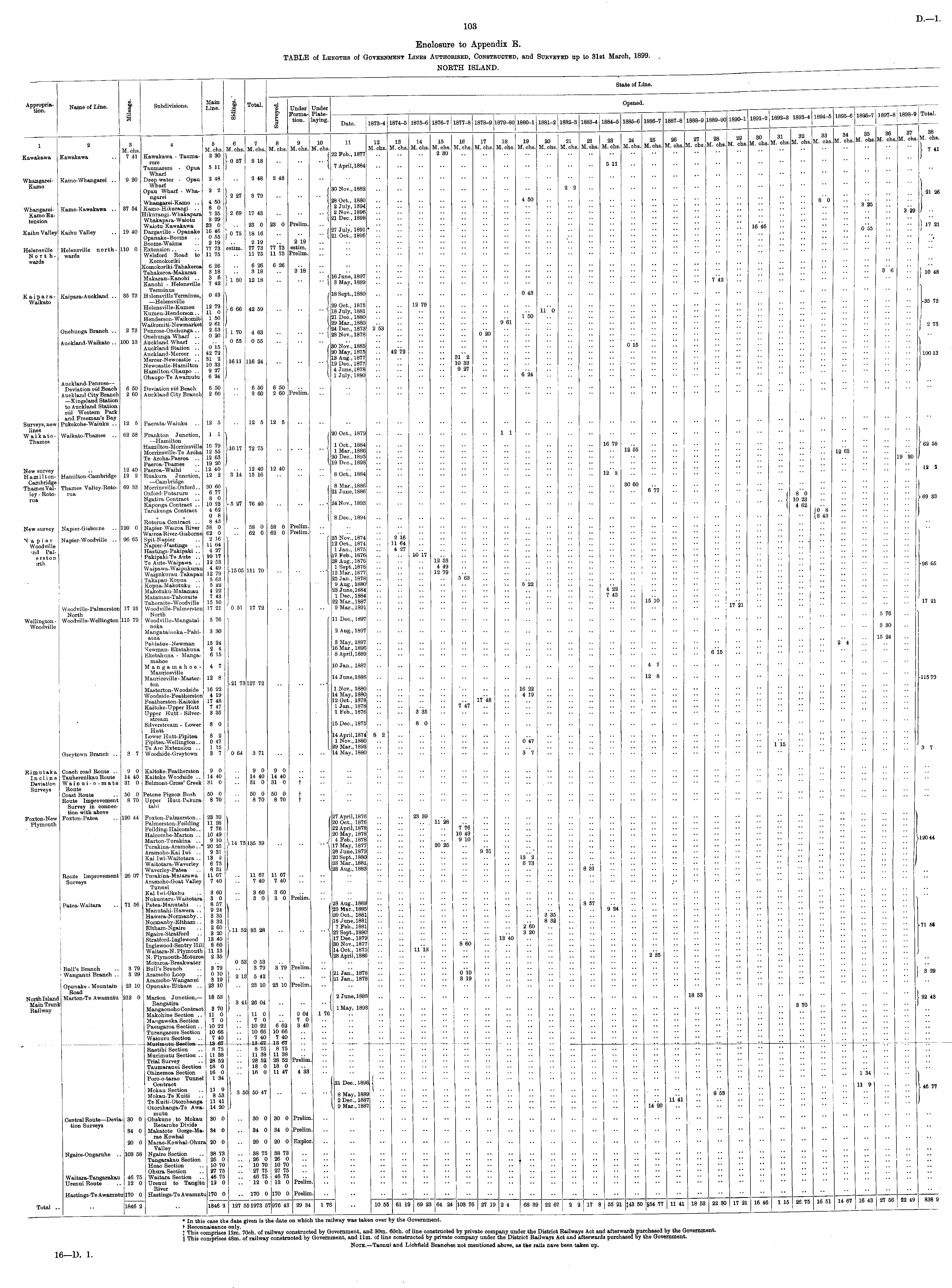 l:c oi jine. Appropriation. Name of Line. I I Subdivisions. Main Line. Total. I Under Formation. Under Platelaying. Opened. 1892-3 1893-4 1894-5 1895-6 1896-7 1897-8 1898-9 Total, Date. 11878-4 1874-5 1875-6 1876-7 1877-8 1879-80 1 1880-1 1881-2 1882-3 1883-4 1884-5 1885-* 1886-7 1887-8 1888-9 1889-90 1890-1 1891-2 1878-9 1 2 3 M. chs. 7 41 4 IV 5 M. chs. 2 30 6 M. chs. lo 57 7 M. chs. 8 M. chs. 9 M. chs. 10 M.chs. 11 12 M. chs. 13 tf. chs. 14 M. chs. 15 M. chs. 2 30 16 II. chs. 17 M. chs. 18 M. chs. 19 M. chs. 20 M. chs. 21 H. chs. 22 M. chs. 23 M. chs. 24 M. chs. 25 M. chs. 26 M. chs. 27 ] M. chs. 28 M. chs. 29 M. chs. 30 M. chs. 31 M. chs. 32 M. chs. M. chs. M. Che. 35 M. ohs. 36 M. chs. 87 M. ohB. 98 M. ch>. I 7 *1 Kawakawa WhangareiKamo WhangareiKamo Extension Kaihu Valley Helensville Nort rewards Kawakawa Kamo-Whangarei , - Kamo-Kawakawa .. Kaihu Valley Helensville northwards 19 40 110 0 37 54 9 20 a Kawakawa - Taumarere Taumarere ■ Opua Wharf Deep water - Opau Wharf Opau Wharf - Whangarei Whangarei-Kamo .. Kamo-Hikurangi .. Hikurangi-Wbakapara Wbakapara-Waiotu Waiotu-Kawakawa 5 Dargaville - Opanake 1 Opanake-Booms Booms-Waima Extension .. .. 1 Welsford Road to 1 Komokoriki Komokoriki-Tahakeroa Tahakeroa-Makarau Makarau-Kanohi .. Kanohi - Helensville Terminus Hjlensville Terminus, —Helensville Helensville-Kumeu 1 Kumen-HendeiBon.. I Henderson- Waikomiti Waikomiti-Newmarket Penrose-Onehunga .. Onehunga Wharf .. Auckland Wharf .. Auckland Station .. Auckland-Mercer .. 4 Mercer-Newcastle .. i Newcastle-Hamilton 1 Hamilton-Ohaupo .. Ohaupo-Te Awamutu 5 11 2 48 ' 2 2 4 50 i 8 0 3 25 3 29 23 0 16 46 0 55 2 19 77 73 11 75 6 26 3 18 3 0 7 42 11 2 27 I" 1 0 75 estim. 8 18 2 48 8 79 17 43 23 0 18 16 2 19 77 73 11 75 6 26 3 18 2 48 28 0 7773 11 75 6 26 Prelim. 2 19 estim. Prelim. 3 18 . I ■■{ 22 Feb., 1877 7 April,1884 30 Nov., 1882 28 Oct., 1880 2 July, 1894 2 Nov.,189(S 21 Dec, 1898 27 July, 1891 21 Oct., 1896 4 50 2 2 5 11 ■■ I 16 46 8 0 I .. I I .. 3 25 055 3 6 389 1 21 26 I 17 21 1 10 48 Kaipara-Auckland .. 1 1 50 12 18 ■■{ 16 June, 1897 3 May, 1889 7 42 K aiparaWaikato 35 73 0 43 12 79 11 0 1 50 !l (II 2 58 0 20 015 42 72 31 2 10 33 9 27 6 24 18 Sept., 1880 29 Oct., 1875 18 July, 1881 21 Dec, 1880 29 Mar., 1880 24 Dec, 1873 28 Nov., 1878 30 Not*, 1885 JO May, L87fi 13 Aug., 1877 19 Dec, 1877 4 June, 1878 1 July, 1880 12 79 0 43 1 50 ll"o ■■ 1-35 73 J I 2 73 6 66 42 59 Onehunga Branch .. 253 9 61 •• I 2 73 1 70 0 55 4 63 0 55 0 20 0 15 Auckland-Waikato -. 100 IS 1611 116 24 42 72 31 2 10 33 9 27 ■' '■ ) 10013 Auckland- Penrose— 1 Deviation via Beach Auckland City Branch —Kingsland Station to Auckland Station vi<< Western Park and Freeman's Bay Pukekohe-Waiuku .. 6 24 6 50 2 60 Deviation via Beach Auckland City Branch 6 50 2 60 6 50 2 60 6 50 2 60 Prelim. Paerata-Waiuku .. 1 Surveys, new lines WaikatoThames 12 5 12 5 12 5 12 5 Waikato-Thames .. 62 58 Frankton Junction, —Hamilton Hamilton-Morrinsville ] Morrinsville-Te Aroha 1 Te Aroha-Paeroa .. J Paeroa-Tliames .. 1 Paeroa-Waihi .. 1 Ruakura Junction, 1 —Cambridge Momusvillo-Oxford.. i Oxford-Putaruru .. N gat ira Contract .. KajKinga Contract .. 1 Tarukenga Contract Rotorua Contract .. Napier Wairoa River ' WairoaRiver-Gisborne ( Spit-Napier Napier-Hastings .. : Hasting-Pakipaki .. Pakipaki-Tc Autc .. : Te Aute-Waipawa .. - Waipawa-WaipukTiraii Waipiikurau -Takapau Tiikapau-lvopua Kopna-Makotuku .. Maxotuku-Matamau M ataman-Tali oraite Tahomite-Woodville : Woodville-Palmerston North Woodvillc-Mangatai-noka Manga tairioka-Pahi-atua Paliiatuft-Newman : Mewman- Eketahuna Eketahuna - MangaM a n g a m a h o c - Mauriceville Manriceville - Master- ! ton Mastcrton-Woodside - Woodside-Featherston 1 Featherston-Kaitoke ■ Kaitokc-Uppcr Hutt Upper Hutt - Silverstream Silverstream - Lower Hutt Lower Hutt-Pipitea Pipitea-Wellington.. Te Aro Extension .. i Woodside-Greytown 1 1 20 Oct., 1879 1 1 16 79 12 55 12 63 19 20 12 40 12 2 ■1017 72 75 1 Oct., 1884 1 Mar., 1880 20 Dec, 1895 .19 Deo., 1898 8 Oct.', 1884 16 79 1255 12 68 19 20 62 58 New survey HamiltonCambridge Thames Valley - Roto-Hamilton-Cambridge 12 40 12 2 12 40 15 16 12 40 12 "a 12 2 3 14 Thames Valley-Roto-69 33 30 60 6 77 8 0 10 23 4 62 0 8 8 43 58 0 62 0 2 16 11 64 4 27 10 17 12 53 4 49 12 79 5 (i:i 5 22 1 11 7 43 15 10 17 21 8 Mar., 1886 21 June, 1886 30 60 6 77 :; | 8 0 10 23 4 62 69 33 5 27 76 40 24 Nov. ,1893 [0 8 (8 43 New survey 1 Napier-Gisboine Prelim. Prelim. 8 Dec, 1894 120 0 58 0 62 0 58 0 62 0 .. N apierWoodville -,nd Palerston irtli i Napier-Woodville .. 96 65 25 Nov., 1874 12 Oct., 1874 1 Jan., 1875 17 Feb., 1876 28 Aug., 1876 1 Sept.,1876 12 Mar., 1877 25 Jan., 1878 9 Aug., 1880 23 June, 1884 1 Dec, 1884 22 Mar., 1887 9 Mar., 1891 2 16 11 64 4 27 1017 12 53 4 49 12 79 563 \\ I ■96 05 • 15 05 111 70 522 422 7 43 15 10 17 21 17 21 Woodville-Palmerston North Woodvillo-Wellington 17 21 115 79 5 70 0 51 17 72 11 Dec, 1897 0 76 Wellington - Woodvillo 3 30 3 80 2 Aug., 1897 15 24 15 24 2 4 6 15 3 May, 1897 16 Mar., 1896 8 April, 1889 2"i 6'l5 4 7 10 Jan., 1887 4 7 12 8 14 June, 1886 12 8 ■115 79 21 73 137 72 1 Nov., 1880 14 May, 1880 ! 12 Oct., 1878 1 Jan., 1878 ! 1 Feb., 1876 16 22 16 22 4 19 17 48 7 47 :i 35 17'48 335 J 7 47 8 0 15 Dec, 1875 8 0 8 2 0 47 1 15 3 7 14 April, 1874 1 Nov., 1880 29 Mar., 1893 14 May, 1880 8 2 047 Greytown Branch .. 3"7 115 3 7 3 7 0 64 3 71 Rimutaka Incline Deviation Surveys Coach road Route .. Tauherenikau Route WaiDui-o-mata Route Coast Route Route Improvement Survey in connection with above Foxton-Patea 9 0 14 40 31 0 Kaitoke-Featherston Kaitoke Woodside .. . Belmont-Cross' Creek ! 9 0 14 40 31 0 9 0 14 40 31 0 9 0 14 40 31 0 r 50 0 8 70 Petone Pigeon Biifh 1 ! Upper Hint Pakuratalii 50 0 8 70 50 0 8 70 50 0 8 70 t t Foxton-New Plymouth 120 44 Foxton-Palmerston.. I Palmcrstou-Foilding Feilding-Halcombe.. Halcoinbc-Marton .. Marton-Turakina .. Turakina-Aramoho ..* '. Aramoho-Kai Iwi .. Kai Iwi-Waitotara