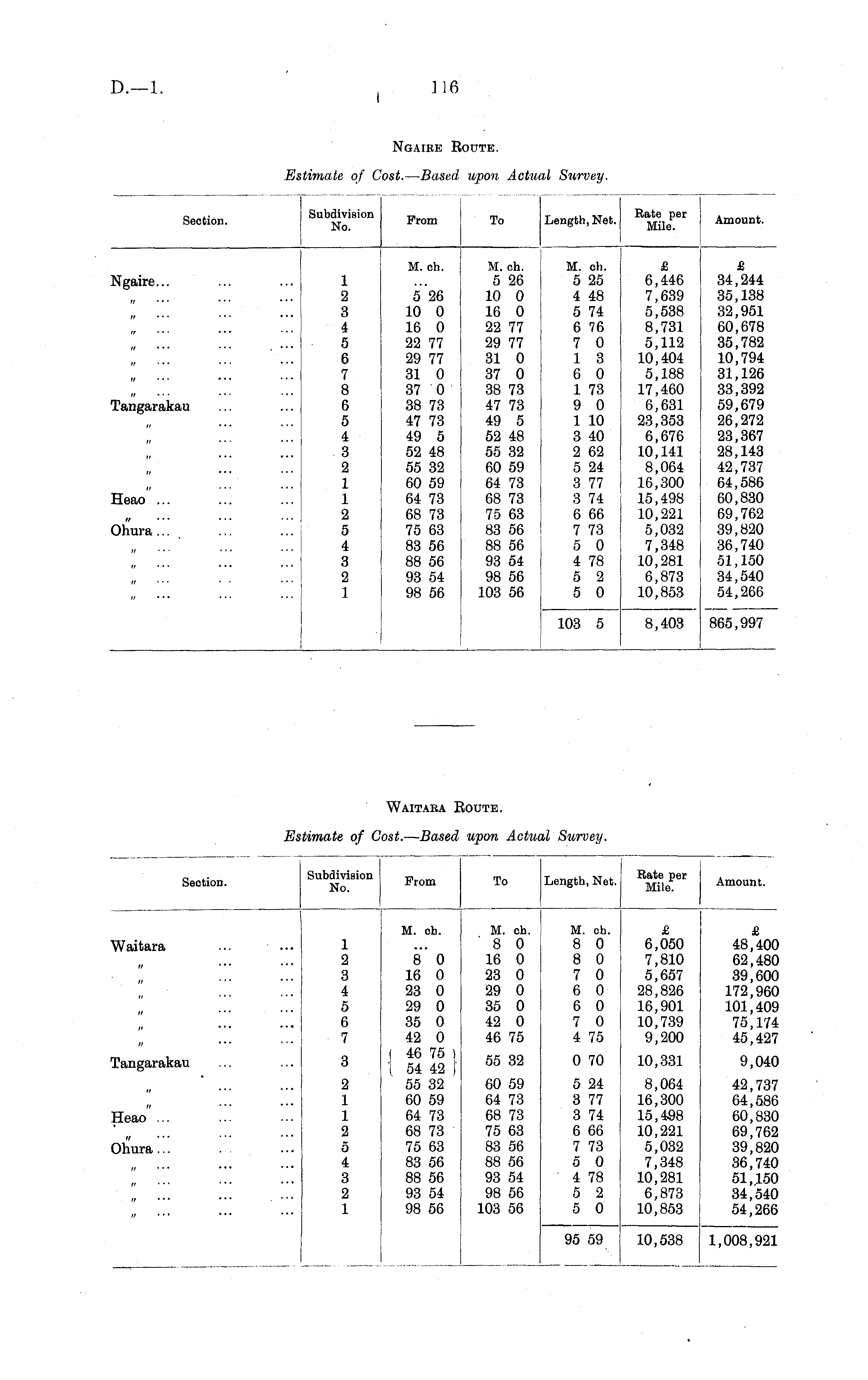 Section. Subdivision No. From To Length, Net. Bate per Mile. Amount. M. oh. M. ch. 8 0 16 0 23 0 29 0 35 0 42 0 46 75 M. ch. 8 0 8 0 7 0 6 0 6 0 7 0 4 75 £ 6,050 7,810 5,657 28,826 16,901 10,739 9,200 £ 48,400 62,480 39,600 172,960 101,409 75,174 45,427 vVaitara it it a 1 2 8 4 5 6 7 8 0 16 0 23 0 29 0 35 0 42 0 I 46 75 ) 1 54 42 J 55 32 60 59 64 73 68 73 75 63 83 56 88 56 93 54 98 56 a a Pangarakau 8 55 32 0 70 10,331 9,040 I a Eeao ... it Dhura ... 2 1 1 2 5 4 8 2 1 60 59 64 73 68 73 75 63 83 56 88 56 93 54 98 56 103 56 5 24 3 77 3 74 6 66 7 73 5 0 4 78 5 2 5 0 8,064 16,300 15,498 10,221 5,032 7,348 10,281 6,873 10,853 42,737 64,586 60,830 69,762 39,820 36,740 51,150 34,540 54,266 a a it "' 95 59 10,538 1,008,921