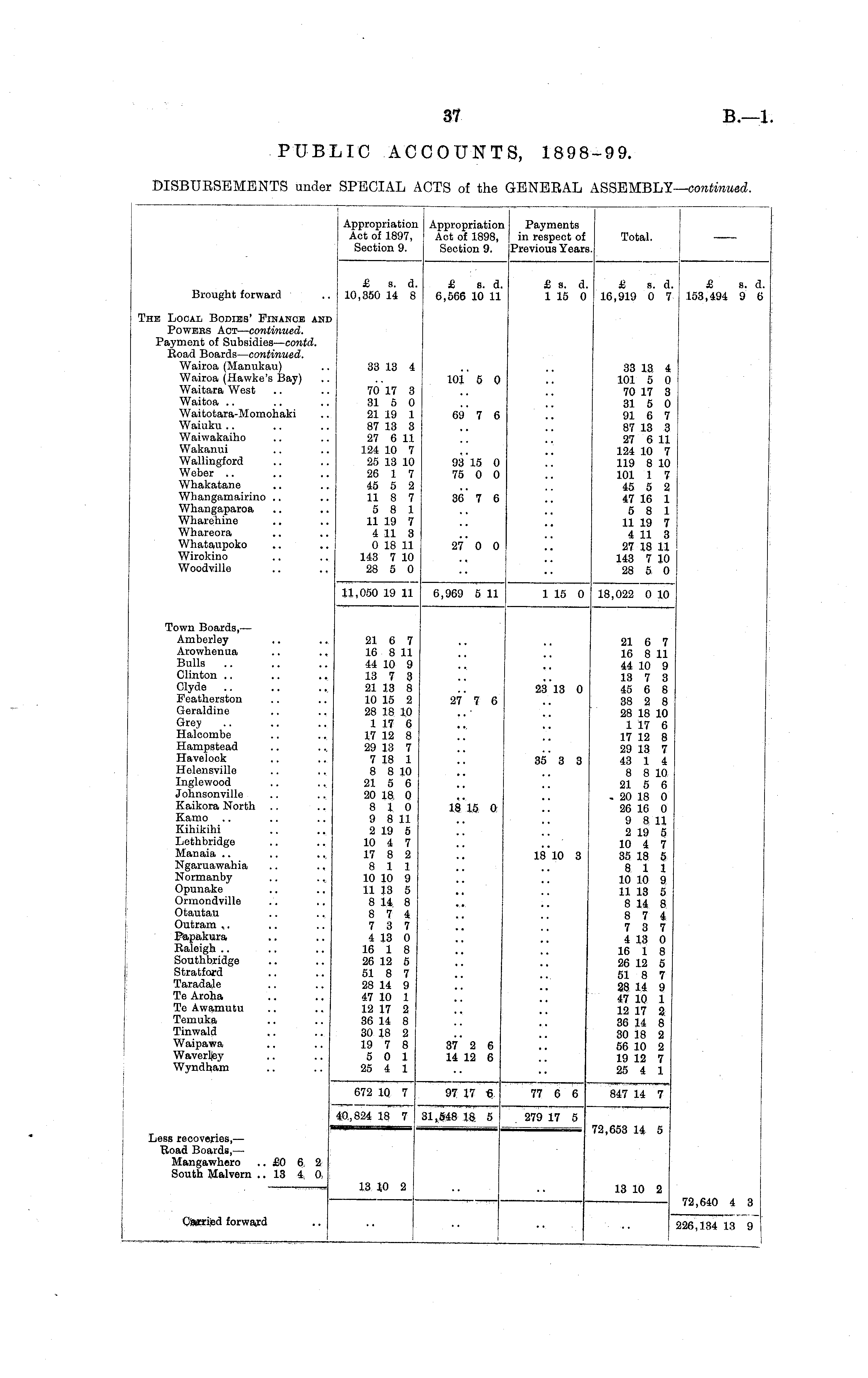 Appropriation Act of 1897, Section 9. Appropriation Act of 1898, Section 9. Payments in respect of Previous Years. Total. Brought forward £ s. d. 10,350 14 8 £ s. d. 6,566 10 11 £ s. d. 1 15 0 £ s. d. 16,919 0 7 £ s. d. 153,494 9 6 'he Local Bodies' Finance and Powers Act— continued. Payment of Subsidies — contd. Road Boards — continued. Wairoa (Manukau) Wairoa (Hawke's Bay) Waitara West Waitoa Waitotara-Momohaki Waiuku Waiwakaiho Wakanui Wallingford Weber Whakatane Whangamairino Whangaparoa Wharehine Whareora Whataupoko Wirokino Woodville 33 13 4 70 17 3 31 5 0 21 19 1 87 13 3 27 6 11 124 10 7 25 13 10 26 1 7 45 5 2 11 8 7 5 8 1 11 19 7 4 11 3 0 18 11 143 7 10 28 5 0 101 5 0 69' 7 6 93 15 0 75 0 0 33 13 4 101 5 0 70 17 3 31 5 0 91 6 7 87 13 3 27 6 11 124 10 7 119 8 10 101 1 7 45 5 2 47 16 1 5 8 1 11 19 7 4 11 3 27 18 11 143 7 10 28 5 0 36 7 6 27' 0 0 11,050 19 11 6,969 5 11 1 15 0 18,022 0 10 Town Boards, — Amberley Arowhenua Bulls .. Clinton Clyde .. Featherston Geraldine Grey Halcombe Hampstead Havelook Helensville Inglewood Johnsonville Kaikora North Kamo Kihikihi Lethbridge Manaia Ngaruawahia .. ., Normanby Opunake Ormondville Otautau Outram ,. Papakura Raleigh Southbridge Stratford Taradale Te Aroha Te Awamutu Temuka Tinwald Waipawa Waverljey Wyndbam 21 6 7 16 8 11 44 10 9 13 7 3 21 13 8 10 15 2 28 18 10 1 17 6 17 12 8 29 13 7 7 18 1 8 8 10 21 5 6 20 18 0 8 10 9 8 11 2 19 5 10 4 7 17 8 2 8 11 10 10 9 11 13 5 8 14 8 8 7 4 7 3 7 4 13 0 16 1 8 26 12 5 51 8 7 28 14 9 47 10 1 12 17 2 36 14 8 30 18 2 19 7 8 5 0 1 25 4 1 27' 7 6 18'15 0. 2313 0 35 3 3 1810 3 21 6 7 16 8 11 44 10 9 13 7 3 45 6 8 38 2 8 28 18 10 1 17 6 17 12 8 29 13 7 43 1 4 8 8 10 21 5 6 - 20 18 0 26 16 0 9 8 11 2 19 5 10 4 7 35 18 5 8 1 1 10 10 9 11 13 5 8 14 8 8 7 4 7 3 7 4 13 0 16 1 8 26 12 5 51 8 7 28 14 9 47 10 1 12 17 2 36 14 8 30 18 2 56 10 2 19 12 7 25 4 1 37' 2 6 14 12 6 672 10 7 97 17 6 77 6 6 847 14 7 s Less recoveries, — Road Boards, — Mangawhero .. £0 6 2 South Malvern .. 13 4 0 40,824 18 7 31,548 18, 5 279 17 5 72,653 14 5 13 10 2 13 10 2 72,640 4 3 Carried forward 226,134 13 9