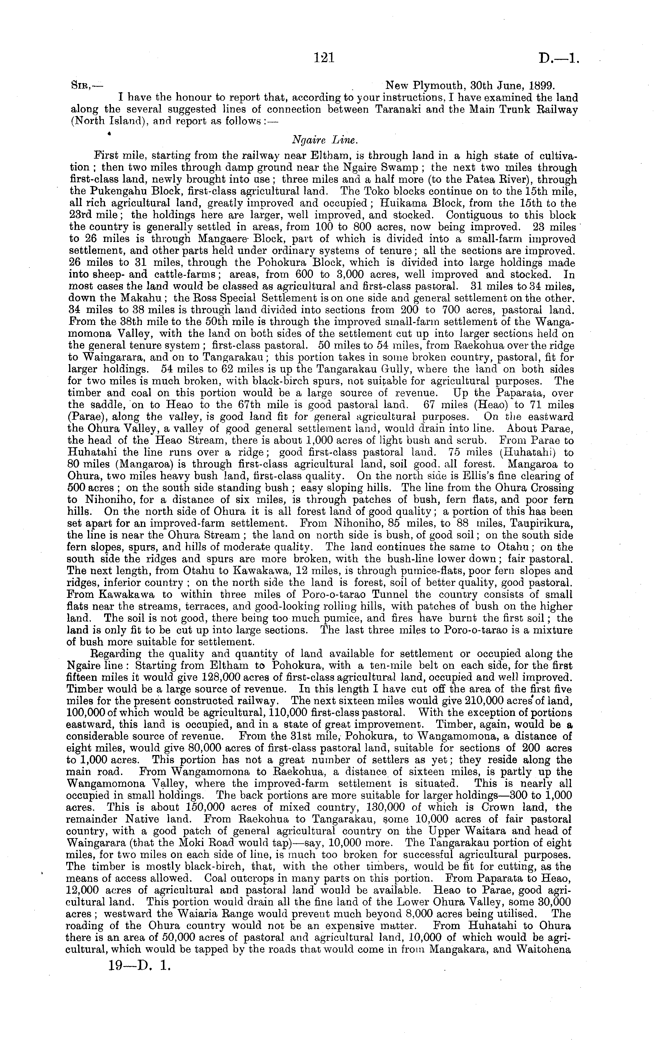 Sib,— . New Plymouth, 30th June, 1899. I have the honour to report that, according to your instructions, I have examined the land along the several suggested lines of connection between Taranaki and the Main Trunk Eailway (North Island), and report as follows : — Ngairc Line. First mile, starting from the railway near Eltham, is through land in a high state of cultivation ; then two miles through damp ground near the Ngaire Swamp ; the next two miles through first-class land, newly brought into use ; three miles and a half more (to the Patea Eiver), through the Pukengahu Block, first-class agricultural land. The Toko blocks continue on to the 15th mile, all rich agricultural land, greatly improved and occupied; Huikama Block, from the 15th to the 23rd mile; the holdings here are larger, well improved, and stocked. Contiguous to this block the country is generally settled in areas, from 100 to 800 acres, now being improved. 23 miles to 26 miles is through Mangaere- Block, part of which is divided into a small-farm improved settlement, and other parts held under ordinary systems of tenure; all the sections are improved. 26 miles to 31 miles, through the Pohokura Block, which is divided into large holdings made into sheep- and cattle-farms; areas, from 600 to 3,000 acres, well improved and stocked. In most cases the land would be classed as agricultural and first-class pastoral. 31 miles to 34 miles, down the Makahu ; the Ross Special Settlement is on one side and general settlement on the other. 34 miles to 38 miles is through land divided into sections from 200 to 700 acres, pastoral land. From the 38th mile to the 50th mile is through the improved small-farm settlement of the Wangarnomona Valley, with the land on both sides of the settlement cut up into larger sections held on the general tenure system ; first-class pastoral. 50 miles to 54 miles, from Raekohua over the ridge to Waingarara, and on to Tangarakau; this portion takes in some broken country, pastoral, fit for larger holdings. 54 miles to 62 miles is up the Tangarakau Gully, where the land on both sides for two miles is much broken, with black-birch spurs, not suitable for agricultural purposes. The timber and coal on this portion would be a large source of revenue. Up the Paparata, over the saddle, on to Heao to the 67th mile is good pastoral land. 67 miles (Heao) to 71 miles (Parae), along the valley, is good land fit for general agricultural purposes. On the eastward the Ohura Valley, a valley of good general settlement land, would drain into line. About Parae, the head of the Heao Stream, there is about 1,000 acres of light bush and scrub. From Parae to Huhatahi the line runs over a ridge; good first-class pastoral land. 75 miles (Huhatahi) to 80 miles (Mangaroa) is through first-class agricultural land, soil good, all forest. Mangaroa to Ohura, two miles heavy bush land, first-class quality. On the north side is Ellis's fine clearing of 500 acres ; on the south side standing bush ; easy sloping hills. The line from the Ohura Crossing to Nihoniho, for a distance of six miles, is through patches of bush, fern flats, and poor fern hills. On the north side of Ohura it is all forest land of good quality; a portion of this has been set apart for an improved-farm settlement. From Nihoniho, 85 miles, to 88 miles, Taupirikura, the line is near the Ohura Stream ; the land on north side is bush, of good soil; on the south side fern slopes, spurs, and hills of moderate quality. The land continues the same to Otahu ; on the south side the ridges and spurs are more broken, with the bush-line lower down; fair pastoral. The next length, from Otahu to Kawakawa, 12 miles, is through pumice-flats, poor fern slopes and ridges, inferior country ; on the north side the land is forest, soil of better quality, good pastoral. From Kawakawa to within three miles of Poro-o-tarao Tunnel the country consists of small flats near the streams, terraces, and good-looking rolling hills, with patches of bush on the higher land. The soil is not good, there being too much pumice, and fires have burnt the first soil; the land is only fit to be cut up into large sections. The last three miles to Poro-o-tarao is a mixture of bush more suitable for settlement. Regarding the quality and quantity of land available for settlement or occupied along the Ngaire line : Starting from Bltham to Pohokura, with a ten-mile belt on each side, for the first fifteen miles it would give 128,000 acres of first-class agricultural land, occupied and well improved. Timber would be a large source of revenue. In this length I have cut off the area of the first five miles for the present constructed railway. The next sixteen miles would give 210,000 acres'of land, 100,000 of which would be agricultural, 110,000 first-class pastoral. With the exception of portions eastward, this land is occupied, and in a state of great improvement. Timber, again, would be a considerable source of revenue. From the 31st mile, Pohokura, to Wangamomona, a distance of eight miles, would give 80,000 acres of first-class pastoral land, suitable for sections of 200 acres to 1,000 acres. This portion has not a great number of settlers as yet; they reside along the main road. From Wangamomona to Raekohua, a distance of sixteen miles, is partly up the Wangamomona Valley, where the improved-farm settlement is situated. This is nearly all occupied in small holdings. The back portions are more suitable for larger holdings —300 to 1,000 acres. This is about 150,000 acres of mixed country, 130,000 of which is Crown land, the remainder Native land. From Raekohua to Tangarakau, some 10,000 acres of fair pastoral country, with a good patch of general agricultural country on the Upper Waitara and head of Waingarara (that the Moki Road would tap)—say, 10,000 more. The Tangarakau portion of eight miles, for two miles on each side of line, is much too broken for successful agricultural purposes. The timber is most