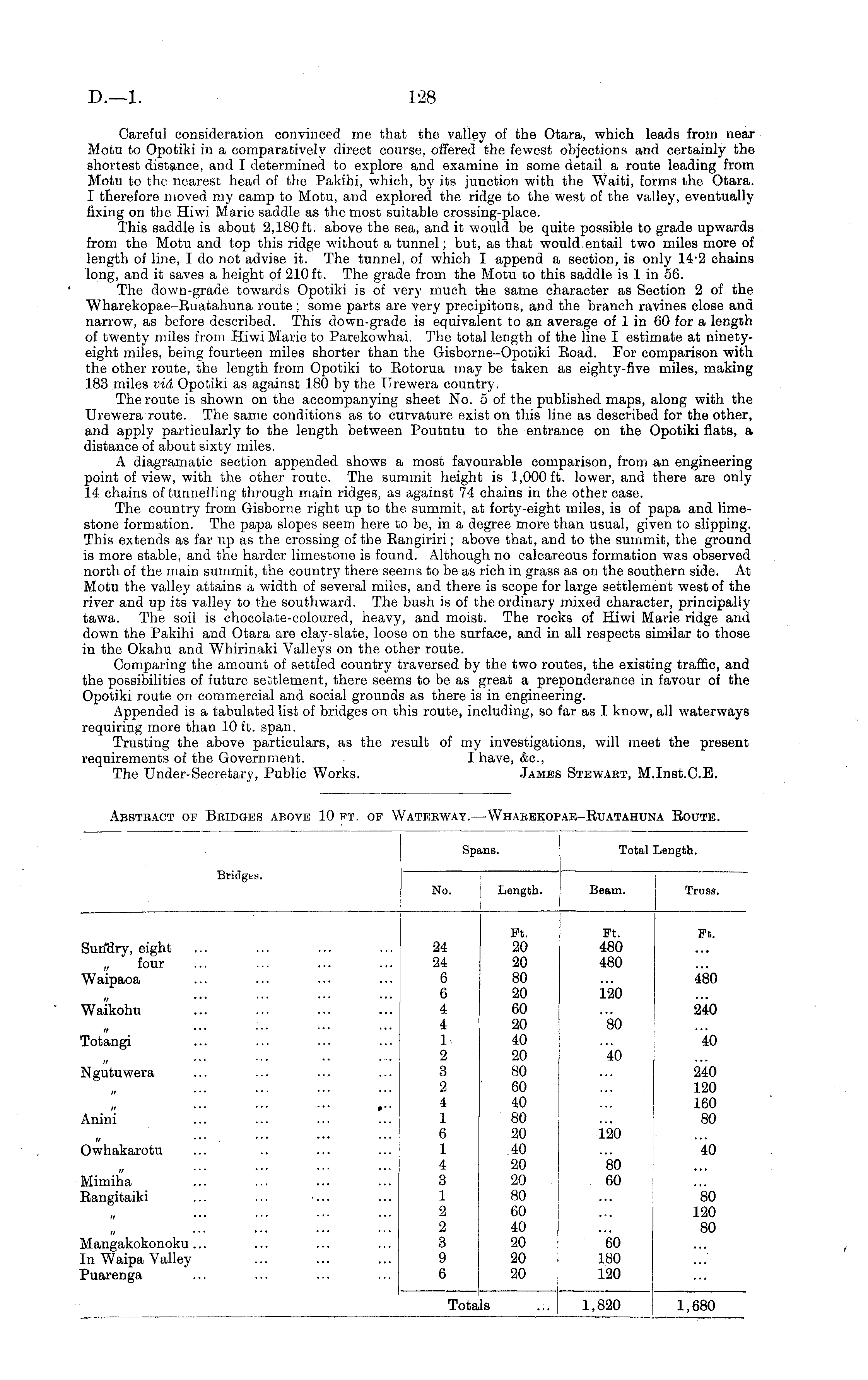 Careful consideration convinced me that the valley of the Otara, which leads from near Motu to Opotiki in a comparatively direct course, offered the fewest objections and certainly the shortest distance, and I determined to explore and examine in some detail a route leading from Motu to the nearest head of the Pakihi, which, by its junction with the Waiti, forms the Otara. I therefore moved my camp to Motu, and explored the ridge to the west of the valley, eventually fixing on the Hiwi Marie saddle as the most suitable crossing-place. This saddle is about 2,180 ft. above the sea, and it would be quite possible to grade upwards from the Motu and top this ridge without a tunnel; but, as that would entail two miles more of length of line, Ido not advise it. The tunnel, of which I append a section, is only 14 - 2 chains long, and it saves a height of 210 ft. The grade from the Motu to this saddle is lin 56. The down-grade towards Opotiki is of very much the same character as Section 2 of the Wharekopae-Buatahuna route; some parts are very precipitous, and the branch ravines close and narrow, as before described. This down-grade is equivalent to an average of lin 60 for a length of twenty miles from Hiwi Marie to Parekowhai. The total length of the line I estimate at ninetyeight miles, being fourteen miles shorter than the Gisborne-Opotiki Eoad. For comparison with the other route, the length from Opotiki to Eotorua may be taken as eighty-five miles, making 183 miles vid Opotiki as against 180 by the TTrewera country. The route is shown on the accompanying sheet No. 5 of the published maps, along with the Urewera route. The same conditions as to curvature exist on this line as described for the other, and apply particularly to the length between Poututu to the entrance on the Opotiki flats, a distance of about sixty miles. A diagramatic section appended shows a most favourable comparison, from an engineering point of view, with the other route. The summit height is 1,000 ft. lower, and there are only 14 chains of tunnelling through main ridges, as against 74 chains in the other case. The country from Gisborne right up to the summit, at forty-eight miles, is of papa and limestone formation. The papa slopes seem here to be, in a degree more than usual, given to slipping. This extends as far up as the crossing of the Bangiriri; above that, and to the summit, the ground is more stable, and the harder limestone is found. Although no calcareous formation was observed north of the main summit, the country there seems to be as rich in grass as on the southern side. At Motu the valley attains a width of several miles, and there is scope for large settlement west of the river and up its valley to the southward. The bush is of the ordinary mixed character, principally tawa. The soil is chocolate-coloured, heavy, and moist. The rocks of Hiwi Marie ridge and down the Pakihi and Otara are clay-slate, loose on the surface, and in all respects similar to those in the Okahu and Whirinaki Valleys on the other route. Comparing the amount of settled country traversed by the two routes, the existing traffic, and the possibilities of future settlement, there seems to be as great a preponderance in favour of the Opotiki route on commercial and social grounds as there is in engineering. Appended is a tabulated list of bridges on this route, including, so far as I know, all waterways requiring more than 10 ft. span. Trusting the above particulars, as the result of my investigations, will meet the present requirements of the Government. . I have, &c, The Under-Secretary, Public Works. James Stewabt, M.lnst.C.B.