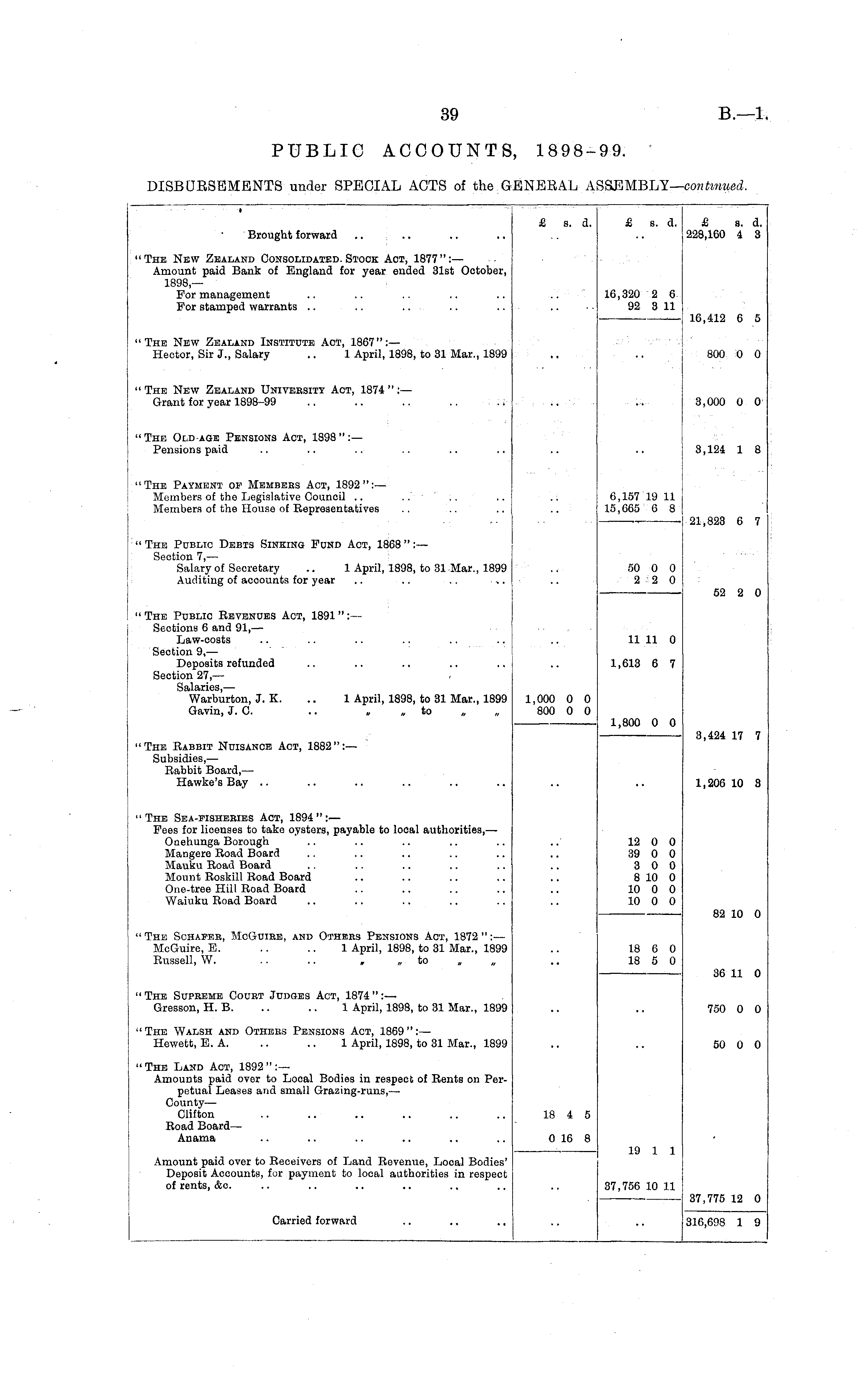• £ s. d. Brought forward £ s. d. £ s. d. 228,160 4 3 'The New Zealand Consolidated. Stock Act, 1877": — Amount paid Bank of England for year ended 31st October, 1898 — For management For stamped warrants .. .. 16,320 2 6 92 3 11 16,412 6 5 'The New Zealand Institute Act, 1867": — Hector, Sir J., Salary .. 1 April, 1898, to 31 Mar., 1899 800 0 0 ■' The New Zealand University Act, 1874 " :— Grant for year 1898-99 .. .. .. .. :".t 3,000 0 0 " The Old-age Pensions Act, 1898 " :— Pensions paid 3,124 1 8 "The Payment of Members Act, 1892": — Members of the Legislative Council .. .... Members of the House of Representatives .. .. 6,157 19 11 15,665 6 8 21,823 6 7 " The Public Debts Sinking Fund Act, 1868 " :— Section 7, — Salary of Secretary .. 1 April, 1898, to 31 Mar., 1899 Auditing of accounts for year 50 0 0 2 2 0 52 2 0 ' The Public Revenues Act, 1891" :— Sections 6 and 91, — Law-costs Section 9, — Deposits refunded Section 27 — Salaries, — Warburton, J. K. .. 1 April, 1898, to 31 Mar., 1899 Gavin, J. C. .. „ „ to „ „ 11 11 0 1,613 6 7 1,000 0 0 800 0 0 1,800 0 0 'The Rabbit Nuisance Act, 1882":— Subsidies, — Rabbit Board, — Hawke's Bay 3,424 17 7 1,206 10 8 "The Sea-fisheries Act, 1894":— Fees for licenses to take oysters, payable to local authorities, — Onehunga Borough Mangere Road Board Mauku Road Board Mount Roskill Road Board One-tree Hill Road Board Waiuku Road Board 12 0 0 39 0 0 3 0 0 8 10 0 10 0 0 10 0 0 " The Schafer, McGuire, and Others Pensions Act, 1872 ": — McGuire, E. .. .. 1 April, 1898, to 31 Mar., 1899 Russell, W. .. .. . „ to 82 10 0 18 6 0 18 5 0 36 11 0 " The Supreme Court Judges Act, 1874 " :— Gresson, H. B. .. .. 1 April, 1898, to 31 Mar., 1899 750 0 0 " The Walsh and Others Pensions Act, 1869 ": — Hewett, E. A. .. .. 1 April, 1898, to 31 Mar., 1899 50 0 0 "The Land Act, 1892":— Amounts paid over to Local Bodies in respect of Rents on Perpetual Leases and small Grazing-runs,— County— Clifton Road Board— Anama 18 4 5 I0 16 8 Amount paid over to Receivers of Land Revenue, Local Bodies' Deposit Accounts, for payment to local authorities in respect of rents, &c. 19 1 1 37,756 10 11 37,775 12 0 Carried forward