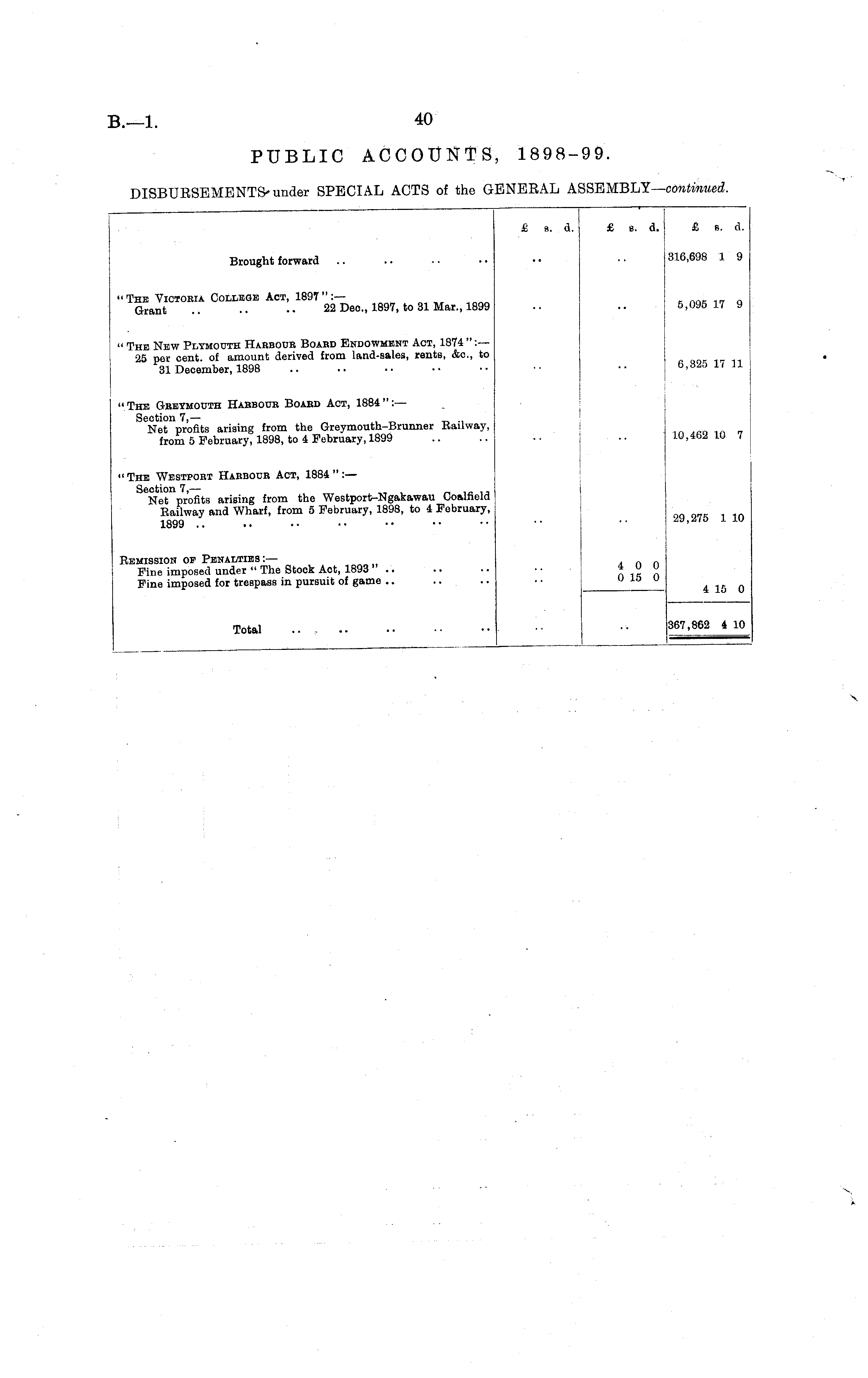 £ s. d. £ s. d. £ s. d. Brought forward 316,698 1 9 "The Victoria College Act, 1897": — Grant .. .. .. 22 Dec, 1897, to 31 Mar., 1899 5,095 17 9 " The New Plymouth Harbour Board Endowment Act, 1874 " :— 25 per cent, of amount derived from land-sales, rents, &c, to 31 December, 1898 6,325 17 11 " The Greymouth Harbour Board Act, 1884 ": — Section 7,— ., Net profits arising from the Greymouth-Brunner Railway, from 5 February, 1898, to 4 February, 1899 i 10,462 10 7 " The Westport Harbour Act, 1884 " :— Section 7, — , ,, Net profits arising from the Westport-Ngakawau Coalfield Railway and Wharf, from 5 February, 1898, to 4 February, 1899 .. 29,275 1 10 Remission of Penalties: — Fine imposed under " The Stock Act, 1893 " .. Fine imposed for trespass in pursuit of game 4 0 0 0 15 0 4 15 0 Total .. , 367,862 4 10