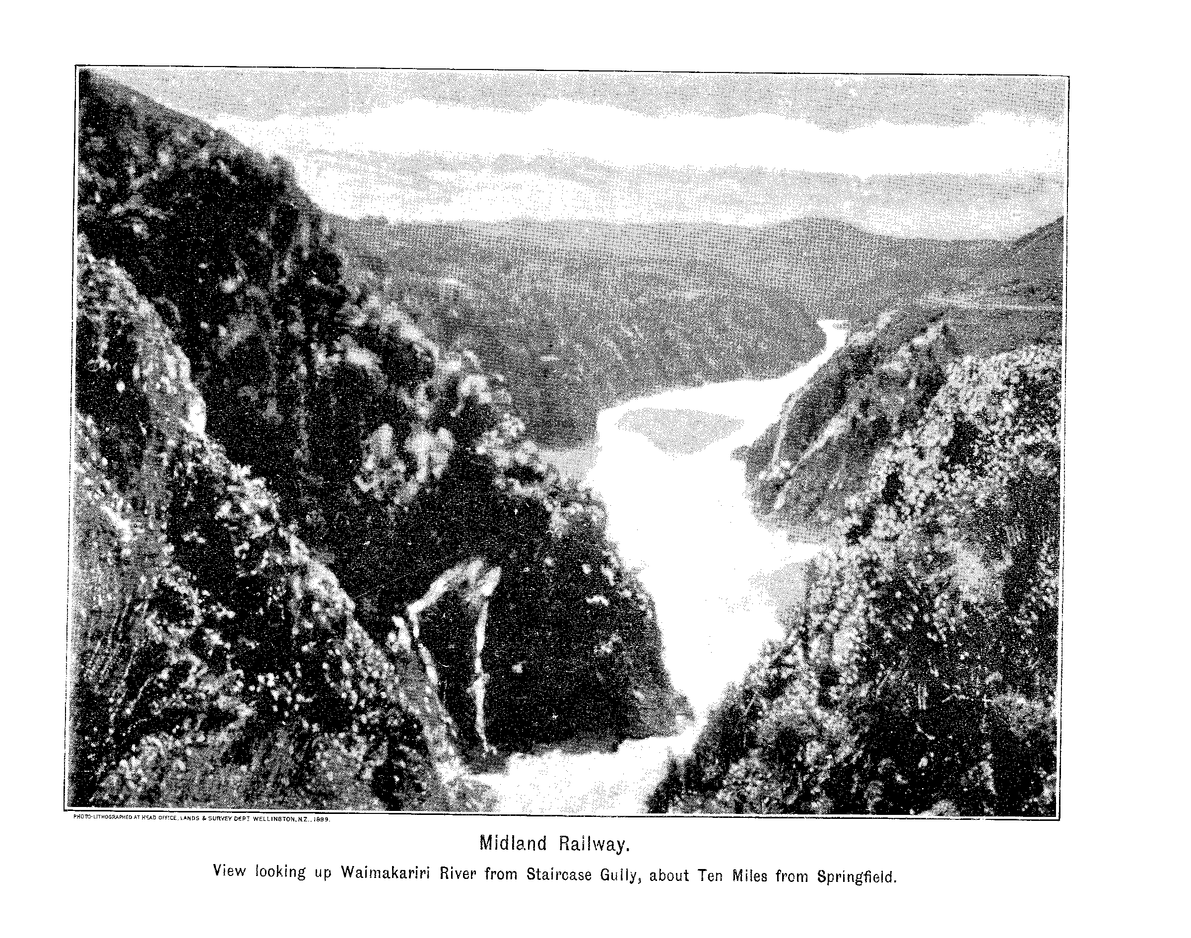 Midland Railway. View looking up Waimakariri River from Staircase Gully, about Ten Miles from Springfield.