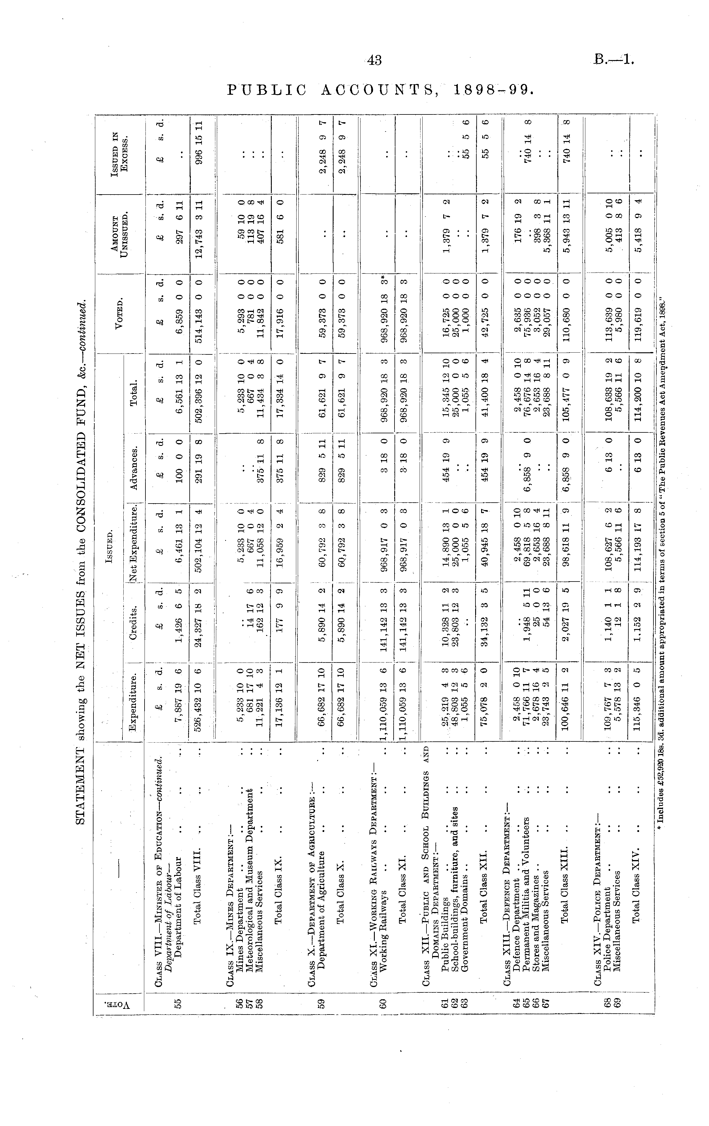 o > Expenditure, i Issued. Voted. Amount Unissued. Issued in Excess. Credits. Net Expenditure. 1 Advances. Total. Class VIII. —Minister of Education — continued. Department of Labour — Department of Labour .. ... .. £ s. d. £ s. d. £ s. d. 6,461 13 1 £ s. d. 100 0 0 £ s. d. 6,561 13 1 £ s. d. 6,859 0 0 £ s. d. 297 6 11 £ s. d. 55 7,887 19 6 1,426 6 5 Total Class VIII. .... 526,432 10 6 24,327 18 2 502,104 12 4 291 19 8 502,396 12 0 514,143 0 0 12,743 3 11 996 15 11 56 57 58 Class IX. —Mines Department :— Mines Department Meteorological and Museum Department Miscellaneous Services 5,233 10 0 681 17 10 11,221 4 3 14 17 6 162 12 3 j 5,233 10 0 667 0 4 11,058 12 0 375 11 8 5,233 10 0 667 0 4 11,434 3 8 5,293 0 0 781 0 0 11,842 0 0 59 10 0 113 19 8 407 16 4 Total Class IX. 17,136 12 1 177 9 9 16,959 2 4 375 11 8 17,334 14 0 17,916 0 0 581 6 0 Class X. —Department of Agriculture :— Department of Agriculture .. .. 5,890 14 2 60,792 3 8 829 5 11 61,621 9 7 59 66,682 17 10 59,373 0 0 2,248 9 7 Total Class X. 66,682 17 10 5,890 14 2 60,792 3 8 829 5 11 61,621 9 7 59,373 0 0 2,248 9 7 Class XI. —Working Railways Department :— Working Railways 60 |l, 110, 059 13 6 141,142 13 3 968,917 0 3 3 18 0 968,920 18 3 968,920 18 3* Total Class XI. 1,110,059 13 6 141,142 13 3 968,917 0 3 3 18 0 968,920 18 3 968,920 18 3 61 62 63 Class XII. —Public and School Buildings and Domains Department :— Public Buildings School-buildings, furniture, and sites Government Domains 25,219 4 3 48,803 12 3 1,055 5 6 10,328 11 2 23,803 12 3 14,890 13 1 25,000 0 0 1,055 5 6 454 19 9 15,345 12 10 25,000 0 0 1.055 5 6 16,725 0 0 25,000 0 0 1,000 0 0 1,379 7 2 55 5 6 Total Class XII. 75,078 2 0 34,132 3 5 40,945 18 7 454 19 9 41,400 18 4 42,725 0 0 1,379 7 2 55 5 6 64 65 66 67 Class XIII. —Defence Department: — Defence Department Permanent Militia and Volunteers Stores and Magazines Miscellaneous Services 2,458 0 10 71,766 11 7 2,678 16 4 23,743 2 5 1,948 5 11 25 0 0 54 13 6 2,458 0 10 69,818 5 8 2,653 16 4 23,688 8 11 6,858 9 0 2,458 0 10 76,676 14 8 2,653 16 4 23,688 8 11 2,635 0 0 75,936 0 0 3,052 0 0 29,057 0 0 176 19 2 740 14 8 398 3 8 5,368 11 1 Total Class XIII. .. 100,646 11 2 2,027 19 5 98,618 11 9 6,858 9 0 '• 105,477 0 9 110,680 0 0 5,943 13 11 740 14 8 Class XIV. —Police Department: — Police Department Miscellaneous Services 68 69 109,767 7 3 5,578 13 2 1,140 1 1 . 108,627 6 2 12 1 8 5,566 11 6 6 13 0 108,633 19 2 5,566 11 6 113,639 0 0 5,980 0 0 5,005 0 10 413 8 6 Total Class XIV. 1,152 2 9 114,193 17 8 j 115,346 0 5 6 13 0 114,200 10 8 119,619 0 0 5,418 9 4 * Includes £52,920 18s. 3d. additional amount appropriated in terms of section 5 of " The Public Revenues Aot Amendment Act, 1898."