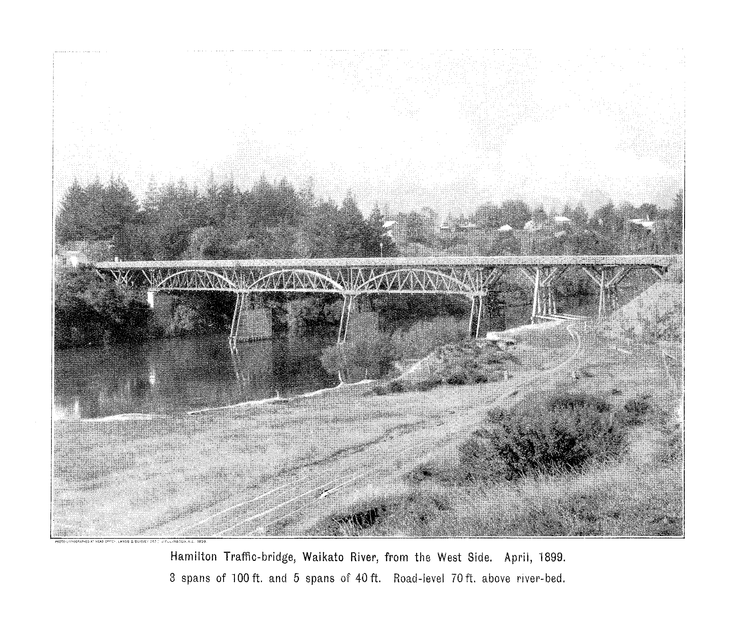 Hamilton Traffic-bridge, Waikato River, from the West Side. April, 1899. 3 spans of 100 ft. and 5 spans of 40ft. Road-level 70ft. above river-bed.