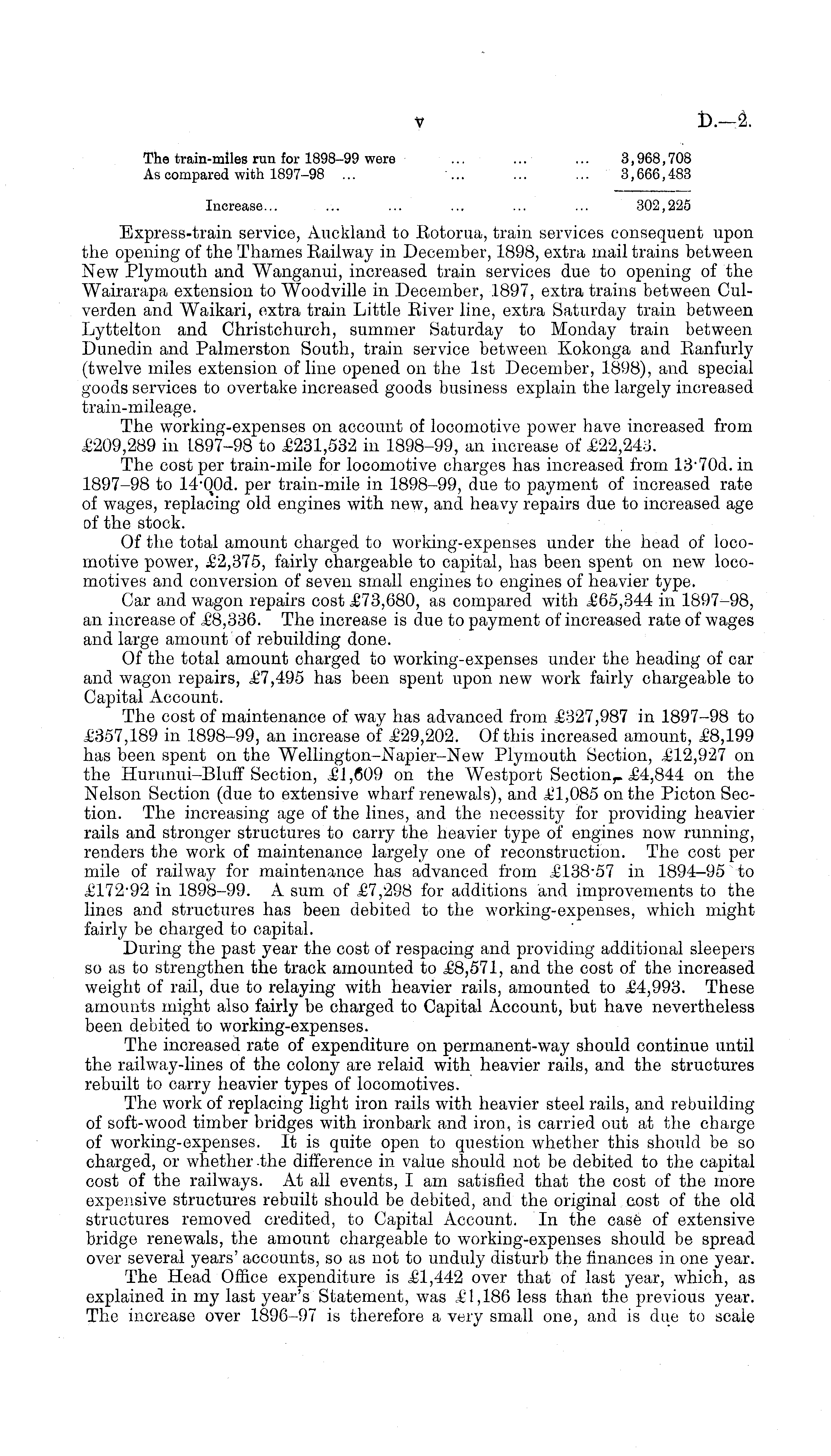 The train-miles run for 1898-99 were ... ... ... 3,968,708 As compared with 1897-98 ... ... ... ... 3,666,483 Increase... ... ... ... ... ... 302,225 Express-train service, Auckland to Eotorua, train services consequent upon the opening of the Thames Eailway in December, 1898, extra mail trains between New Plymouth and Wanganui, increased train services due to opening of the Wairarapa extension to Woodville in December, 1897, extra trains between Culverden and Waikari, extra train Little Eiver line, extra Saturday train between Lyttelton and Christchurch, summer Saturday to Monday train between Dunedin and Palmerston South, train service between Kokonga and Eanfurly (twelve miles extension of line opened on the Ist December, 1898), and special goods services to overtake increased goods business explain the largely increased train-mileage. The working-expenses on account of locomotive power have increased from £209,289 in 1897-98 to £231,532 in 1898-99, an increase of £22,243. The cost per train-mile for locomotive charges has increased from 13'70d. in 1897-98 to 14'OOd. per train-mile in 1898-99, due to payment of increased rate of wages, replacing old engines with new, and heavy repairs due to increased age of the stock. Of the total amount charged to working-expenses under the head of locomotive power, £2,375, fairly chargeable to capital, has been spent on new locomotives and conversion of seven small engines to engines of heavier type. Car and wagon repairs cost £73,680, as compared with £65,344 in 1897-98, an increase of £8,336. The increase is due to payment of increased rate of wages and large amount of rebuilding done. Of the total amount charged to working-expenses under the heading of car and wagon repairs, £7,495 has been spent upon new work fairly chargeable to Capital Account. The cost of maintenance of way has advanced from £327,987 in 1897-98 to £357,189 in 1898-99, an increase of £29,202. Of this increased amount, £8,199 has been spent on the Wellington-Napier-New Plymouth Section, £12,927 on the Hurunui-Bluff Section, £1,609 on the Westport Section,. £4,844 on the Nelson Section (due to extensive wharf renewals), and £1,085 on the Picton Section. The increasing age of the lines, and the necessity for providing heavier rails and stronger structures to carry the heavier type of engines now running, renders the work of maintenance largely one of reconstruction. The cost per mile of railway for maintenance has advanced from £13857 in 1894-95 to £172-92 in 1898-99. A sum of £7,298 for additions and improvements to the lines and structures has been debited to the working-expenses, which might fairly be charged to capital. During the past year the cost of respacing and providing additional sleepers so as to strengthen the track amounted to £8,571, and the cost of the increased weight of rail, due to relaying with heavier rails, amounted to £4,993. These amounts might also fairly be charged to Capital Account, but have nevertheless been debited to working-expenses. The increased rate of expenditure on permanent-way should continue until the railway-lines of the colony are relaid with heavier rails, and the structures rebuilt to carry heavier types of locomotives. The work of replacing light iron rails with heavier steel rails, and rebuilding of soft-wood timber bridges with ironbark and iron, is carried out at the charge of working-expenses. It is quite open to question whether this should be so charged, or whether the difference in value should not be debited to the capital cost of the railways. At all events, I am satisfied that the cost of the more expensive structures rebuilt should be debited, and the original cost of the old structures removed credited, to Capital Account. In the case of extensive bridge renewals, the amount chargeable to working-expenses should be spread over several years' accounts, so as not to unduly disturb the finances in one year. The Head Office expenditure is £1,442 over that of last year, which, as explained in my last year's Statement, was £1,186 less than the previous year. The increase over 1896-97 is therefore a very small one, and is due to scale