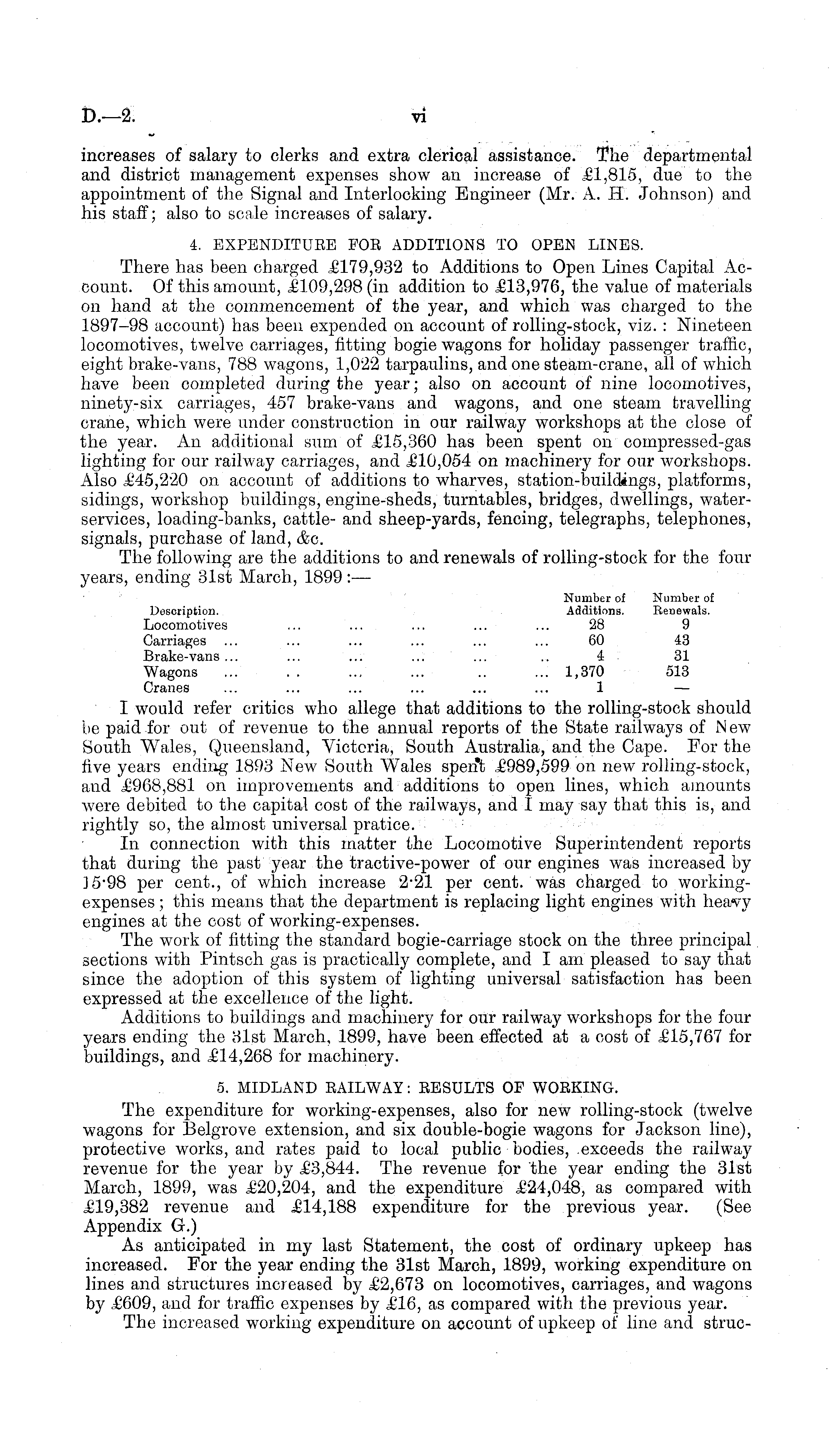 increases of salary to clerks and extra clerical assistance. The departmental and district management expenses show an increase of £1,815, due to the appointment of the Signal and Interlocking Engineer (Mr. A.. H. Johnson) and his staff; also to scale increases of salary. 4. EXPENDITDEE FOE ADDITIONS TO OPEN LINES. There has been charged £179,932 to Additions to Open Lines Capital Account. Of this amount, £109,298 (in addition to £13,976, the value of materials on hand at the commencement of the year, and which was charged to the 1897-98 account) has been expended on account of rolling-stock, viz. : Nineteen locomotives, twelve carnages, fitting bogie wagons for holiday passenger traffic, eight brake-vans, 788 wagons, 1,022 tarpaulins, and one steam-crane, ail of which have been completed during the year; also on account of nine locomotives, ninety-six carriages, 457 brake-vans and wagons, and one steam travelling crane, which were under construction in our railway workshops at the close of the year. An additional sum of £15,360 has been spent on compressed-gas lighting for our railway carriages, and £10,054 on machinery for our workshops. Also £45,220 on account of additions to wharves, station-buildings, platforms, sidings, workshop buildings, engine-sheds, turntables, bridges, dwellings, waterservices, loading-banks, cattle- and sheep-yards, fencing, telegraphs, telephones, signals, purchase of land, &c. The following are the additions to and renewals of rolling-stock for the four years, ending 31st March, 1899:— Number of Number of Description. Additions. Beuewals. Locomotives ... ... ... ... ... 28 9 Carriages ... ... ... ... ... ... 60 43 Brake-vans ... ... ... ... ... .. 4 31 Wagons 1,370 513 Cranes ... ... ... ... ... ... 1 — I would refer critics who allege that additions to the rolling-stock should be paid for out of revenue to the annual reports of the State railways of New South Wales, Queensland, Victoria, South Australia, and the Cape. For the five years ending 1893 New South Wales spent £989,599 on new rolling-stock, and £968,881 on improvements and additions to open lines, which amounts were debited to the capital cost of the railways, and I may say that this is, and rightly so, the almost universal pratice. In connection with this matter the Locomotive Superintendent reports that during the past year the tractive-power of our engines was increased by ]5"98 per cent., of which increase 2-21 per cent, was charged to workingexpenses ; this means that the department is replacing light engines with heavy engines at the cost of working-expenses. The work of fitting the standard bogie-carriage stock on the three principal sections with Pintsch gas is practically complete, and I am pleased to say that since the adoption of this system of lighting universal satisfaction has been expressed at the excellence of the light. Additions to buildings and machinery for our railway workshops for the four years ending the 31st March, 1899, have been effected at a cost of £15,767 for buildings, and £14,268 for machinery. 5. MIDLAND EAILWAY: EESULTS OF WOEKING. The expenditure for working-expenses, also for new rolling-stock (twelve wagons for Belgrove extension, and six double-bogie wagons for Jackson line), protective works, and rates paid to local public bodies, exceeds the railway revenue for the year by £3,844. The revenue for the year ending the 31st March, 1899, was £20,204, and the expenditure £24,048, as compared with £19,382 revenue and £14,188 expenditure for the previous year. (See Appendix G.) As anticipated in my last Statement, the cost of ordinary upkeep has increased. For the year ending the 31st March, 1899, working expenditure on lines and structures increased by £2,673 on locomotives, carriages, and wagons by £609, and for traffic expenses by £16, as compared with the previous year. The increased working expenditure on account of upkeep of line and struc-