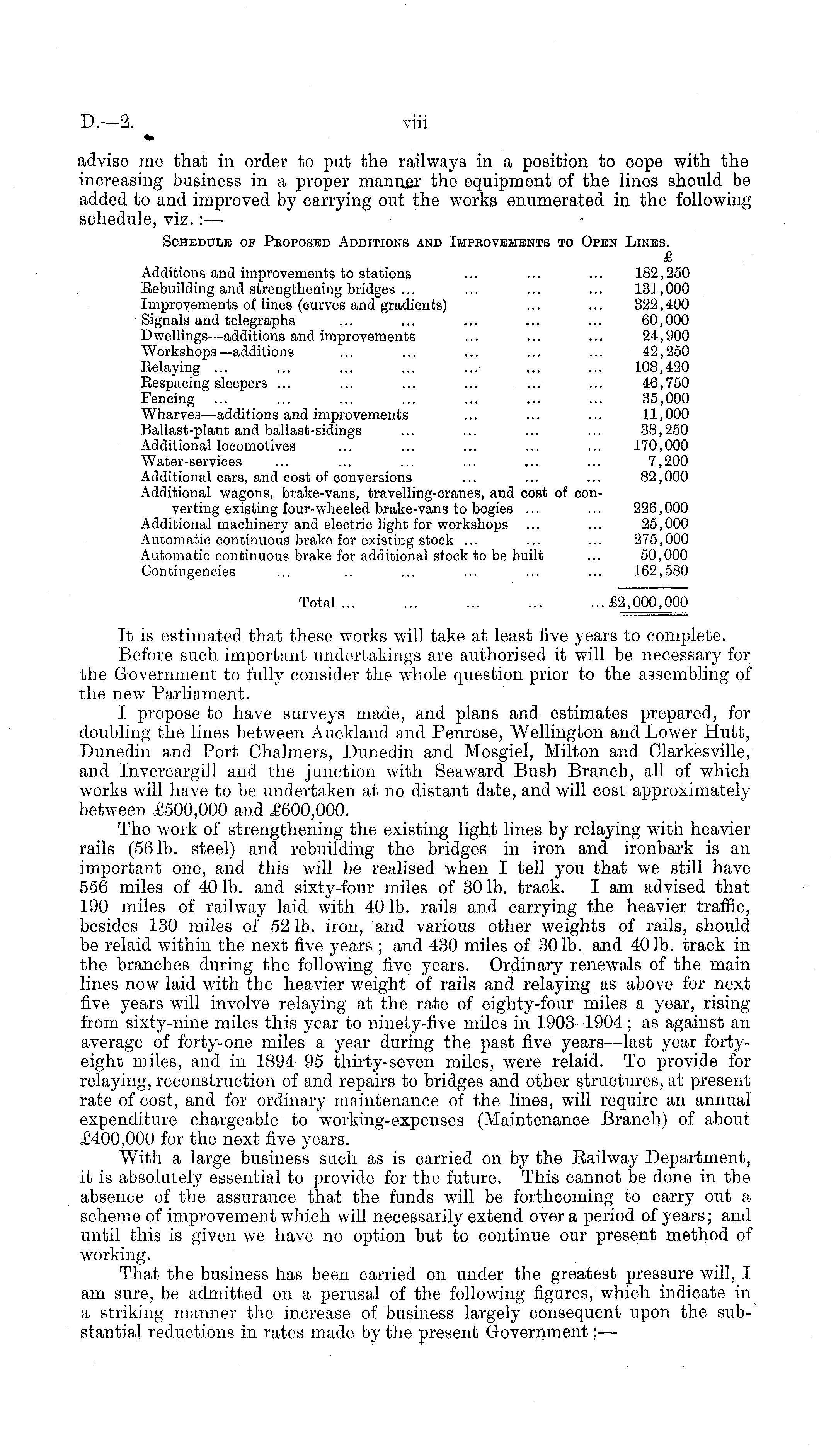 advise me that in order to put the railways in a position to cope with the increasing business in a proper manner the equipment of the lines should be added to and improved by carrying out the works enumerated in the following schedule, viz.:— Schedule op Proposed Additions and Improvements to Open Lines. £ Additions and improvements to stations ... ... ... 182,250 Eebuilding and strengthening bridges ... ... ... ... 131,000 Improvements of lines (curves and gradients) ... ... 322,400 Signals and telegraphs ... ... ... ... ... 60,000 Dwellings—additions and improvements ... ... ... 24,900 Workshops—additions ... ... ... ... ... 42,250 Belaying ... ... ... ... ... ... ... 108,420 Eespacing sleepers ... ... ... ... ... ... 46,750 Fencing ... ... ... ... ... ... ... 35,000 Wharves—additions and improvements ... ... ... 11,000 Ballast-plant and ballast-sidings ... ... ... ... 38,250 Additional locomotives ... ... ... ... ... 170,000 Water-services ... ... ... ... ... ... 7,200 Additional cars, and cost of conversions ... ... ... 82,000 Additional wagons, brake-vans, travelling-cranes, and cost of converting existing four-wheeled brake-vans to bogies ... ... 226,000 Additional machinery and electric light for workshops ... ... 25,000 Automatic continuous brake for existing stock ... ... ... 275,000 Automatic continuous brake for additional stock to be built ... 50,000 Contingencies ... .. ... ... ... ... 162,580 Total... ... ... ... ... £2,000,000 It is estimated that these works will take at least five years to complete. Before such important undertakings are authorised it will be necessary for the Government to fully consider the whole question prior to the assembling of the new Parliament. I propose to have surveys made, and plans and estimates prepared, for doubling the lines between jAuckland and Penrose, Wellington and Lower Hutt, Dunedin and Port Chalmers, Dunedin and Mosgiel, Milton and Clarkesville, and Invercargill and the junction with Seaward Bush Branch, all of which works will have to be undertaken at no distant date, and will cost approximately between £500,000 and £600,000. The work of strengthening the existing light lines by relaying with heavier rails (561b. steel) and rebuilding the bridges in iron and ironbark is an important one, and this will be realised when I tell you that we still have 556 miles of 40 lb. and sixty-four miles of 30 lb. track. lam advised that 190 miles of railway laid with 40 lb. rails and carrying the heavier traffic, besides 130 miles of 52 lb. iron, and various other weights of rails, should be relaid within the next five years ; and 430 miles of 301b. and 401b. track in the branches during the following five years. Ordinary renewals of the main lines now laid with the heavier weight of rails and relaying as above for next five years will involve relaying at the rate of eighty-four miles a year, rising from sixty-nine miles this year to ninety-five miles in 1903-1904; as against an average of forty-one miles a year during the past five years —last year fortyeight miles, and in 1894-95 thirty-seven miles, were relaid. To provide for relaying, reconstruction of and repairs to bridges and other structures, at present rate of cost, and for ordinary maintenance of the lines, will require an annual expenditure chargeable to working-expenses (Maintenance Branch) of about £400,000 for the next five years. With a large business such as is carried on by the Eailway Department, it is absolutely essential to provide for the future; This cannot be done in the absence of the assurance that the funds will be forthcoming to carry out a scheme of improvement which will necessarily extend over a period of years; and until this is given we have no option but to continue our present method of working. That the business has been carried on under the greatest pressure will, I am sure, be admitted on a perusal of the following figures, which indicate in a striking manner the increase of business largely consequent upon the substantial reductions in rates made by the present Government; —