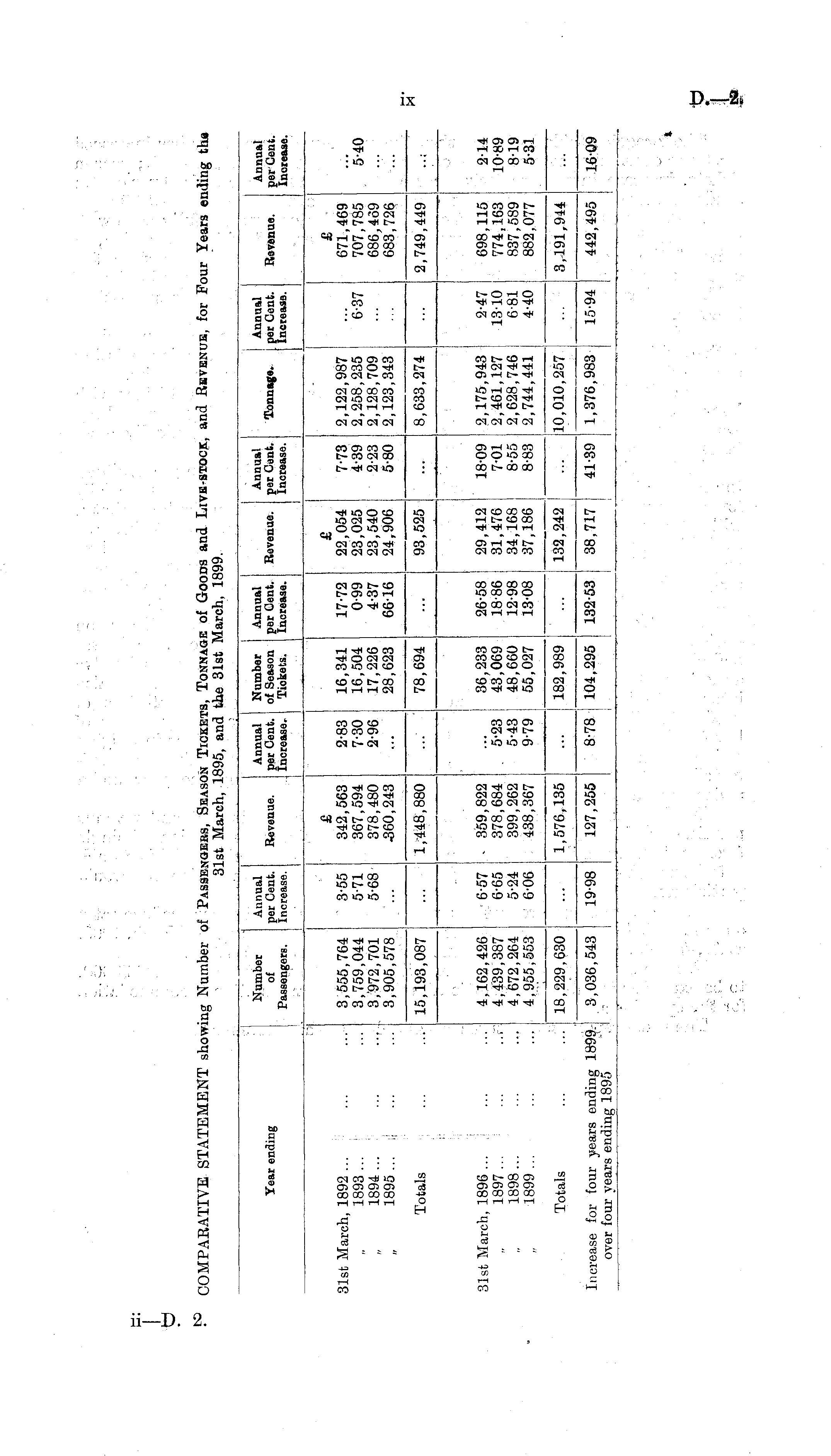 COMPARATIVE STATEMENT showing Number of Passengers, Season Tickets, Tonnage of Goods and Live-stock, and Revenue, for Four Years ending the 31st March, 1895, and the 31st March, 1899.