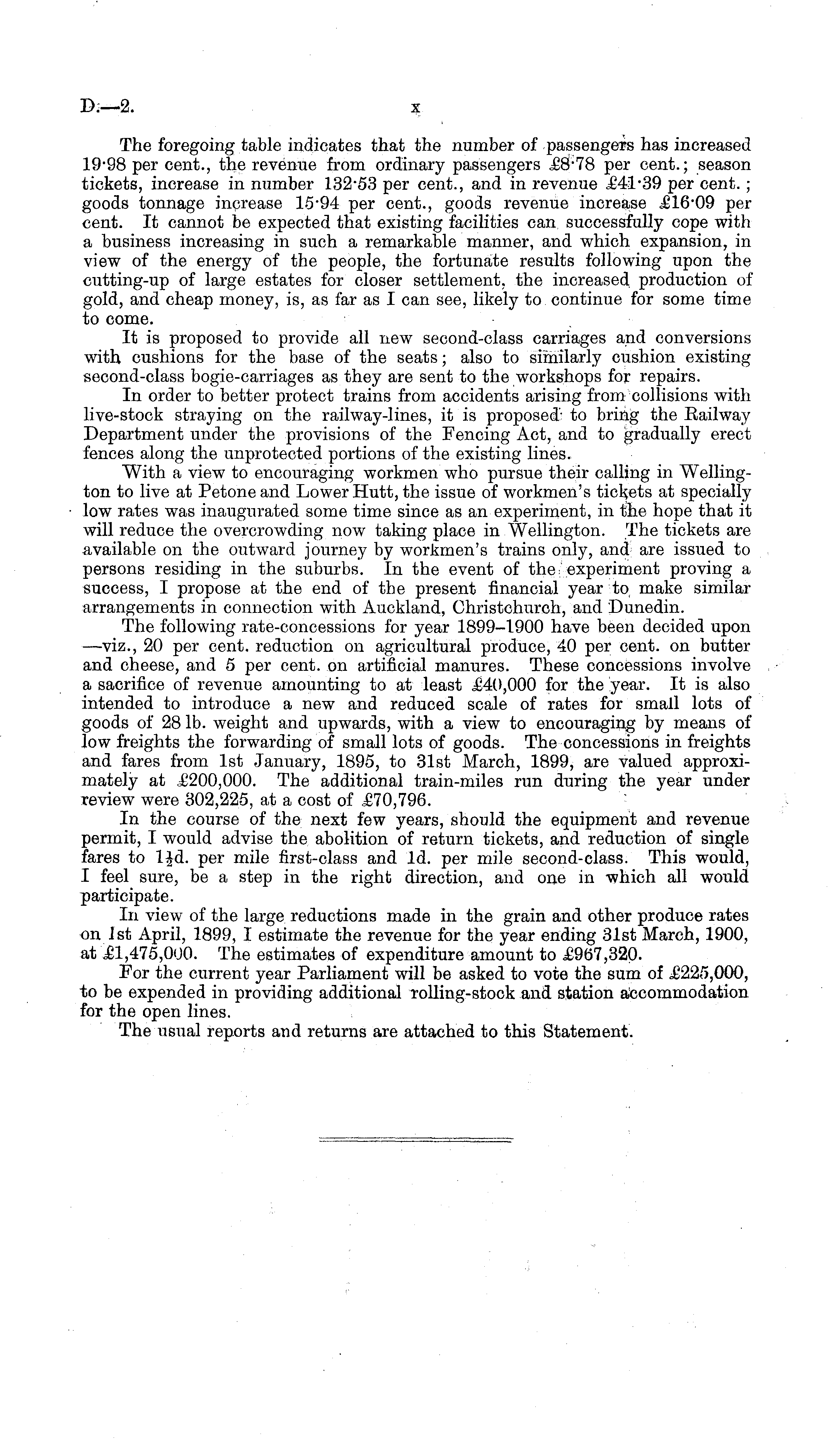 The foregoing table indicates that the number of passengers has increased 19-98 per cent., the revenue from ordinary passengers £8-78 per cent.; season tickets, increase in number 132-53 per cent., and in revenue £41-39 per cent. ; goods tonnage increase 15*94 per cent., goods revenue increase £16-09 per cent. It cannot be expected that existing facilities can successfully cope with a business increasing in such a remarkable manner, and which expansion, in view of the energy of the people, the fortunate results following upon the cutting-up of large estates for closer settlement, the increased production of gold, and cheap money, is, as far as I can see, likely to continue for some time to come. It is proposed to provide all new second-class carriages and conversions with cushions for the base of the seats; also to similarly cushion existing second-class bogie-carriages as they are sent to the workshops for repairs. In order to better protect trains from accidents arising from collisions with live-stock straying on the rail way-lines, it is proposed to bring the Eailway Department under the provisions of the Fencing Act, and to gradually erect fences along the unprotected portions of the existing lines. With a view to encouraging workmen who pursue their calling in Wellington to live at Petone and Lower Hutt, the issue of workmen's tickets at specially low rates was inaugurated some time since as an experiment, in the hope that it will reduce the overcrowding now taking place in Wellington. The tickets are available on the outward journey by workmen's trains only, and are issued to persons residing in the suburbs. In the event of the experiment proving a success, I propose at the end of the present financial year to, make similar arrangements in connection with Auckland, Christchurch, and Dunedin. The following rate-concessions for year 1899-1900 have been decided upon —viz., 20 per cent, reduction on agricultural produce, 40 per cent, on butter and cheese, and 5 per cent, on artificial manures. These concessions involve a sacrifice of revenue amounting to at least £40,000 for the year. It is also intended to introduce a new and reduced scale of rates for small lots of goods of 28 lb. weight and upwards, with a view to encouraging by means of low freights the forwarding of small lots of goods. The concessions in freights and fares from Ist January, 1895, to 31st March, 1899, are valued approximately at £200,000. The additional train-miles run during the year under review were 302,225, at a cost of £70,796. " In the course of the next few years, should the equipment and revenue permit, I would advise the abolition of return tickets, and reduction of single fares to ljd. per mile first-class and Id. per mile second-class. This would, I feel sure, be a step in the right direction, and one in which all would participate. In view of the large reductions made in the grain and other produce rates on Ist April, 1899, I estimate the revenue for the year ending 31st March, 1900, at £1,475,000. The estimates of expenditure amount to £967,320. For the current year Parliament will be asked to vote the sum of £225,000, to be expended in providing additional rolling-stock and station accommodation for the open lines. The usual reports and returns are attached to this Statement.