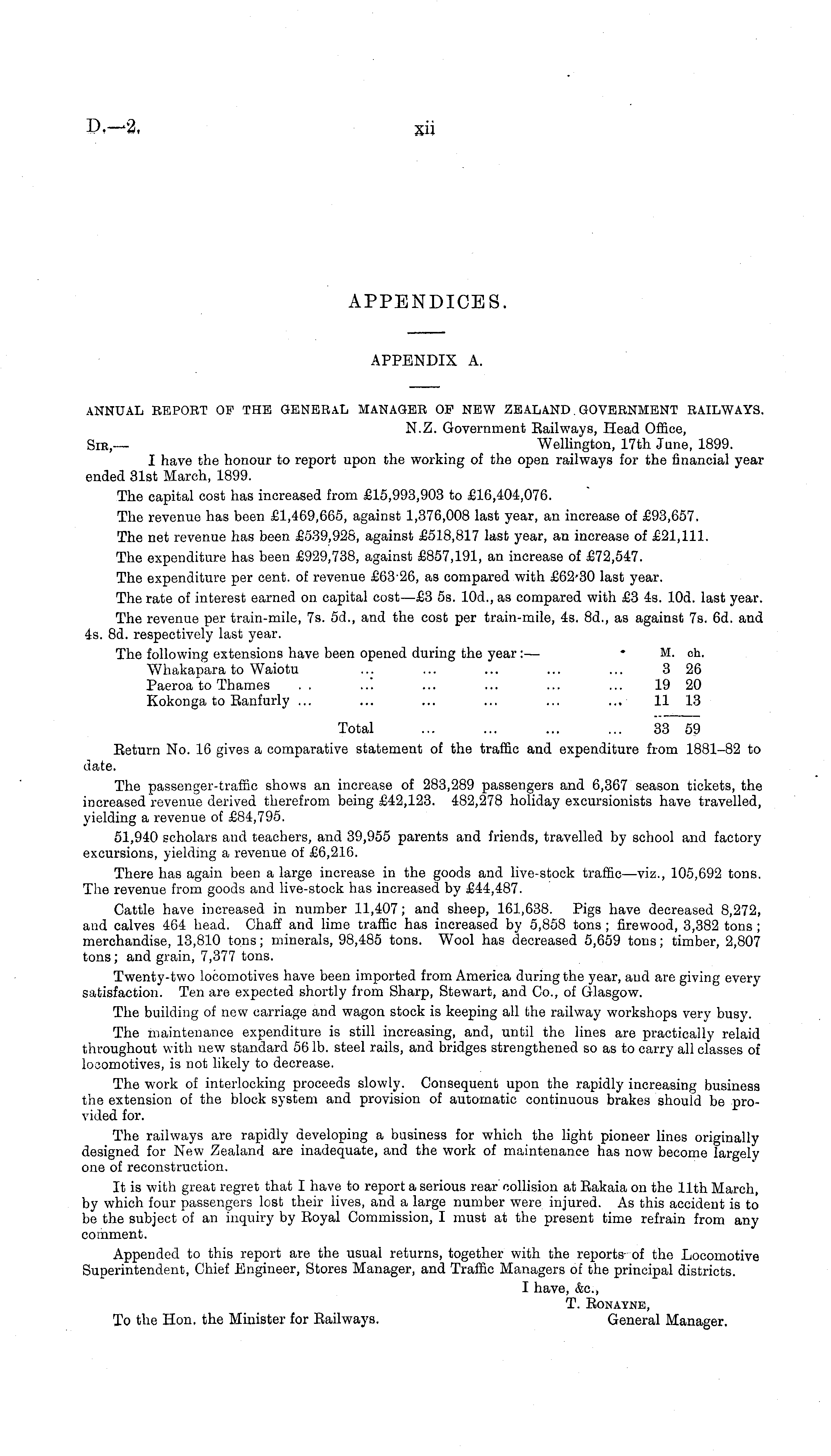 ANNUAL REPORT OF THE GENERAL MANAGER OF NEW ZEALAND. GOVERNMENT RAILWAYS. N.Z. Government Eailways, Head Office, Sib,— Wellington, 17th June, 1899. I have the honour to report upon the working of the open railways for the financial year ended 31st March, 1899. The capital cost has increased from £15,993,903 to £16,404,076. The revenue has been £1,469,665, against 1,376,008 last year, an increase of £93,657. The net revenue has been £539,928, against £518,817 last year, an increase of £21,111. The expenditure has been £929,738, against £857,191, an increase of £72,547. The expenditure per cent, of revenue £6326, as compared with £62-30 last year. The rate of interest earned on capital cost—£3 ss. 10d., as compared with £3 4s. lOd. last year. The revenue per train-mile, 7s. 5d., and the cost per train-mile, 4s. Bd., as against 7s. 6d. and 4s. Bd. respectively last year. The following extensions have been opened during the year:— * M. oh. Whakapara to Waiotu ... ... ... ... ... 3 26 Paeroa to Thames .. ..'. ... ... ... ... 19 20 Kokonga to Eanfurly ... ... ... ... ... ... 11 13 Total ... ... ... ... 33 59 Eeturn No. 16 gives a comparative statement of the traffic and expenditure from 1881-82 to date. The passenger-traffic shows an increase of 283,289 passengers and 6,367 season tickets, the increased revenue derived therefrom being £42,123. 482,278 holiday excursionists have travelled, yielding a revenue of £84,795. 51,940 scholars and teachers, and 39,955 parents and friends, travelled by school and factory excursions, yielding a revenue of £6,216. There has again been a large increase in the goods and live-stock traffic—viz., 105,692 tons. The revenue from goods and live-stock has increased by £44,487. Cattle have increased in number 11,407; and sheep, 161,638. Pigs have decreased 8,272, and calves 464 head. Chaff and lime traffic has increased by 5,858 tons ; firewood, 3,382 tons; merchandise, 13,810 tons; minerals, 98,485 tons. Wool has decreased 5,659 tons; timber, 2,807 tons; and grain, 7,377 tons. Twenty-two locomotives have been imported from America during the year, and are giving every satisfaction. Ten are expected shortly from Sharp, Stewart, and Co., of Glasgow. The building of new carriage and wagon stock is keeping all the railway workshops very busy. The maintenance expenditure is still increasing, and, until the lines are practically relaid throughout with new standard 56 lb. steel rails, and bridges strengthened so as to carry all classes of locomotives, is not likely to decrease. The work of interlocking proceeds slowly. Consequent upon the rapidly increasing business the extension of the block system and provision of automatic continuous brakes should be provided for. The railways are rapidly developing a business for which the light pioneer lines originally designed for New Zealand are inadequate, and the work of maintenance has now become largely one of reconstruction. It is with great regret that I have to report a serious rear collision at Eakaia on the 11th March, by which four passengers lost their lives, and a large number were injured. As this accident is to be the subject of an inquiry by Eoyal Commission, I must at the present time refrain from any comment. Appended to this report are the usual returns, together with the reports of the Locomotive Superintendent, Chief Engineer, Stores Manager, and Traffic Managers of the principal districts. I have, &c, T. Eonayne, To the Hon. the Minister for Eailways. General Manager,