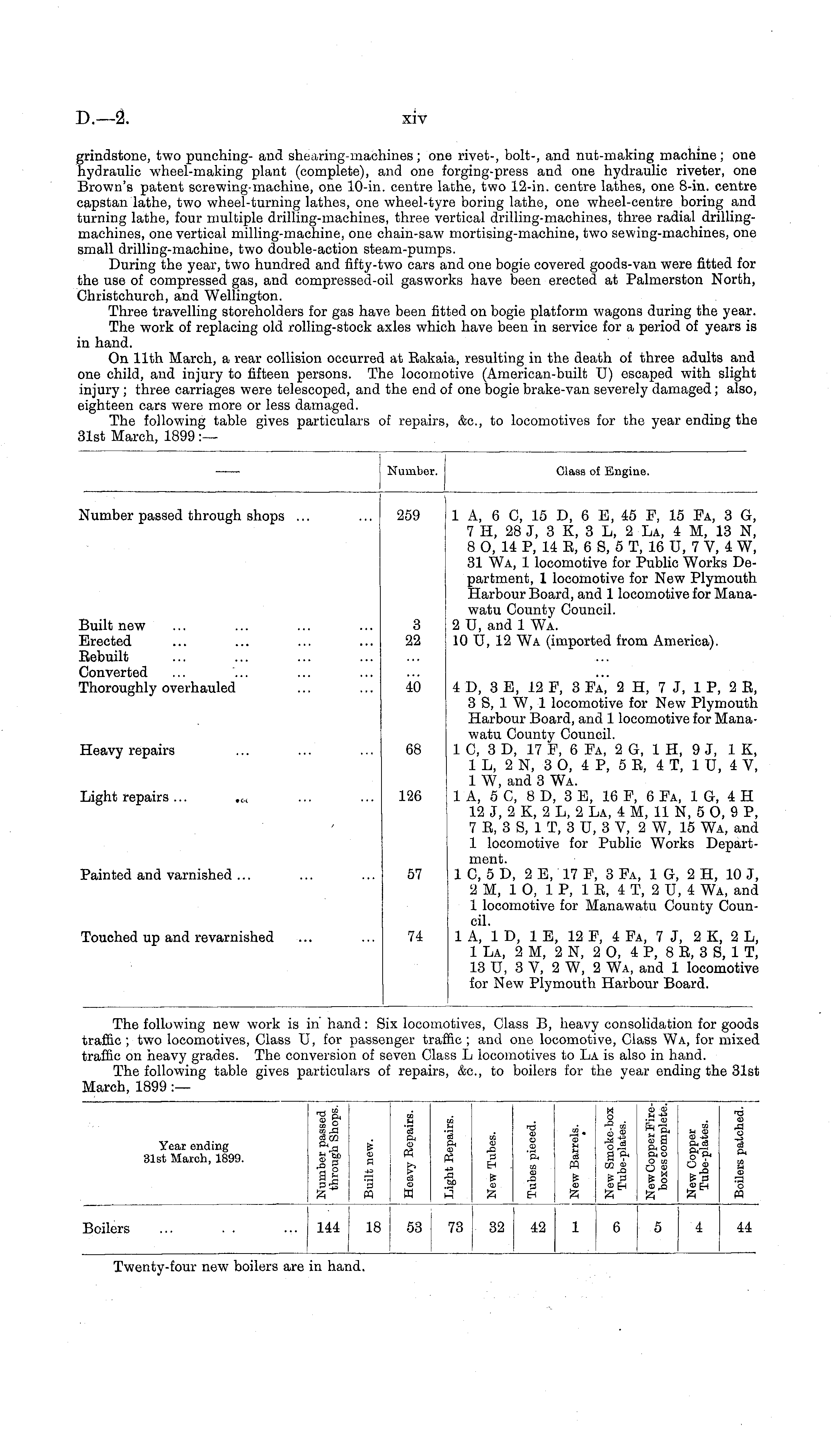 grindstone, two punching- and shearing-machines; one rivet-, bolt-, and nut-making machine; one hydraulic wheel-making plant (complete), and one forging-press and one hydraulic riveter, one Brown's patent screwing- machine, one 10-in. centre lathe, two 12-in. centre lathes, one 8-in. centre capstan lathe, two wheel-turning lathes, one wheel-tyre boring lathe, one wheel-centre boring and turning lathe, four multiple drilling-machines, three vertical drilling-machines, three radial drillingmachines, one vertical milling-machine, one chain-saw mortising-machine, two sewing-machines, one small drilling-machine, two double-action steam-pumps. During the year, two hundred and fifty-two cars and one bogie covered goods-van were fitted for the use of compressed gas, and compressed-oil gasworks have been erected at Palmerston North, Christchureh, and Wellington. Three travelling storeholders for gas have been fitted on bogie platform wagons during the year. The work of replacing old rolling-stock axles which have been in service for a period of years is in hand. On 11th March, a rear collision occurred at Eakaia, resulting in the death of three adults and one child, and injury to fifteen persons. The locomotive (American-built U) escaped with slight injury; three carriages were telescoped, and the end of one bogie brake-van severely damaged; also, eighteen cars were more or less damaged. The following table gives particulars of repairs, &c, to locomotives for the year ending the 31st March, 1899 :—