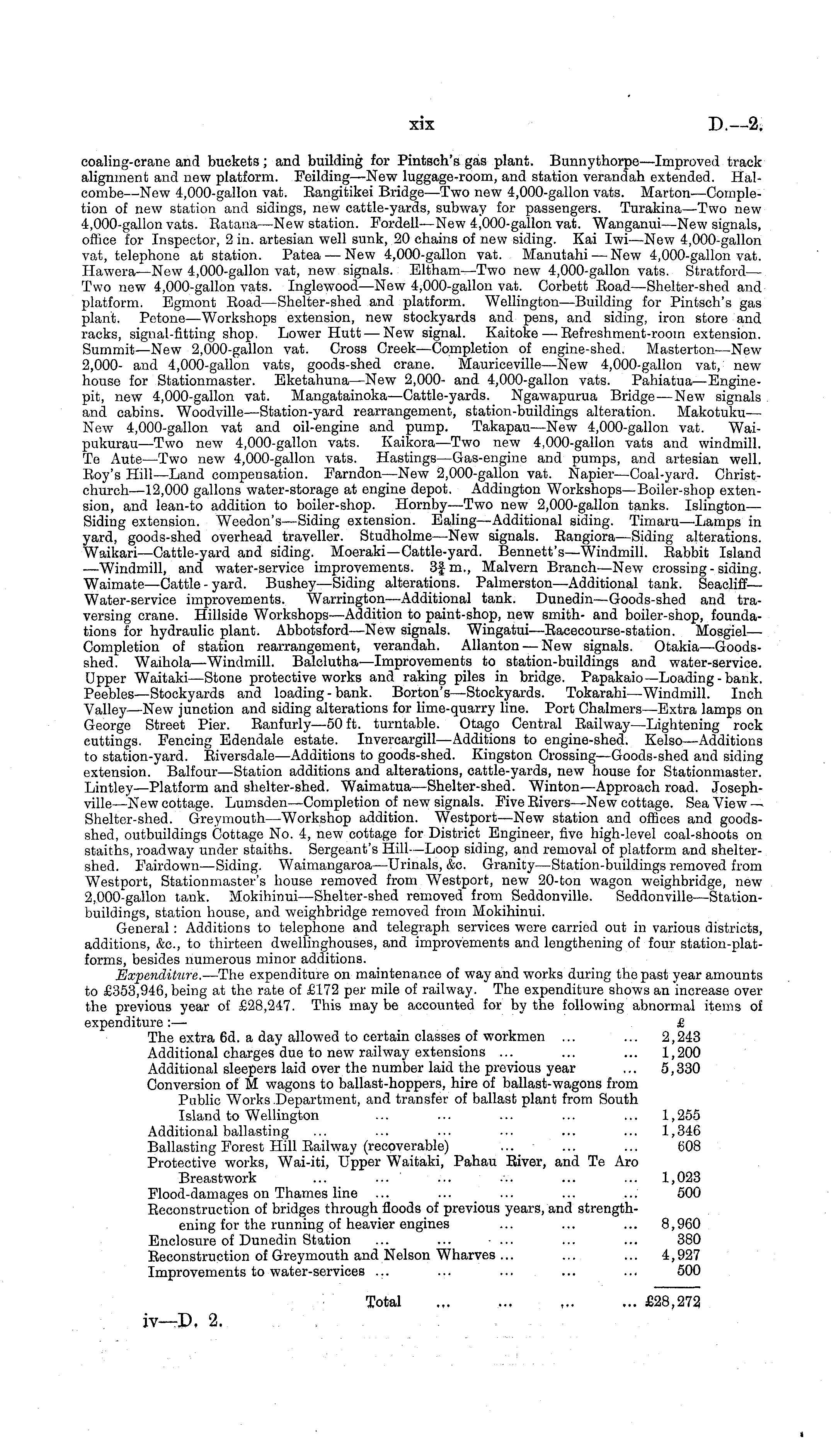 coaling-crane and buckets; and building for Pintseh's gas plant. Bunnythorpe—lmproved track alignment and new platform. Feilding—New luggage-room, and station verandah extended. Halcombe—New 4,000-gallon vat. Eangitikei Bridge—Two new 4,000-gallon vats. Marton—Completion of new station and sidings, new cattle-yards, subway for passengers. Turakina—Two new 4,000-gallon vats. Eatana —New station. Fordell —New 4,000-gallon vat. Wanganui—New signals, office for Inspector, 2 in. artesian well sunk, 20 chains of new siding. Kai Iwi—New 4,000-gallon vat, telephone at station. Patea — New 4,000-gallon vat. Manutahi — New 4,000-gallon vat. Hawera —New 4,000-gallon vat, new signals. Eltham—Two new 4,000-gallon vats. Stratford— Two new 4,000-gallon vats. Inglewood.—New 4,000-gallon vat. Corbett Eoad—Shelter-shed and platform. Egmont Eoad —Shelter-shed and platform. Wellington—Building for Pintseh's gas plant. Petone—Workshops extension, new stockyards and pens, and siding, iron store and racks, signal-fitting shop, Lower Hutt — New signal. Kaitoke — Eefreshment-room extension. Summit—New 2,000-gallon vat. Cross Creek—Completion of engine-shed. Masterton—New 2,000- and 4,000-gallon vats, goods-shed crane. Mauriceville—New 4,000-gallon vat, new house for Stationmaster. Eketahuna —New 2,000- and 4,000-gallon vats. Pahiatua—Enginepit, new 4,000-gallon vat. Mangatainoka—Cattle-yards. Ngawapurua Bridge—New signals and cabins. Woodville—Station-yard rearrangement, station-buildings alteration. Makotuku— New 4,000-gallon vat and oil-engine and pump. Takapau—New 4,000-gallon vat. Waipukurau—Two new 4,000-gallon vats. Kaikora—Two new 4,000-gallon vats and windmill. Te Aute—Two new 4,000-gallon vats. Hastings —Gas-engine and pumps, and artesian well. Eoy's Hill—Land compensation. Farndon—New 2,000-gallon vat. Napier—Coal-yard. Christchurch—l2,ooo gallons water-storage at engine depot. Addington Workshops—Boiler-shop extension, and lean-to addition to boiler-shop. Hornby—Two new 2,000-gallon tanks. Islington— Siding extension. Weedon's —Siding extension. Ealing—Additional siding. Timaru—Lamps in yard, goods-shed overhead traveller. Studholme —New signals. Eangiora—Siding alterations. Waikari—Cattle-yard and siding. Moeraki—Cattle-yard. Bennett's—Windmill. Babbit Island —Windmill, and water-service improvements. 3f m., Malvern Branch—New crossing - siding. Waimate—Cattle-yard. Bushey—Siding alterations. Palmerston—Additional tank. Seacliff— Water-service improvements. Warrington—Additional tank. Dunedin—Goods-shed and traversing crane. Hillside Workshops—Addition to paint-shop, new smith- and boiler-shop, foundations for hydraulic plant. Abbotsford —New signals. Wingatui—Eacecourse-station. Mosgiel— Completion of station rearrangement, verandah. Allanton — New signals. Otakia—Goodsshed. Waihola—Windmill. Balclutha—lmprovements to station-buildings and water-service. Upper Waitaki —Stone protective works and raking piles in bridge. Papakaio—Loading-bank. Peebles —Stockyards and loading-bank. Borton's —Stockyards. Tokarahi—Windmill. Inch Valley —New junction and siding alterations for lime-quarry line. Port Chalmers—Extra lamps on George Street Pier. Eanfurly—so ft. turntable. Otago Central Eailway—Lightening rock cuttings. Fencing Edendale estate. Invercargill—Additions to engine-shed. Kelso—Additions to station-yard. Eiversdale —Additions to goods-shed. Kingston Crossing—Goods-shed and siding extension. Balfour—-Station additions and alterations, cattle-yards, new house for Stationmaster. Lintley—Platform and shelter-shed. Waimatua —Shelter-shed. Winton—Approach road. Joseph-ville—-New cottage. Lumsden —Completion of new signals. FiveEivers—New cottage. Sea View — Shelter-shed. Greymouth —Workshop addition. Westport—New station and offices and goodsshed, outbuildings Cottage No. 4, new cottage for District Engineer, five high-level coal-shoots on staiths, roadway under staiths. Sergeant's Hill—Loop siding, and removal of platform and sheltershed. Fairdown —Siding. Waimangaroa—Urinals, &c. Granity—Station-buildings removed from Westport, Stationmaster's house removed from Westport, new 20-ton wagon weighbridge, new 2,000-gallon tank. Mokihinui —Shelter-shed removed from Seddonville. Seddonville—Stationbuildings, station house, and weighbridge removed from Mokihinui. General: Additions to telephone and telegraph services were carried out in various districts, additions, &c, to thirteen dwellinghouses, and improvements and lengthening of four station-plat-forms, besides numerous minor additions. Expenditure. —The expenditure on maintenance of way and works during the past year amounts to £353,946, being at the rate of £172 per mile of railway. The expenditure shows an increase over the previous year of £28,247. This may be accounted for by the following abnormal items of expenditure : — £ The extra 6d. a day allowed to certain classes of workmen ... ... 2,243 Additional charges due to new railway extensions ... ... ... 1,200 Additional sleepers laid over the number laid the previous year ... 5,330 Conversion of M wagons to ballast-hoppers, hire of ballast-wagons from Public Works Department, and transfer of ballast plant from South Island to Wellington ... ... ... ... ... 1,255 Additional ballasting ... ... ... ... ... ... 1,346 Ballasting Forest Hill Eailway (recoverable) ... ... ... 608 Protective works, Wai-iti, Upper Waitaki, Pahau Eiver, and Te Aro Breastwork ... ... ... ... ... ... 1,023 Flood-damages on Thames line ... ... ... ... ... 500 Eeconstruction of bridges through floods of previous years, and strengthening for the running of heavier engines ... ... ... 8,960 Enclosure of Dunedin Station ... ... - ... ... ... 380 Eeconstruction of Greymouth and Nelson Wharves ... ... ... 4,927 Improvements to water-se
