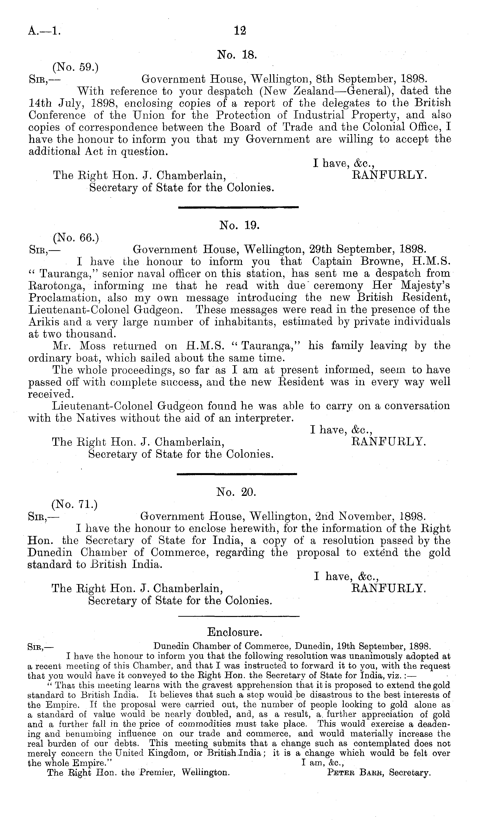 No. 20. (No. 71.) Sic, — Government House, Wellington, 2nd November, 1898. I have the honour to enclose herewith, for the information of the Right Hon. the Secretary of State for India, a copy of a resolution passed by the Dunedin Chamber of Commerce, regarding the proposal to extend the gold standard to British India. I have, &c, The Right Hon. J. Chamberlain, RANFURLY. Secretary of State for the Colonies.