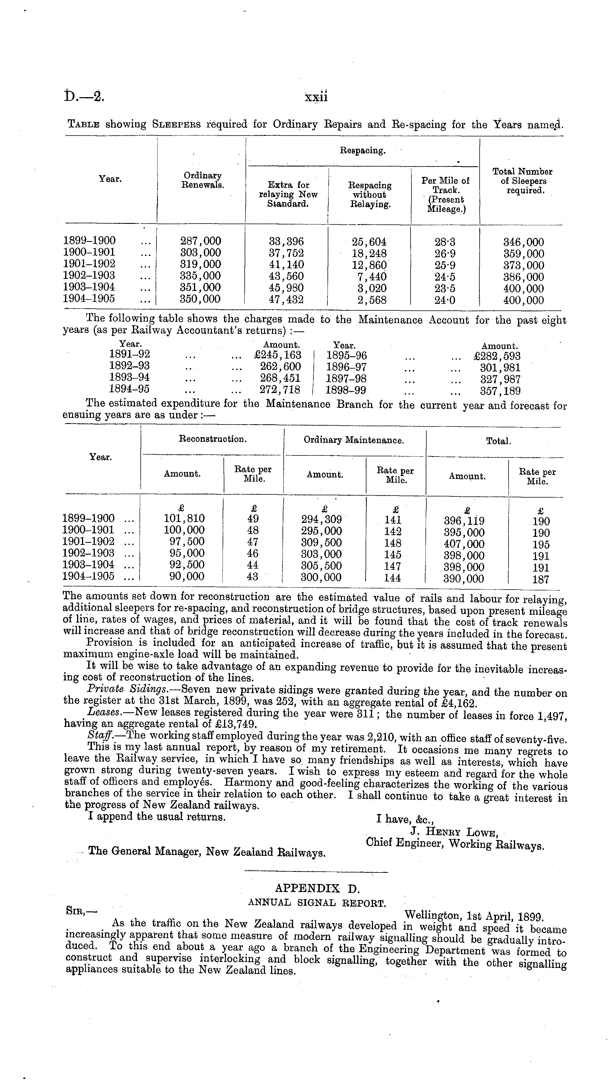 The amounts set down for reconstruction are the estimated value of rails and labour for relaying, additional sleepers for re-spacing, and reconstruction of bridge structures, based upon present mileage of line, rates of wages, and prices of material, and it will be found that the cost of track renewals will increase and that of bridge reconstruction will decrease during the years included in the forecast. Provision is included for an anticipated increase of traffic, but it is assumed that the present maximum engine-axle load will be maintained. It will be wise to take advantage of an expanding revenue to provide for the inevitable increasing cost of reconstruction of the lines. Private Sidings.—Seven new private sidings were granted during the year, and the number on the register at the 31st March, 1899, was 252, with an aggregate rental of £4,162. Leases.—New leases registered during the year were 311; the number of leases in force 1 497 having an aggregate rental of £13,749. Staff— The working staff employed during the year was 2,210, with an office staff of seventy-five. This is my last annual report, by reason of my retirement. It occasions me many regrets to leave the Eailway service, in which I have so many friendships as well as interests, "which have grown strong during twenty-seven years. I wish to express my esteem and regard for the whole staff of officers and employes. Harmony and good-feeling characterizes the working of the various branches of the service in their relation to each other. I shall continue to take a great interest in the progress of New Zealand railways. I append the usual returns. I have, &c, J. Henev Lowe, The General Manager, New Zealand Eailways. Wopking Eailwa y s '