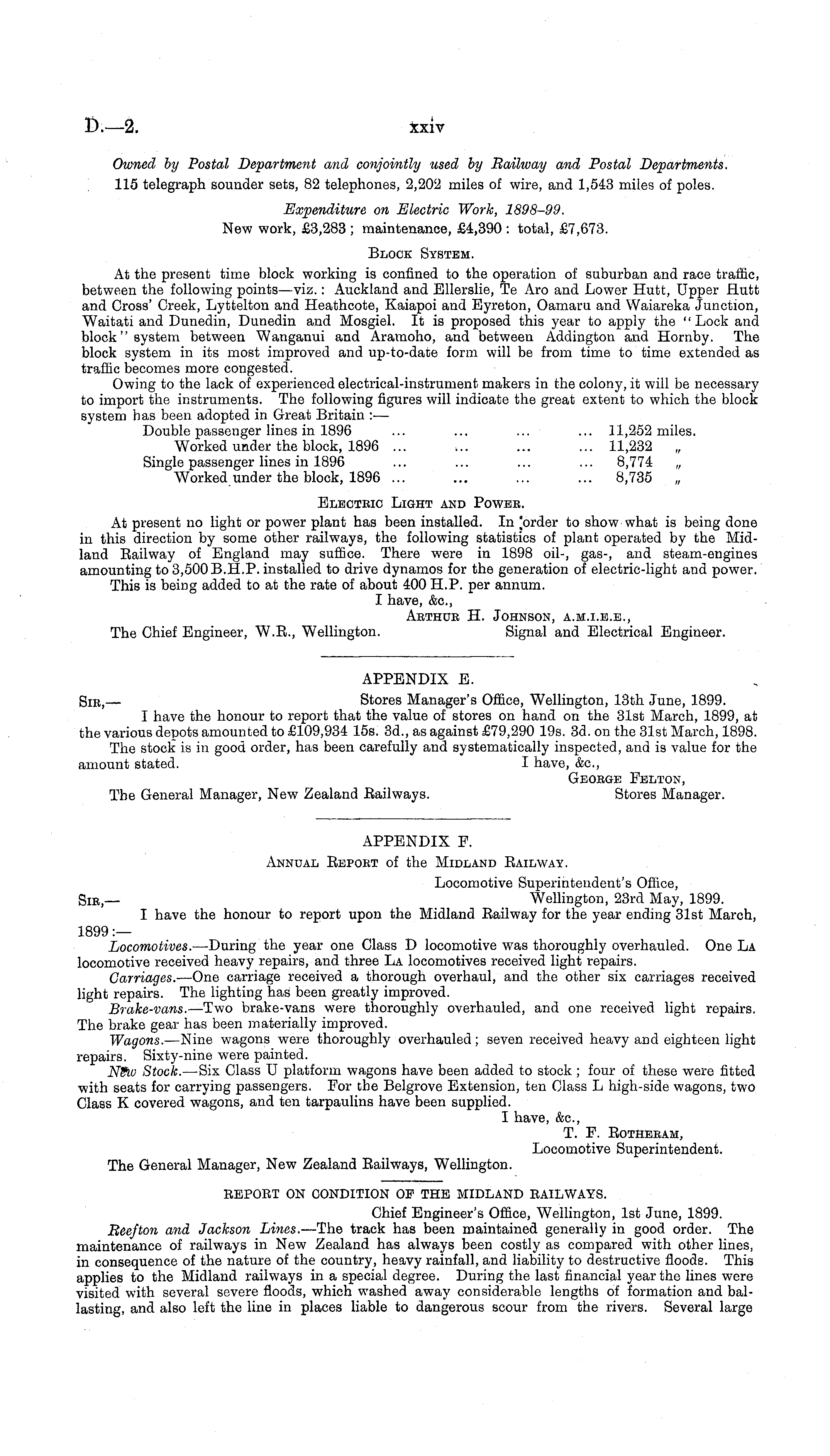 Owned by Postal Department and conjointly used by Railway and Postal Departments. 115 telegraph sounder sets, 82 telephones, 2,202 miles of wire, and 1,543 miles of poles. Expenditure on Electric Work, 1898-99. New work, £3,283 ; maintenance, £4,390 : total, £7,673. Block System. At the present time block working is confined to the operation of suburban and race traffic, between the following points —viz.: Auckland and Ellerslie, Te Aro and Lower Hutt, Upper Hutt and Cross' Creek, Lyttelton and Heathcote, Kaiapoi and Eyreton, Oamaru and Waiareka Junction, Waitati and Dunedin, Dunedin and Mosgiel. It is proposed this year to apply the "Lock and block "system between Wanganui and Aramoho, and between Addington and Hornby. The block system in its most improved and up-to-date form will be from time to time extended as traffic becomes more congested. Owing to the lack of experienced electrical-instrument makers in the colony, it will be necessary to import the instruments. The following figures will indicate the great extent to which the block system has been adopted in Great Britain : — Double passenger lines in 1896 ... ... ... ... 11,252 miles. Worked under the block, 1896 ... ... ... ... 11,232 „ Single passenger lines in 1896 ... ... ... ... 8,774 „ Worked under the block, 1896 ... ... ... ... 8,735 „ Electeic Light and Poweb. At present no light or power plant has been installed. In 'order to show what is being done in this direction by some other railways, the following statistics of plant operated by the Midland Eailway of England may suffice. There were in 1898 oil-, gas-, and steam-engines amounting to 3,500 B.H.P. installed to drive dynamos for the generation of electric-light and power. This is being added to at the rate of about 400 H.P. per annum. I have, &c, Aethue H. Johnson, a.m.i.e.e., The Chief Engineer, W.E., Wellington. Signal and Electrical Engineer.