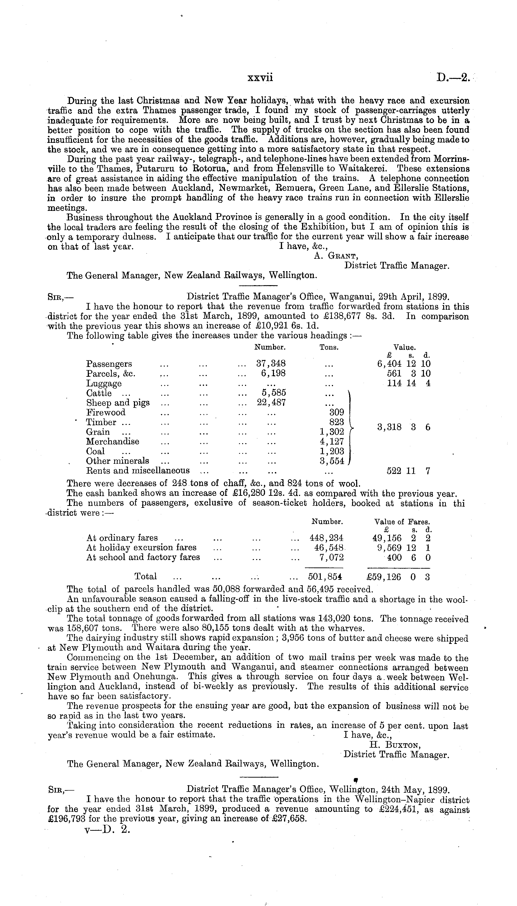 Sir,— District Traffic Manager's Office, Wanganui, 29th .April, 1899. I have the honour to report that the revenue from traffic forwarded from stations in this district for the year ended the 31st March, 1899, amounted to £138,677 Bs. 3d. In comparison with the previous year this shows an increase of £10,921 6s. Id. The following table gives the increases under the various headings : — Number. Tons. Value. £ s. d. Passengers ... ... ... 37,348 ... 6,404 12 10 Parcels, &c. ~. ... ... 6,198 ... 561 310 Luggage ... ... ... 114 14 4 Cattle ... ... ... ... 5,585 ... \ Sheep and pigs ... ... ... 22,487 Firewood ... ... 309 Timber ... ... ... 823 1 „ QIQ „ c Grain 1,302 f 3 3 18 3 6 Merchandise ... ... 4,127 Coal ... ... ... 1,203 Other minerals ... ... ... ... 3,554 . Eents and miscellaneous ... ... ... ... 522 11 7 There were decreases of 248 tons of chaff, &c, and 824 tons of wool. The cash banked shows an increase of £16,280 12s. 4d. as compared with the previous year. The numbers of passengers, exclusive of season-ticket holders, booked at stations in thi -district were : —■ Number. Value of Fares. At ordinary fares ... ... ... ... 448,234 49,156 2 2 At holiday excursion fares ... ... ... 46,548. 9,569 12 1 At school and factory fares ... ... ... 7,072 400 6 0 Total ... ... ... ... 501,854 £59,126 0 3 The total of parcels handled was 50,088 forwarded and 56,495 received. An unfavourable season caused a falling-off in the live-stock traffic and a shortage in the woolclip at the southern end of the district. The total tonnage of goods forwarded from all stations was 143,020 tons. The tonnage received was 158,607 tons. There were also 80,155 tons dealt with at the wharves. The dairying industry still shows rapid expansion; 3,956 tons of butter and cheese were shipped at New Plymouth and Waitara during the year. Commencing on the Ist December, an addition of two mail trains per week was made to the train service between New Plymouth and Wanganui, and steamer connections arranged between New Plymouth and Onehunga. This gives a through service on four days a. week between Wellington and Auckland, instead of bi-weekly as previously. The results of this additional service have so far been satisfactory. The revenue prospects for the ensuing year are good, but the expansion of business will not be so rapid as in the last two years. Taking into consideration the recent reductions in rates, an increase of 5 per cent, upon last year's revenue would be a fair estimate. I have, &c, H. Buxton, District Traffic Manager. The General Manager, New Zealand Eailways, Wellington. Sir,— District Traffic Manager's Office, Wellington, 24th May, 1899. I have the honour to report that the traffic Operations in the Wellington-Napier district for the year ended 31st March, 1899, produced a revenue amounting to £224,451, as against £196,793 for the previous year, giving an increase of £27,658.