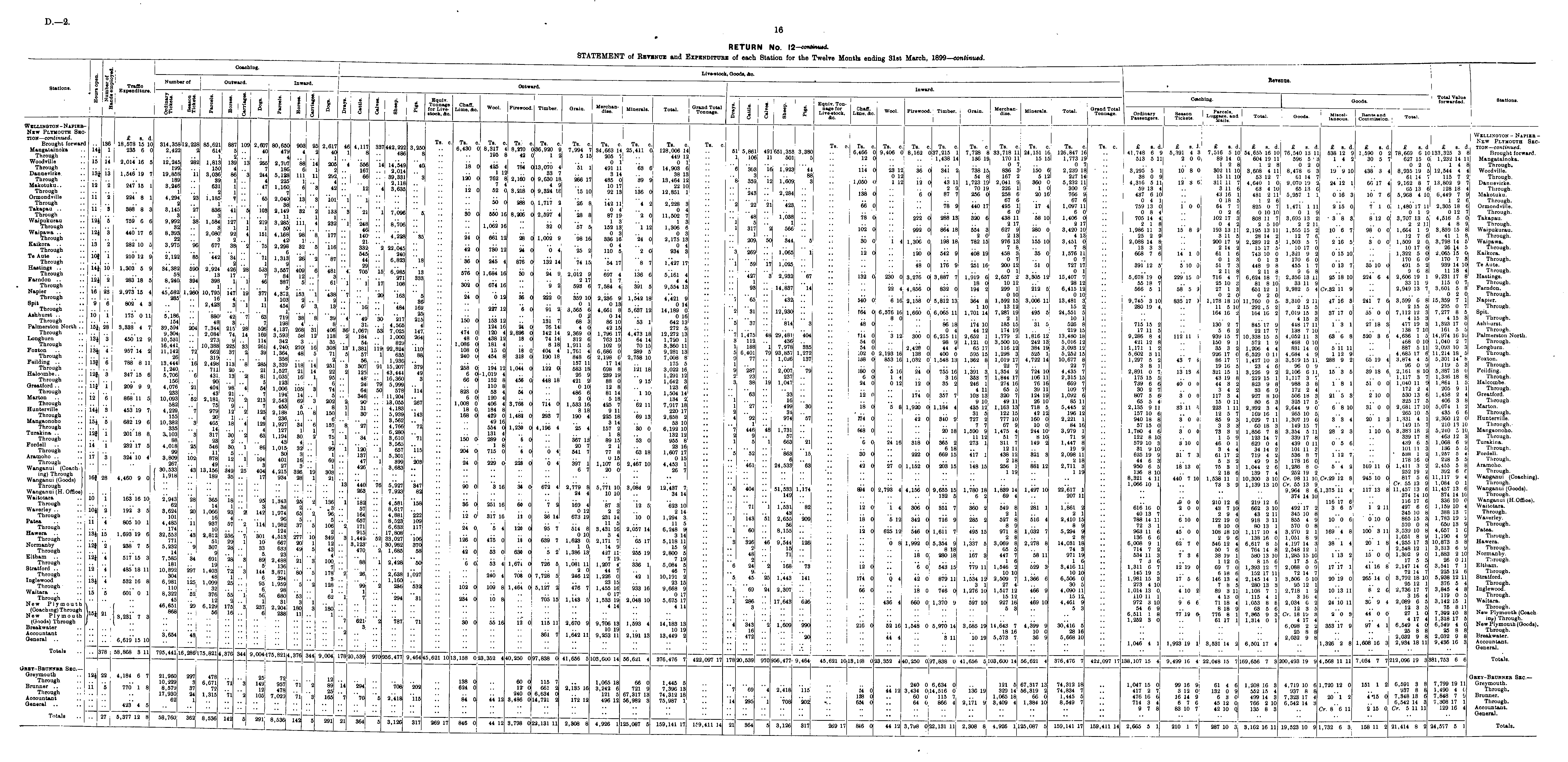 Stations. 5 00 0 S a ; Traffic I £ fl ® Expenditure 0 =S to 3a a 1 e. i Number of |l I Ho * SB I «i Live-stock, Goods, (fee. Revenue. Outward. Inward. Outward. Inward. <s-3 II i oS o S S3 - ™ « 8 • ■ g F4 n d H fl W «' O- ™ Equiv. > § 00 Tonnage d a 2 for Liveto tn w stock, Ac. Chaff, Lime. tfce. Wool. Firewood. Timber. Grain. Me d r f B e S °" Minerals. Total. Grand Total I Tonnage. i. 2 1 & 1 .• a o o fn ! Equiv. Tonnage for Ohaff, Live-stock, Lime, &c. &C. Wool. Firewood. Timber. . Grain. ' M di C 8 e an " I , Ccaching. Goods. Total Value forwarded. Stations. _ s. a. 136 18,578 15 10 [J 1 235 6 0 Minerals. Total. Grand Total Tonnage. Ordinary Passengers. Reason Tickets. Parcels, Luggage, and Mails. Total. Goods. Miscollaneous. Rents mid Commission, Total. Wellinoton-Napier-New Plymouth Section— continued. Brought forward Mangatainoka Through Woodville Through Dannevirke Through Makotuku.. Through Ormondville Through Takapau Through Waipukurau Through Waipawa Through Kaikora Through Te Aute Through Hastings Through Farndon Through Napier Through Spit Through Ashhurst .. Through Pahnerston North .. Through Longburn Through Foxton Through Feilding Through Halcombe Through Greatford Through Marton Through Hunterville Through Mangaonoho Through Turakina Through Fordell Through Aramoho Through Wanganui (Coach- \ ing) Through ( Wanganui (Goods) f Through ) Wanganui (H. Office) Waitotara Through Waverley Through Patea Through Hawera Through Normanby Through Eltham Through Stratfora Through Inglewooa ThroughWaitara Through New Plymouth \ (Coaching)Through 1 New Plymouth / (Goods) Through j Breakwater Accountant General 15 13. i6 ii ii 12. i2j i6 i6j i'i 121 i6 9 16 i'l i'} i6j 133 i2} ii} i2 i 14 2,01416 5 IJ 13 1,54619 7 I 2 247 15 1 2 224 8 1 3 388 8 3 i 6 759' 6 6 i 3 44017 6 2 282 10 5 I i 21012 9 J 10 1,303' 5 9 J 2 28318 5 23 2,97315 4 6 802' 4 8 i 175" 0 11 I 28 3,338' 4 7 i 3 45012 9 J 4 957'l4 2 ( 6 788' 8 11 ! 3 347 15 6 1 i 209 9 9 130 1 ii i6 '2 '2 3 '5 '3 '2 i 16 '2 23 28 0 314,358 0 2,422 5 12*245 199 7 19,858 189 1 3,246 1 1 4,294 2 2 3 3,145 3 3 6 9,992 32 6 8,393 22 5 3,975 9 2,122 9 34382 53 5 8,240 4 4S[_82 285 3 1 5,186 154 1 39,594 9,304 ) 10,531 16,441 2 11,142 26 1 13,444 1,240 > 5,706 156 I 4,076 233 3 .. 3 2 38 1,584 - 3 3 .. 2,080 2 .. 3 5 '96 677 2 85 442 2 590 2,924 3 .. 13 0 394 398 1 2 1,260 10,795 5 .. 16 2,423 6 .'.' '880 4 .. 48 i 204 7,344 4 .. 2,084 1 .. 273 1 .. 10,388 2 72 662 3 .. 319 1 16 2,498 ) .. 711 3 6 431 3 .. 90 3 21 404 3 .. 43 i 52 2,181 ! .. 75 ) 7 979 > .. 20 ! 3 465 i .. 14 I 3 317 i no 12,228 2 282 11 23 27 38 96 85 590 394 1,260 204 72 i6 85,621 614 1 1,813 150 3,036 39 631 2 1,185 1 8S7 5 2 139 4 86 1 1 1 7 41 127 1 92 38 34 2 ■120 17 1 117 4 3 42 8 3 215 74 9 225 37 113 20 13 98 21 75 2 2.8 1 '9 "l 28 14 " 35 "8 4 109 i3 3 1 1 4 19 2,607 80,650 40 479 4 4 13 255 2,707 7 186 3 244 5,128 4 225 47 1,160 7 7 65 2,040 38 5 103 2,149 11 1 219 3,285 1 1 50 1 1 50 4 151 4,168 42 2 75 2,298 6 71 1,313 1 9 i8 533 3,557 7 84 1 46 387 5 9 377 4,373 1 103 1 11 454 1 7 63 719 7 198 8 526 4,137 4 169 3,593 114 342 3 261 4,240 2 39 1,364! 358 3 285 3,339l 21 1,527 2 81 1,035 5 123 2,607 40 255 7 244 4 47 65 103 219 1 151 "75 71 1 533 7 46 377 1 11 "63 7 526 169 114 261 39 21 81 5 51 V 218 7 4 88 6 111 1 6 'is 32 111 98 1 32 ■10' 11 153 2 6 38 4 58 a 3 270 48 118 21 16 105 14 69 5 10 "l "3 "8 31 12 16 5 14 14 1 "3 95 2 11 1 11 3 3 2 1 4 2,61' 1 205 2 292 4 42 101 133 1 232 177 116 "87 481 3 61 438 2 13 406 118 35 1108 71 2 2 251 22 95 46 1 4 "l "3 "l "l "l "7 "4 36 2 i.3 - 5 1,117 8 556 167 66 12 1 '21 248 46 140 21 332 545 44 705 1 "l6 49 31 1,067 184 54 1,381 57 307 ; 125 48 24 64 346 90 31 30 i'9 1 91 79 50 337 14 "l "2 15 17 a J 442,222 486 I 14,549 2,014 39,331 2,118 1 3,635 . 7,096 8,706 4328 1 22,045 240 6,823 6,985 271 108 i63 '484 217 4,565 7,025 1,000 829 92,824 635 1,936 15,207 43,444 16,360 5,999 578 11,204 13,055 4,183 5,939 3,562 4,766 6,280 3,610 3,565 657 5,301 399 3,683 3,250 8 3 : K QK 35 1a in K 147 QUA 264 no 379 49 3 114 3 " 5 o 35 18 13 333 5 5 86 169 215 4 147 20-1 ill) Ts. c 10 8 8 8 '.'. 5 '.'. 5 " 8 .'. 3 '.'. 3 3 5 " R 6 a 9 5 5 5 1 4 7 1 3 " 3 3 3 3 1 " J .. 3 .. Ts. 0. . Ts. c. 6,430 0 18 0 120 0 12 0 30 0 24 0 42 0 36 0 576 0 302 0 24 0 150 0 474 0 48 0 1,086 0 108 0 240 0 258 0 0 0 66 0 82S 0 6 0 1,008 0 18 0 168 0 =. Ts. c. 0 8,317 4 195 8 0 425 4 1 12 0 762 8 7 4 0 52 0 50 0 0 550 16 1,062 16 0 661 12 0 730 12 0 245 4 0 1,684 16 0 674 16 3 0 12 227 12 3 153 12 124 16 3 120 4 3 438 12 3 181 4 3 15 0 ) 454 8 ) 194 12 ) 1,019 4 ) 152 8 110 8 ) 53 4 ) 120 4 ) 406 4 ) 184 8 ) 429 0 49 16 554 0 131 4 I 289 0 1 8 > 715 0 Ts 0. Ts. c. Ts. c. 8,270 036,920 9 7,994 7 42 0 12 5 15 784 013,070 4 '51 1 33 7 2,160 0 9,630 18 266 17 4 9.. 3,218 0 9,324 IS 15 10 288 0 1,717 2 26 8 8,206 0 2,597 4 '28 8 82 0 57 5 28 0 1,002 9 98 16 24 0 0 4 25 2 876 0 132 14 '74 15 30 0 24 9 2,012 9 .... 2 17 9 2 593 6 36 0 222 0 359 10 0 1 6 0 91 2 3,565 6 0 2 131 7 68 3 24 0 76 14! 4 0 2,896 0 142 14 2,369 0 18 0 74 14 312 6 8 18 1,911 5 18 0 404 4 1,761 4 318 0 190 18 848 6 157 11 1,044 0 122 0 583 18 26 9 15C 0 448 18 421 2 0 10 54 0 .. 486 6 2 0 3,768 0 714 0 1,533 16 8 18 1,482 0 293 7 190 4 34,663 14 205 7 0 1 491 11 3 14 485 0 10 17 92 13 142 11 0 4 87 19 1 3 152 13 0 8 336 16J 0 4! 110 5 54 17 697 4 1 7 7,584 4 2,236 9 0 13 4,661 8 0 14 86 10 42 15 1,796 17 763 15 102 9 6,686 0 2,198 6 17 14 698 8 239 19 88 0 12 8 81 14 5 18 425 7 9 11 225 18 3 14 157 2 1 8 89 15 2 1 77 8 0 15 1,107 6 20 0 . Ts. c. ■ 25,411 0 I _ 63 6 1 89 9 136 0 "l 2 "2 0 "l 12 24 0 2 0 8 7 136 6 391 5 1,542 18 5,637 12 53 1 4,473 18 64 14 70 15 289 5 2,758 10 121 18 9 15 Ts. c. 128,006 14 1 449 12 0 l 1 14,903 6 1 38 13 13,464 12 22 10 12,851 1 2,228 3 0 4 11,502 7 1 3 1,306 6 0 3 2,175 13 0 4 934 3 1,427 17 5,161 4 4 4 9,554 13 9 0 14 14,189 0 0 16 642 13 272 5 12,272 13 1,720 1 3,360 11 9,281 13 7,008 8 175 5 3,022 16 1,291 12 1,642 3 123 6 1,504 14 13