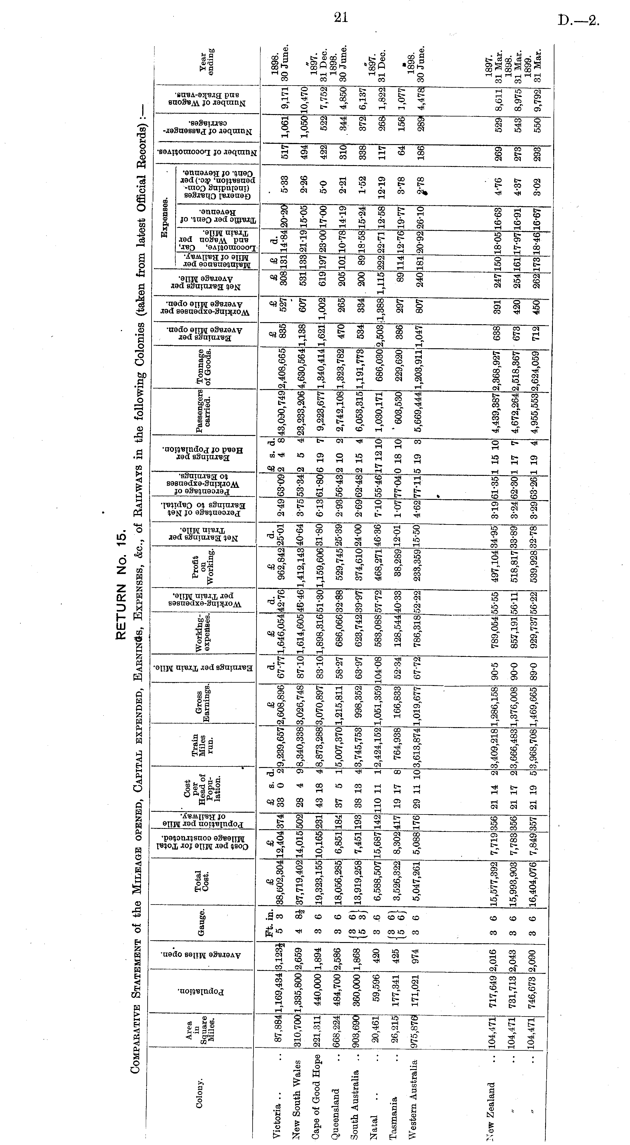 RETURN No. 15. Comparative Statement of the Mileage opened, Capital expended, Earnings, Expenses, &c., of Railways in the following Colonies (taken from latest Official Records) :—