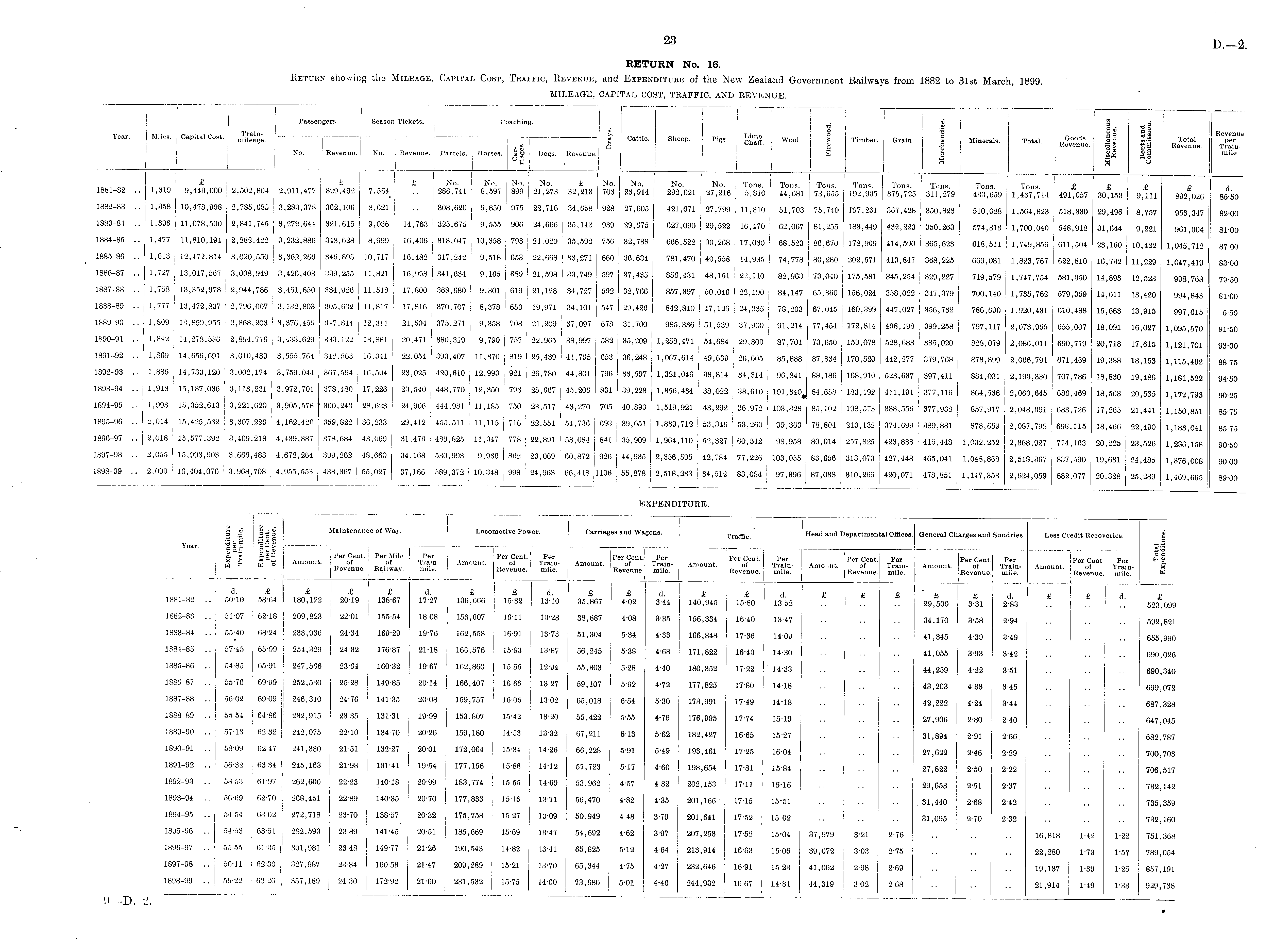 RETURN No. 16. Return showing the Mileage, Capital Cost, Traffic, Revenue, and Expenditure of the New Zealand Government Railways from 1882 to 31st March, 1899. MILEAGE, CAPITAL COST, TRAFFIC, AND REVENUE.