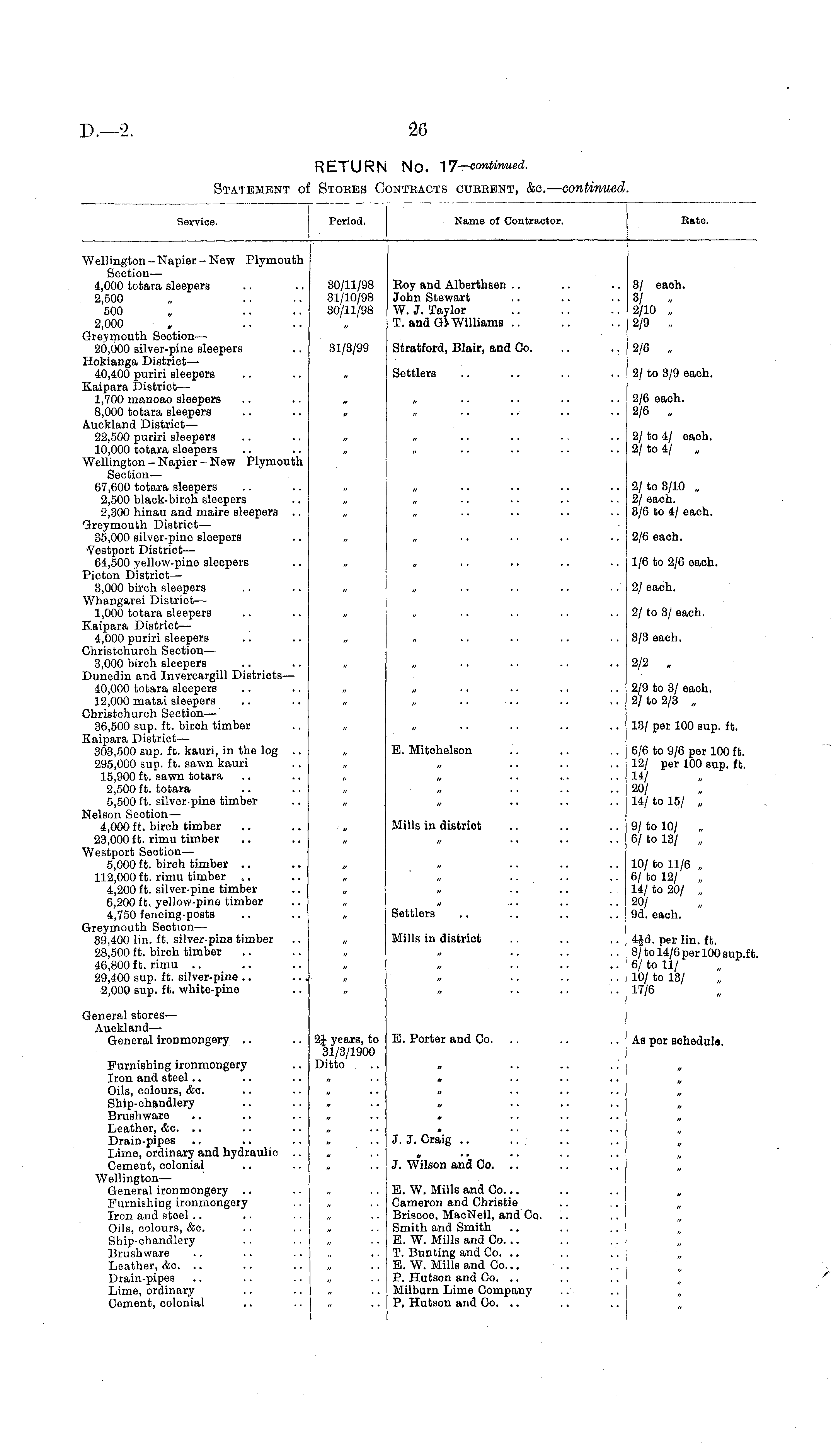 Service. Period. Name of Contractor. Rate. Wellington - Napier - New Plymouth Section — 4,000 totara sleepers 2,500 500 2,000 Greymouth Section — 20,000 silver-pine sleepers Hokianga District — 40,400 puriri sleepers Kaipara District — 1,700 manoao sleepers 8,000 totara sleepers Auckland District — 22,500 puriri sleepers 10,000 totara sleepers Wellington - Napier - New Plymouth Section — 67,600 totara sleepers 2,500 black-birch sleepers 2,300 hinau and maire sleepers .. Greymouth District— 35,000 silver-pine sleepers Vestport District — 64,500 yellow-pine sleepers Picton Distriot — 3,000 birch sleepers Whangarei District — 1,000 totara sleepers Kaipara District— 4,000 puriri sleepers Christchurch Section— 3,000 birch sleepers Dunedin and Invercargill Districts— 40,000 totara sleepers 12,000 matai sleepers Christchurch Section — 36,500 sup. ft. birch timber Kaipara District— 303,500 sup. ft. kauri, in the log .. 295,000 sup. ft. sawn kauri 15,900 ft. sawn totara 2,500 ft. totara 5,500 ft. silver-pine timber Nelson Section— 4,000 ft. birch timber 23,000 ft. rimu timber Westport Section— 5,000 ft. birch timber 112,000 ft. rimu timber 4,200 ft. silver-pine timber 6,200 ft. yellow-pine timber 4,750 fencing-posts Greymouth Section — 39,400 lin. ft. silver-pine timber 28,500 ft. birch timber 46,800 ft. rimu 29,400 sup. ft. silver-pine 2,000 sup. ft. white-pine 30/11/98 31/10/98 30/11/98 31/3/99 Roy and Alberthsen .. John Stewart W. J. Taylor T. and G. Williams .. Stratford, Blair, and Co. Settlers 3/ each. 3/ „ 2/10 „ 2/9 „ 2/6 „ 2/ to 3/9 each. 2/6 each. 2/6 „ 2/ to 4/ each. 2/ to 4/ 2/ to 3/10 „ 2/ each. 3/6 to 4/ each. 2/6 each. 1/6 to 2/6 each. 2/ each. 2/ to 3/ each. 3/3 each. 2/2 „ 2/9 to 3/ each. 2/ to 2/3 „ 13/ per 100 sup. ft. E. Mitchelson 6/6 to 9/6 per 100 ft. 12/ per 100 sup. ft. 14/ 20/ 14/to 15/ „ Mills in distriot 9/ to 10/ „ 6/ to 13/ „ 10/ to 11/6 „ 6/ to 12/ „ 14/ to 20/ „ 20/ 9d. each. Settlers Mills in distriot 4Jd. per lin. ft. 8/tol4/6perl00sup.ft, 6/ to 11/ 10/ to 13/ 17/6 General stores — Auckland — General ironmongery 2J years, to 31/3/1900 Ditto E. Porter and Co. As per schedule. Furnishing ironmongery Iron and steel Oils, colours, &o. Ship-chandlery Brushware Leather, &o. Drain-pipes Lime, ordinary and hydraulic .. Cement, colonial Wellington— General ironmongery Furnishing ironmongery Iron and steel Oils, colours, &c. Ship-chandlery Brushware Leather, &c. Drain-pipes Lime, ordinary Cement, colonial J. J. Craig J. Wilson and Co. E. W. Mills and Co... Cameron and Christie Briscoe, MacNeil, and Co. Smith and Smith E. W. Mills and Co. .. T. Bunting and Co. .. E. W. Mills and Co... P. Hutson and Co. .. Milburn Lime Company P. Hutson and Co. ..