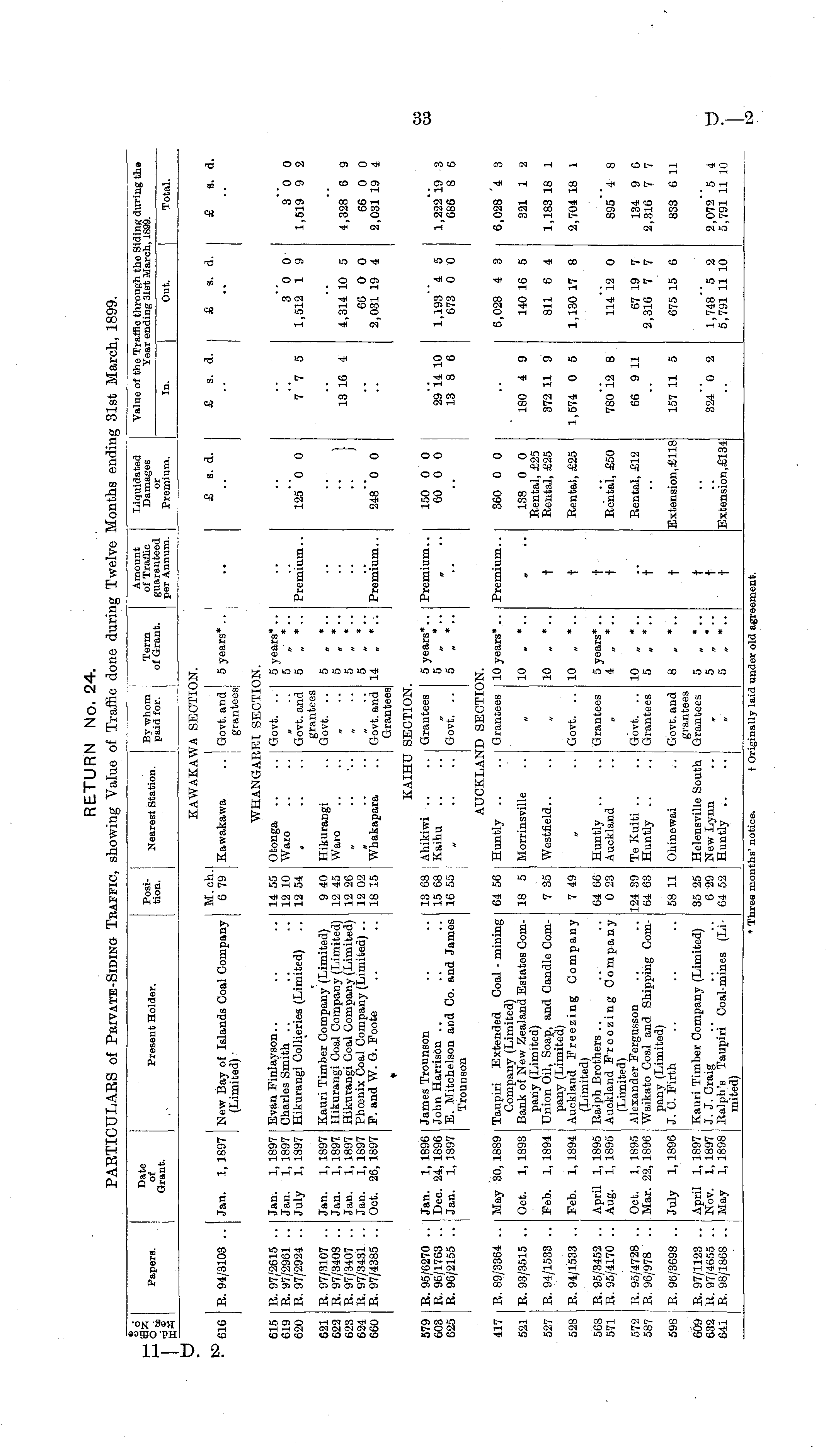 ess trjM Papers. Date of Grant. Present Holder. Position. Nearest Station. By whom paid for. Term of Grant. Amount of Traffic guaranteed per Annum. Liquidated Damages or Premium. Value of the Traffic through the Siding during the Year ending 31st March, 1899. In. Out. Total. In. Out. Total. KAWAKAWA SECTIC IN. M.ch. | 616 R. 94/3103 .. Jan. 1, 1897 New Bay of Islands Coal Company 6 79 Kawakawa .. I Govt, and (Limited).' grantees £ s. d. 5 years*.. £ s. d. i £ s. d. £ s. d. WHANGAREI SECTK )N. 615 R. 97/2615 .. Jan. 1,1897 Evan Pinlayson.. .. ..14 55 Otonga .. .. Govt. .. 619 R. 97/2961 .. Jan. 1, 1897 Charles Smith .. .. .. 12 10 Waro 620 R. 97/2924 .. July 1,1897 Hikurangi Collieries (Limited) ..12 54 „ .. .. Govt, and grantees 621 R. 97/3107 .. Jan. 1, 1897 Kauri Timber Company (Limited) 9 40 Hikurangi .. Govt. .. 622 R. 97/3403 .. Jan. 1, 1897 Hikurangi Coal Company (Limited) 12 45 Waro 623 R. 97/3407 .. Jan. 1,1897 Hikurangi Coal Company (Limited) 12 26 624 R. 97/3431 .. Jan. 1,1897 Phoenix Coal Company (Limited) .. 12 02 660 R. 97/4385 .. Oct. 26, 1897 P. and W. G. Eoote .. .. 18 15 Whakapara .. Govt, and Grantees 5 years*.. 5 „ * .. 5 „ * .. Premium.. 125 0 0 5 „ *.. 5 . *.. .. .. j 5 . *.. .. .. } 5 „ * .. 14 „ *.. Premium.. 248 0 0 3 0 0 3 0 0 7 7 5 1,512 1 9 1,519 9 2 13 16 4 4,314 10 5 4,328 6 9 66 0 0 66 0 0 2,031 19 4 2,031 19 4 KAIHU SECTION. 5 years*.. Premium.. 150 0 0 5 „ * 60 0 0 5 „ *.. 29 14 10 1,193 4 5 1,22219 3 13 8 6 673 0 0 686 8 6 879 R. 95/6270 .. Jan. 1, 1896 James Trounson .. .. 13 68 Ahikiwi .. .. Grantees 603 R. 96/1763 .. Dec. 24, 1896 John Harrison .. .. .. 15 68 Kaihu 625 R. 96/2155 .. Jan. 1, 1897 E. Mitchelson and Co. and James 16 55 „ .. .. Govt. .. Trounson AUCKLAND SECTIC N. 417 | R. 89/3364 .. May 30, 1889 Taupiri Extended Coal - mining 64 56 Huntly .. .. Grantees Company (Limited) 521 I R. 93/3515 .. Oct. 1,1893 Bank of New Zealand Estates Com- 18 5 Morrinsville pariy (Limited) 527 R. 94/1533 .. Feb. 1,1894 Union Oil, Soap, and Candle Com- 7 35 Westfleld.. pany (Limited) 528 R. 94/1533 .. Feb. 1,1894 Auckland Freezing Company 7 49 „ .. Govt. .. (Limited) 568 R. 95/3452 .. April 1, 1895 Ralph Brothers .. .. .. 64 66 Huntly .. .. Grantees 571 R. 95/4170 .. Aug. 1,1895 Auckland Freezing Company 0 23 Auckland (Limited) 572 R. 95/4728 .. Oct. 1, 1895 Alexander Fergusson .. .. 124 39 Te Kuiti .. .. Govt. .. 587 R. 96/978 .. Mar. 22, 1896 Waikato Coal and Shipping Com- 64 63 Huntly .. .. Grantees pany (Limited) 598 R. 96/3698 .. July 1, 1896 J. C. Firth .. .. .. 58 11 Ohinewai .. Govt, and grantees 609 R. 97/1123 .. April 1, 1897 Kauri Timber Company (Limited) 35 25 Helensville South Grantees 632 R. 97/4655 .. Nov. 1,1897 J.J.Craig .. .. .. 6 29 New Lynn 641 R. 98/1868 .. May 1,1898 Ralph's Taupiri Coal-mines (Li- 64 52 Huntly .. mited) 10 years* .. I Premium., j 360 0 0 l 10 . * .. „ .. 138 0 0 Rental, £25 10 „ * .. f Rental, £25 10 „ * .. f Rental, £25 5 years* .. t 4 „ * .. f Rental, £50 I 6,028 4 3 | 6,028 4 3 180 4 9 140 16 5 321 1 2 372 11 9 811 6 4 1,183 18 1 1,574 0 5 1,130 17 8 2,704 18 1 78012 8 11412 0 895"4 8 10 „ * .. .. Rental, £12 5 „ * .. t 66 9 11 67 19 7 134 9 6 2,316 7 7 2,316 7 7 8 „ *.. t Extension,£118 157 11 5 675 15 6 833 6 11 5 „ *.. t 5 „ *.. t 5 „ * .. f Extension,£134 324 0 2 1,748 5 2 2,072 5 4 5,791 11 10 5,791 11 10 * Three months' notice. 1 Originally laid under old agreement.