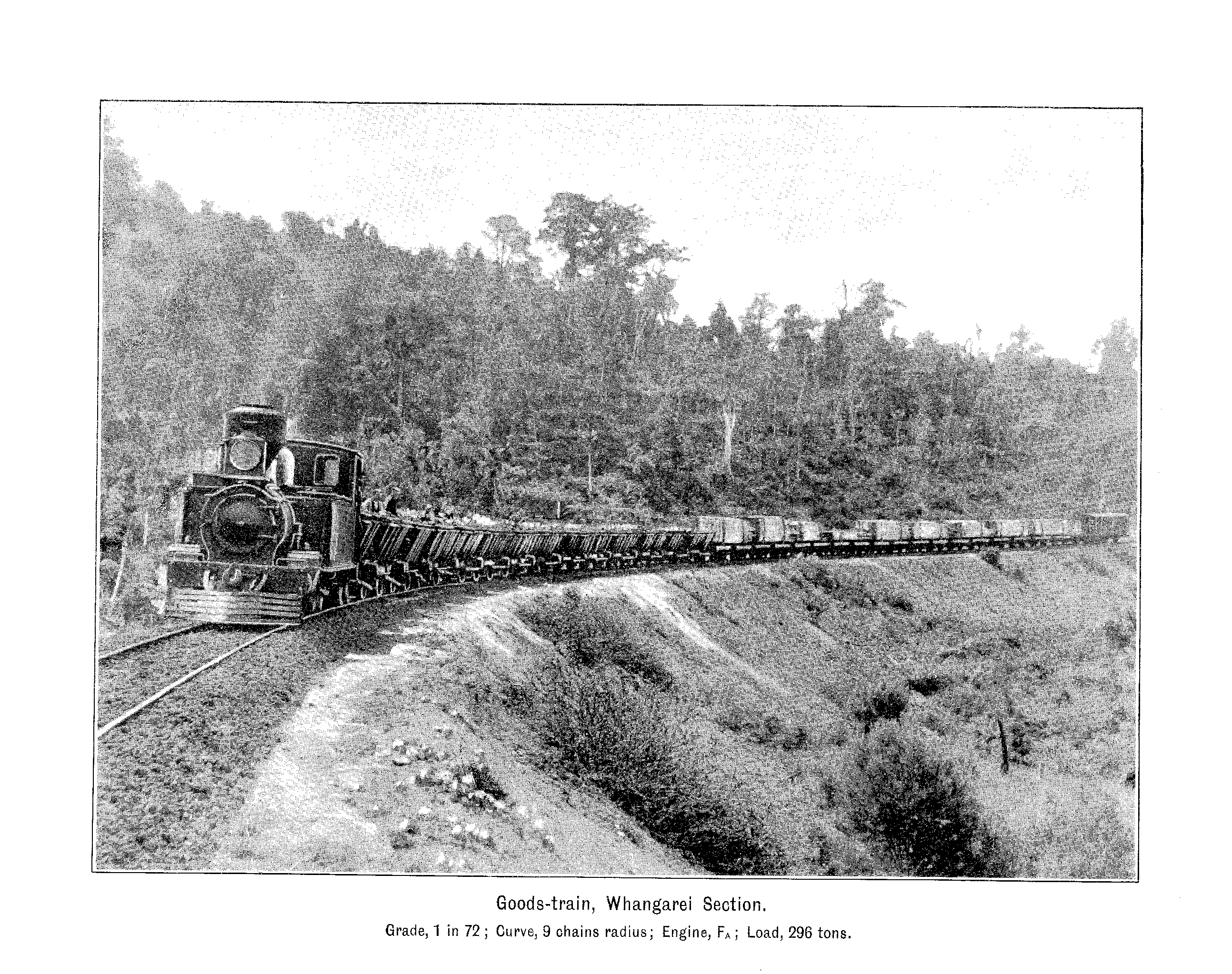 Goods-train, Whangarei Section. Grade, 1 in 72; Curve, 9 chains radius; Engine, Fa; Load, 296 tons.
