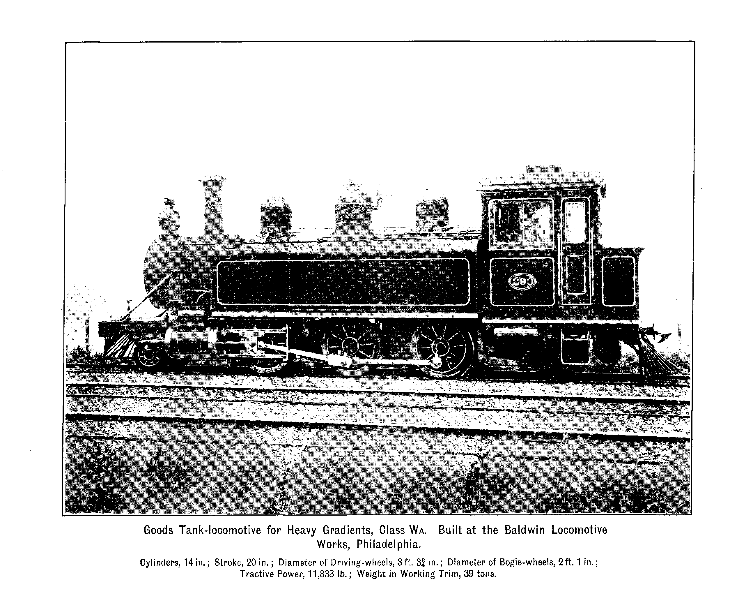 Goods Tank-locomotive for Heavy Gradients, Class Wa. Built at the Baldwin Locomotive Works, Philadelphia. Cylinders, 14in.; Stroke, 20in.; Diameter of Driving-wheels, 3ft. 3¾in.; Diameter of Bogie-wheels, 2ft. 1in.; Tractive Power, 11,833 lb.; Weight in Working Trim, 39 tons.