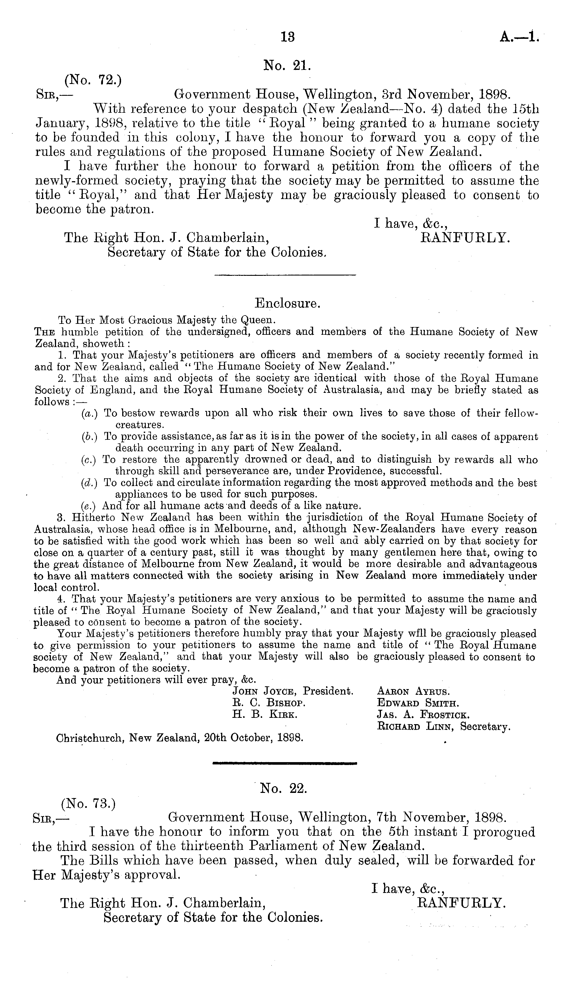 No. 21. (No. 72.) Sic, — Government House, Wellington, 3rd November, 1898. With reference to your despatch (New Zealand —No. 4) dated the 15th January, 1898, relative to the title " Royal " being granted to a humane society to be founded in this colony, I have the honour to forward you a copy of the rules and regulations of the proposed Humane Society of New Zealand. I have further the honour to forward a petition from the officers of the newly-formed society, praying that the society may be permitted to assume the title "Royal," and that Her Majesty may be graciously pleased to consent to become the patron. I have, &c, The Right Hon. J. Chamberlain, RANFURLY. Secretary of State for the Colonies.