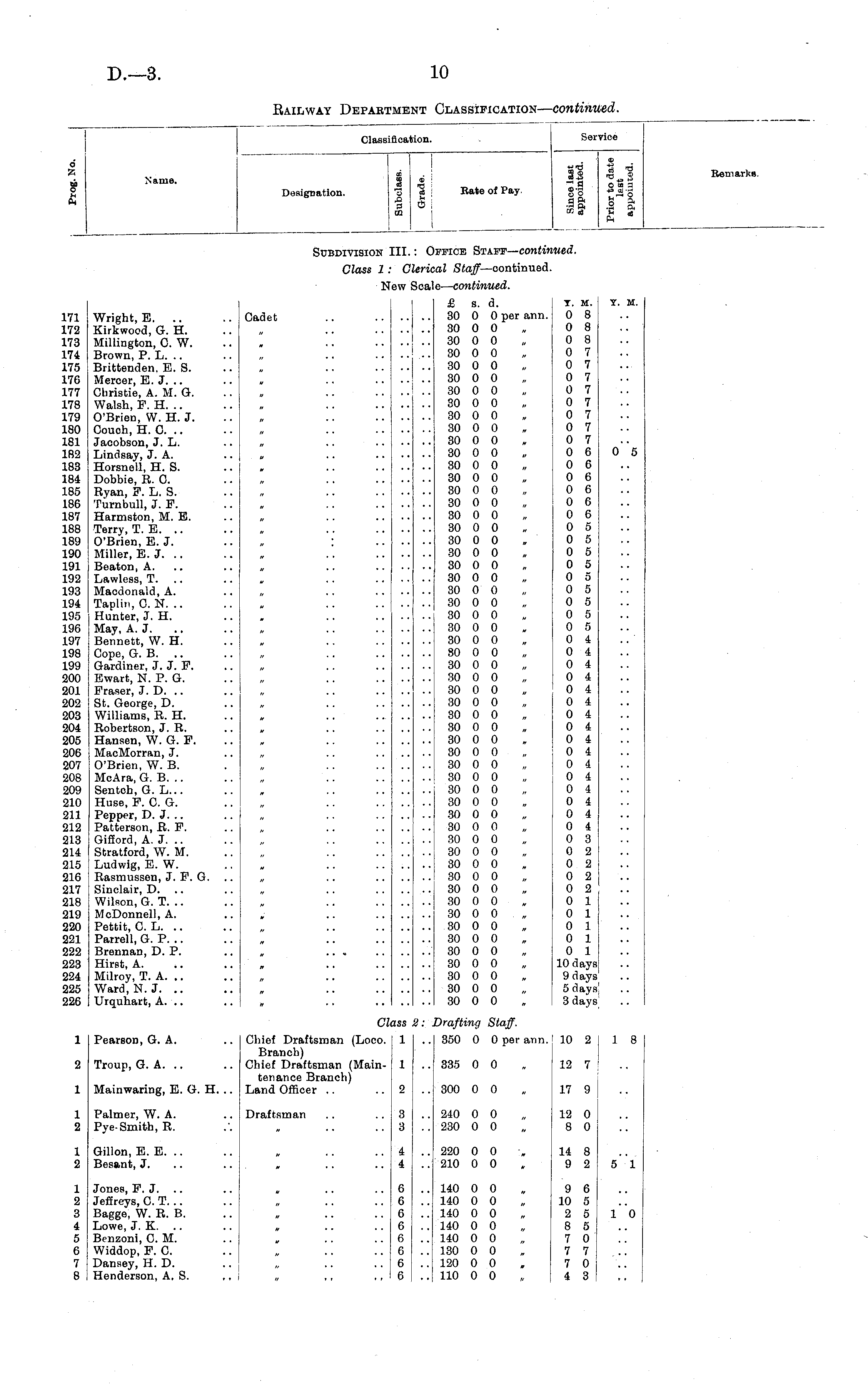 Classification. Service d A t fc Name. ! Designation. CO . j CO CO A i 3 * i m | I Rate of Pay. it I J ffl.g o co a gft *"'& fc Remarks. Subdivision III. Class 1: C : C lerii Iffice Staff — contir :al Staff —continued le— continued. med. 171 172 173 174 175 176 177 178 179 180 181 182 183 184 185 186 187 188 189 190 191 192 193 194 195 196 197 198 199 200 201 202 203 204 205 206 207 208 209 210 211 212 213 214 215 216 217 218 219 220 221 222 223 224 225 226 Wright, E. .. Kirkwood, G. H. Millington, 0. W. Brown, P. L. .. Brittenden. E. S. Mercer, E.J... Christie, A. M. G. Walsh, F. H. .. O'Brien, W. H.J. Couch, H. C .. Jacobson, J. L. Lindsay, J. A. Horsnell, H. S. Dobbie, R. 0. Ryan, F. L. S. Tumbull, J. F. Harmston, M. E. Terry, T. E. .. O'Brien, E. J. Miller, E.J... Beaton, A. Lawless, T. .. Macdonald, A. Taplin, C. N. .. Hunter, J. H. May, A. J. Bennett, W. H. Cope, G. B. .. Gardiner, J. J. F. Ewart, N. P. G. Fraser, J. D. .. St. George, D. Williams, R. H. Robertson, J. R. Hansen, W. G. F. MacMorran, J. O'Brien, W. B. McAra, G. B. .. Sentch, G. L... Huse, F. 0. G. Pepper, D. J. .. Patterson, R. F. Gifiord, A. J. .. Stratford, W. M. Ludwig, E. W. Rasmussen, J. F. G. Sinclair, D. .. Wilson, G. T. .. McDonnell, A. Pettit, 0,L. ., Parrell, G. P. .. Brennan, D. P. Hirst, A. Milroy, T. A. .. Ward, N. J. .. Urquhart, A. .. New 1 Cadet Seal £ s. d. 30 0 0 per ann. 30 0 0 30 0 0 30 0 0 30 0 0 30 0 0 30 0 0 30 0 0 30 0 0 30 0 0 30 0 0 30 0 0 30 0 0 30 0 0 30 0 0 30 0 0 30 0 0 30 0 0 30 0 0 30 0 0 30 0 0 30 0 0 30 0 0 30 0 0 30 0 0 30 0 0 30 0 0 SO 0 0 30 0 0 30 0 0 30 0 0 30 0 0 30 0 0 30 0 0 30 0 0 30 0 0 30 0 0 30 0 0 30 0 0 30 0 0 30 0 0 ' 30 0 0 30 0 0 30 0 0 30 0 0 30 0 0 30 0 0 30 0 0 30 0 0 30 0 0 30 0 0 30 0 0 30 0 0 30 0 0 30 0 0 30 0 0 T. M. 0 8 0 8 0 8 0 7 0 7 0 7 0 7 0 7 0 7 0 7 0 7 0 6 0 6 0 6 0 6 0 6 0 6 0 5 0 5 0 5 0 5 0 5 0 5 0 5 0 5 0 5 0 4 0 4 0 4 0 4 0 4 0 4 0 4 i 0 4 0 4 0 4 0 4 0 4 0 4 0 4 : 0 4 : 0 4 ; 0 3 i 0 2 0 2 ; 0 2 0 2 0 1 0 1 0 1 0 1 0 1 10 days 9 days 5 days; 3 days Y. M. 0"5 Pearson, G. A. Class Chief Draftsman (Loco. 1 Branch) Chief Draftsman (Main- 1 tenance Branch) Land Officer .. .. 2 :ss 1 Drafting Staff. 350 0 0 per ann. 10 2 I 1 8 1 2 Troup, G. A. .. 1 335 0 0 12 7 1 Mainwaring, E. G. H. .. 2 300 0 0 17 9 1 2 Palmer, W. A. Pye-Smith, R. Draftsman .. .. 3 3 3 240 0 0 230 0 0 12 0 8 0 ..3 1 2 Gillon, E. E. .. Besant, J. ..4 A 4 4 220 0 0 210 0 0 14 8 9 2 5 1 .. 4 1 2 3 4 5 6 7 8 Jones, F. J. .. Jeffreys, 0. T. .. Bagge, W. R. B. Lowe, J. K. .. Bcnzoni, CM. Widdop, F. 0. Dansey, H. D. Henderson, A. S. .. 6 a ..6 ..6 .. 6 e G 6 6 6 6 6 6 6 140 0 0 140 0 0 140 0 0 140 0 0 140 0 0 130 0 0 120 0 0 110 0 0 9 6 10 5 2 5 8 5 7 0 7 7 7 0 4 3 1 0 .. 6 P. ..6 C ..6 a ,,6