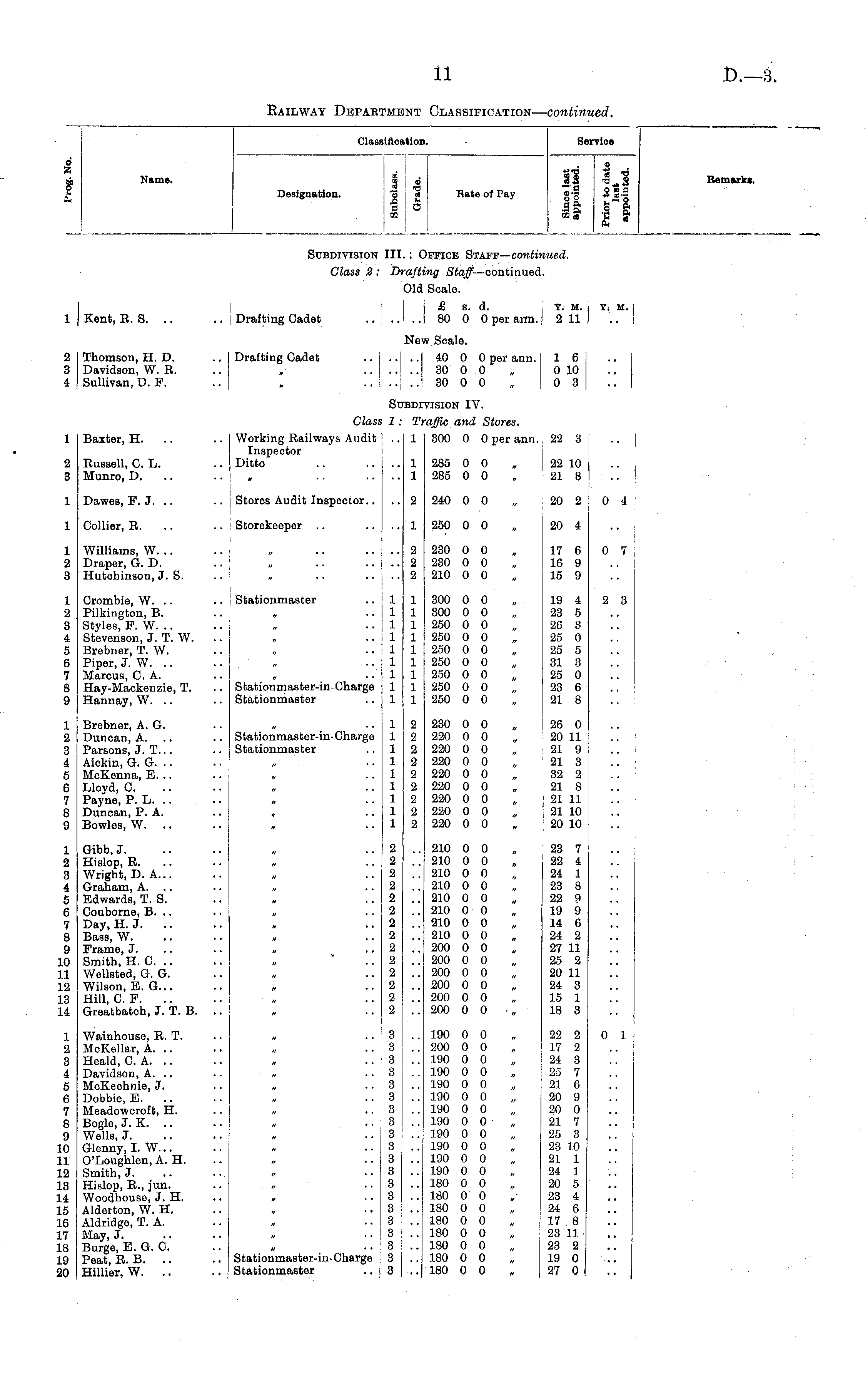 Classification. Service A i ci Name. fc Name. I 4 H *<■$ Designation. o « RateofPav ••« & "•? A fa. 2 n fa'""* 9 B S IS 8 & Designation. CO 2 o £ *» O CO B O m Rate of Pay J| hi oo c? 'C 8" ft " Remarks. B w .3 ft O g m oo 3" 'C 9" fc * Subdivision III.: Office Staff— continued. Class 2 : Drafting Staff —continued. Old Scale. 1 j Kent, R. S. J I £ S. d. j Y; M. I Y. M. j .. j Drafting Cadet .. | ... ■ .. I 80 0 0 per arm. | 2 11 I New Scale. 2 Thomson, H. D. 3 Davidson, W. R. 4 Sullivan, D. F. .. Drafting Cadet 40 0 0 per ann. 16 30 0 0 „ 0 10 30 0 0 „ 0 3 Subdivision IV. Si 1 1 Baxter, H. 2 Russell, 0. L. 3 Munro, D. Class 1 : Traffic and Stores. .. Working Railways Audit .. 1 300 0 0 per ann. 22 3 Inspector .. Ditto .. .... 1 285 0 0 „ 22 10 .... 1 285 0 0 „ 21 8 1 : 2 3 1 1 Dawes, F. J. .. Stores Audit Inspector.. .. 2 240 0 0 „ 20 2 0 4 1 1 Collier, R. .. Storekeeper .. .... 1 250 0 0 „ 20 4 1 2 3 1 Williams, W. .. 2 Draper, G. D. 3 Hutchinson, J. S. .... 2 230 0 0 „ 17 6 0 7 .... 2 230 0 0 , 16 9 .... 2 210 0 0 „ 15 9 1 2 3 4 5 6 7 8 9 1 Crombie, W. .. 2 Pilkington, B. 3 Styles, F. W. .. 4 Stevenson, J. T. W. 5 Brebner, T. W. 6 Piper, J. W. 7 Marcus, C. A. 8 Hay-Mackenzie, T. 9 Hannay, W. .. .. Stationmaster .. 1 1 300 0 0 „ 19 4 2 3 .. 1 1 300 0 0 „ 23 5 .. 1 1 250 0 0 26 3 .. 1 1 250 0 0 „ 25 0 .. 1 1 250 0 0 „ 25 5 .. 1 1 250 0 0 „ 31 3 .. 1 1 250 0 0 25 0 .. Stationmaster-in-Oharge 1 1 250 0 0 ,, 23 6 .. Stationmaster .. 1 1 250 0 0 „ 21 8 1 1 1 1 1 1 1 1 1 1 2 3 4 5 6 7 8 9 1 Brebner, A. G. 2 Duncan, A. 3 Parsons, J. T... 4 Aickin, G. G. 5 McKenna, E... 6 Lloyd, C 7 Payne, P. L. 8 Duncan, P. A. 9 Bowles, W. .. .. 1 2 230 0 0 26 0 .. Stationmaster-in-Charge 1 2 220 0 0 „ 20 11 .. Stationmaster .. 1 2 220 0 0 „ 21 9 .. 1 2 220 0 0 21 3 .. 1 2 220 0 0 32 2 .. 1 2 220 0 0 „ 21 8 .. 1 2 220 0 0 21 11 .. 1 2 220 0 0 „ 21 10 .. 1 2 220 0 0 20 10 1 1 1 1 1 1 1 1 1 1 2 3 4 5 6 7 8 9 10 11 12 13 14 1 Gibb, J. 2 Hislop, R. 3 Wright, D. A... 4 Graham, A. .. 5 Edwards, T. S. 6 Couborne, B. .. 7 Day, H. J. 8 Bass, W. 9 Frame, J. .0 Smith, H. 0. .. .1 Wellsted, G. G. 2 Wilson, E. G... .3 Hill, 0. F. .4 Greatbatch, J. T. B. .. 2 .. 210 0 0 „ 23 7 .. 2 .. 210 0 0 „ 22 4 .. 2 .. 210 0 0 24 1 .. 2 .. 210 0 0 „ 23 8 .. 2 .. 210 0 0 „ 22 9 .. 2 .. 210 0 0 „ 19 9 .. 2 .. 210 0 0 „ 14 6 .. 2 .. 210 0 0 24 2 .. 2 .. 200 0 0 27 11 .. 2 .. 200 0 0 25 2 .. 2 .. 200 0 0 20 11 .. 2 .. 200 0 0 24 3 .. 2 .. 200 0 0 „ 15 1 .. 2 .. 200 0 0 •„ 18 3 2 2 2 2 2 2 2 2 2 2 2 2 2 2 1 2 3 4 5 6 7 8 9 10 11 12 13 14 15 16 17 18 19 20 1 Wainhouse, R. T. 2 McKellar, A. .. 3 Heald, 0. A. 4 Davidson, A. .. 5 McKechnie, J. 6 Dobbie, B. 7 Meadowcroft, H. 8 Bogle, J. K. 9 Wells, J. 0 Glenny, I. W... 1 O'Loughlen, A. H. .2 Smith, J. 3 Hislop, R., jun. 4 Woodhouse, J. H. 5 Alderton, W. H. 6 Aldridge, T. A. 7 May, J. 8 Burge, E. G. 0. 9 Peat, R. B. .. 10 Hillier, W. .. .. 3 .. 190 0 0 22 2 0 1 .. 3 .. 200 0 0 „ 17 2 .. 3 .. 190 0 0 „ 24 3 .. 3 .. 190 0 0 „ 25 7 .. 3 .. 190 0 0 „ 21 6 .. 3 .. 190 0 0 20 9 .. 3 .. 190 0 0 „ 20 0 .. 3 .. 190 0 0 „ 21 7 .. 3 .. 190 0 0 25 3 .. 3 .. 190 0 0 „ 23 10 .. 3 .. 190 0 0 21 1 .. „ .. 3 .. 190 0 0 „ 24 1 .. 3 .. 180 0 0 „ 20 5 .. 3 .. 180 0 0 , 23 4 .. 3 .. 180 0 0 „ 24 6 .. 3 .. 180 0 0 „ 17 8 .. 3 .. 180 0 0 „ 23 11 .. 3 .. 180 0 0 „ 23 2 .. Stationmaster-in-Charge 3 .. 180 0 0 „ 19 0 .. Stationmaster .. 3 .. 180 0 0 „ 27 0 I 3 3 3 3 3 3 3 3 3 3 3 3 3 3 3 3 3 3 3 3