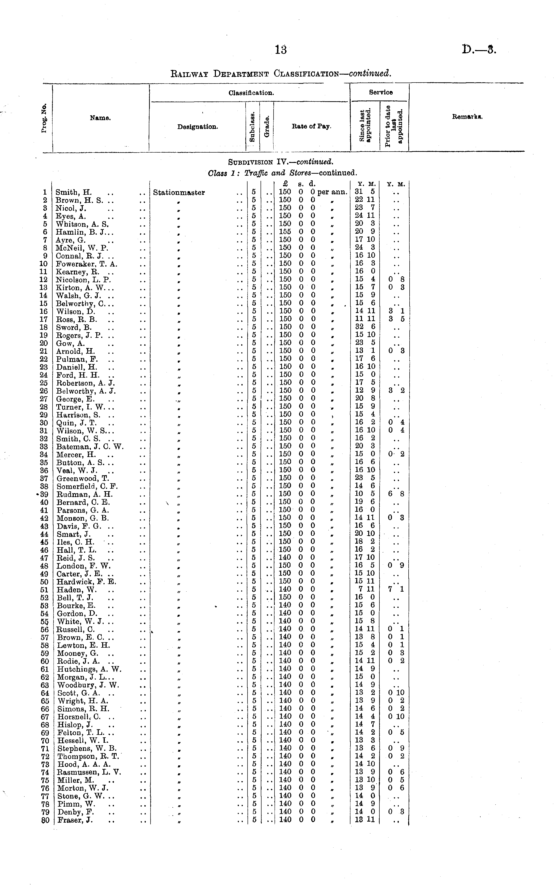 6 A i Name. Classi 2 o £ *B a co ,Q fa 1 B O m ifl cation. Rate of Pay. go ■Sg v3 Service o i i OS q -*a trJ--r« .2 g fc Remarki Designation. SUB) nvis: :on IV.— continued. Class 1: Trafl le c md Stores —continue L. 1 2 3 4 5 6 7 8 9 10 11 12 18 14 15 16 17 18 19 20 21 22 23 24 25 26 27 28 29 30 31 32 33 34 35 36 37 38 39 40 41 42 43 44 45 46 47 48 49 50 51 52 53 54 55 56 57 58 59 60 61 62 63 64 65 66 67 08 69 70 71 72 73 74 75 76 77 78 79 80 Smith, H. Brown, H. S. .. Nicol, J. Eyes, A. Whitson, A. S. Hamlin, B. J... Ayre, G. McNeil, W. P. Connal, R. J. Foweraker, T. A. Kearney, R. .. Nicolson, L. P. Kirton, A. W. .. Walsh, G. J. Belworthy, C .. Wilson, D. Ross, R. B. Sword, B. Rogers, J. P. Gow, A. Arnold, H. Pulman, F. .. Daniell, H. Ford, H. H. Robertson, A. J. Belworthy, A. J. George, E. Turner, I. W. .. Harrison, S. .. Quin, J. T. .. Wilson, W. S... Smith, 0. S. Bateman, J. C. W. Mercer, H. Button, A. S. .. Veal, W. J. Greenwood, T. Somerfield, C. F. Rudman, A. H. Bernard, C. B. Parsons, G. A. Monson, G. B. Davis, F. G. Smart, J. lies, C H. Hall, T. L. Reid, J. S. London, F. W. Carter, J. E. .. Hardwick, F. E. Haden, W. .. Bell, T. J. Bourke, E. Gordon, D. White, W.J. Russell, 0. Brown, E. C. .. Lewton, E. H. Mooney, G. Rodie, J. A. Hutchings, A. W. Morgan, J. L... Woodbury, J. W. Scott, G. A. Wright, H. A. Simons, R. H. Horsnell, C. .. Hislop, J. Felton, T. L. .. Hessell, W. I. Stephens, W. B. Thompson, R. T. Hood, A. A. A. Rasmussen, L. V. Miller, M. Morton, W. J. Stone, G. W. .. Pimm, W. Denby, F. Fraser, J. Stationmaster 5 5 5 5 5 5 5 5 5 5 5 5 5 5 5 5 5 5 5 5 5 5 5 5 5 5 5 5 5 5 5 5 5 5 5 5 5 5 5 5 5 5 5 5 5 5 5 5 5 5 5 5 5 5 5 5 5 5 5 5 5 5 5 5 5 5 5 5 5 5 5 5 5 5 5 5 5 5 5 5 £ s. d. 150 0 0 per ann. 150 0 0 150 0 0 150 0 0 150 0 0 155 0 0 150 0 0 150 0 0 150 0 0 150 0 0 150 0 0 150 0 0 150 0 0 150 0 0 150 0 0 . . 150 0 0 150 0 0 150 0 0 150 0 0 150 0 0 150 0 0 150 0 0 150 0 0 150 0 0 150 0 0 150 0 0 150 0 0 150 0 0 150 0 0 150 0 0 150 0 0 150 0 0 150 0 0 150 0 0 150 0 0 150 0 0 150 0 0 150 0 0 150 0 0 150 0 0 150 0 0 150 0 0 150 0 0 150 0 0 , 150 0 0 150 0 0 140 0 0 150 0 0 150 0 0 150 0 0 140 0 0 150 0 0 140 0 0 140 0 0 140 0 0 140 0 0 140 0 0 140 0 0 140 0 0 140 0 0 140 0 0 140 0 0 140 0 0 140 0 0 140 0 0 140 0 0 140 0 0 140 0 0 140 0 0 , 140 0 0 140 0 0 140 0 0 140 0 0 140 0 0 140 0 0 140 0 0 140 0 0 140 0 0 140 0 0 140 0 0 Y. M. 31 5 22 11 23 7 24 11 20 3 20 9 17 10 24 3 16 10 16 3 16 0 15 4 15 7 15 9 15 6 14 11 11 11 32 6 15 10 23 5 13 1 17 6 16 10 15 0 17 5 12 9 20 8 15 9 15 4 16 2 16 10 16 2 20 3 15 0 16 6 16 10 23 5 14 6 10 5 19 6 16 0 14 11 16 6 20 10 18 2 16 2 17 10 16 5 15 10 15 11 7 11 16 0 15 6 15 0 15 8 14 11 13 8 15 4 15 2 14 11 14 9 15 0 14 9 13 2 13 9 14 6 14 4 14 7 14 2 13 3 13 6 14 2 14 10 13 9 13 10 13 9 14 0 14 9 14 0 13 11 Y. M. o"8 0 3 3"l 3 5 o"3 3"2 o"4 0 4 0"2 6"8 0"3 o"9 7"l 0 1 0 1 0 1 0 3 0 2 0 10 0 2 0 2 0 10 » o"5 o"9 0 2 0 6 0 5 0 6 o"3