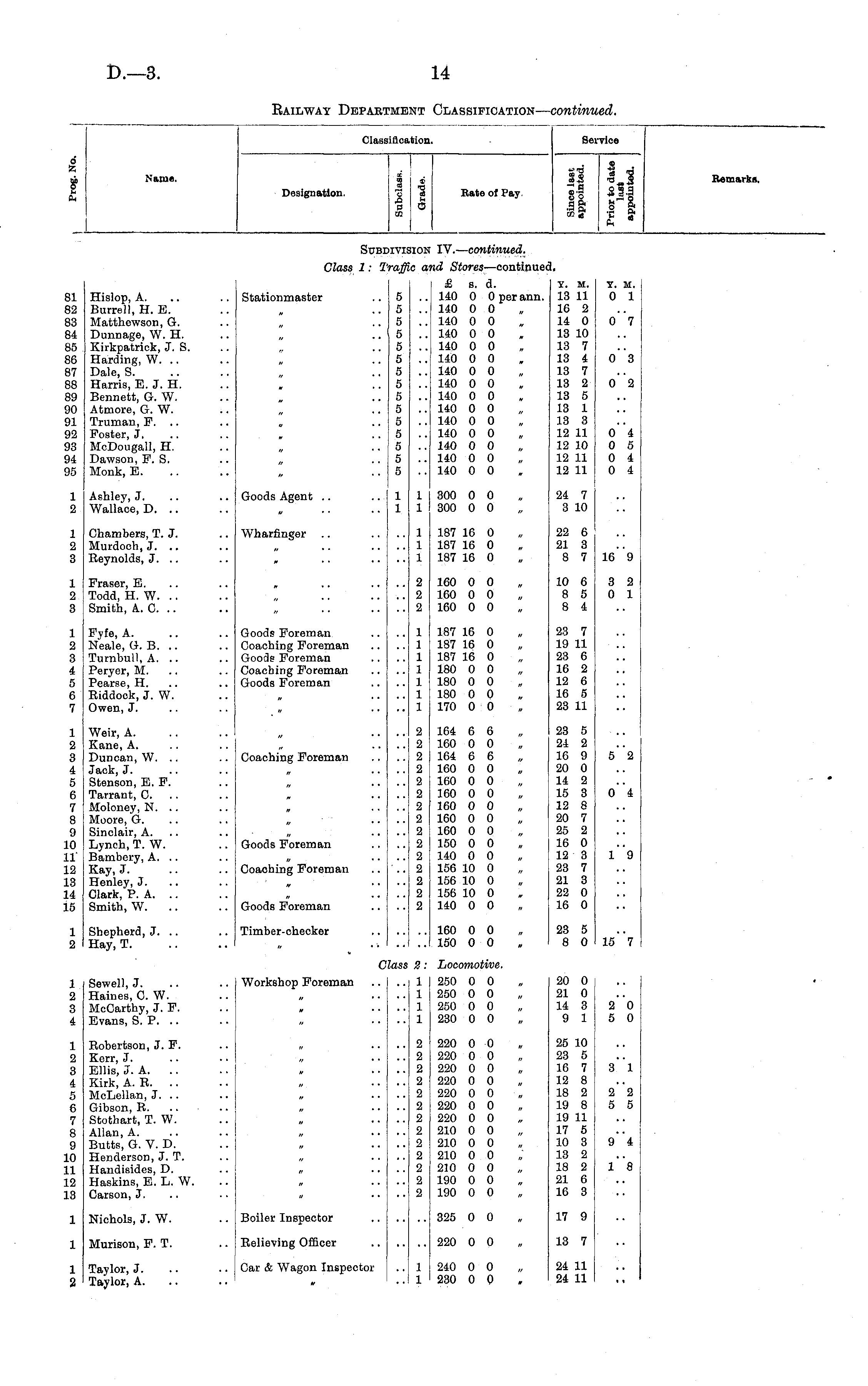 d A t fc Name. Designation. Classification. .1 3 * Bate of Pay il 3J si f-t Service Remarks, Subd: [VI! 3ION IV.— continued, id Stores —continued Class 1: Ti le a: 81 82 83 84 85 86 87 88 89 90 91 92 93 94 95 Hislop, A. Burrell, H. E. Matthewson, G. Dunnage, W. H. Kirkpatrick, J. S. Harding, W. .. Dale, S. Harris, E. J. H. Bennett, G. W. Atmore, G. W. Truman, F. Foster, J. MoDougall, H. Dawson, F. S. Monk, E. Stationmaster 5 5 5 5 5 5 5 5 5 5 5 5 5 5 5 £ s. d. 140 0 0 per ann. 140 0 0 140 0 0 140 0 0 140 0 0 140 0 0 140 0 0 140 0 0 140 0 0 140 0 0 140 0 0 140 0 0 140 0 0 140 0 0 140 0 0 Y. M. 13 11 16 2 14 0 13 10 13 7 13 4 13 7 13 2 13 5 13 1 13 3 12 11 12 10 12 11 12 11 Y. M. 0 1 o"7 o"3 02 0 4 0 5 0 4 0 4 1 2 Ashley, J. Wallace, D. .. Goods Agent 1 1 1 1 300 0 0 300 0 0 24 7 3 10 1 2 3 Chambers, T. J. Murdoch, J. .. Reynolds, J. Wharfinger 1 1 1 187 16 0 187 16 0 187 16 0 22 6 21 3 8 7 16 9 1 2 3 Fraser, E. Todd, H. W. Smith, A. C. 2 2 2 160 0 0 160 0 0 160 0 0 10 6 8 5 8 4 3 2 0 1 1 2 3 4 5 6 7 Fyfe, A. Neale, G. B. Turnbull, A. .. Peryer, M. Pearse, H. Riddock, J. W. Owen, J. Goods Foreman Coaching Foreman Goods Foreman Coaching Foreman Goods Foreman 1 1 1 1 1 1 1 187 16 0 187 16 0 187 16 0 180 0 0 180 0 0 180 0 0 170 0 0 23 7 19 11 23 6 16 2 12 6 16 5 23 11 1 2 3 4 5 6 7 8 9 10 11' 12 13 14 15 Weir, A. Kane, A. Duncan, W. .. Jack, J. Stenson, E. F. Tarrant, C Moloney, N. .. Moore, G. Sinclair, A. Lynch, T. W. Bambery, A. .. Kay, J. Henley, J. Clark, P. A. Smith, W. Coaching Foreman 2 2 2 2 2 2 2 2 2 2 2 2 2 2 2 164 6 6 160 0 0 164 6 6 160 0 0 160 0 0 160 0 0 160 0 0 160 0 0 160 0 0 150 0 0 140 0 0 156 10 0 156 10 0 156 10 0 140 0 0 23 5 24 2 16 9 20 0 14 2 15 3 12 8 20 7 25 2 16 0 12 3 23 7 21 3 22 0 16 0 5"2 o"4 Goods Foreman l"9 Coaching Foreman Goods Foreman 1 2 Shepherd, J. .. Hay, T. Timber-checker 160 0 0 150 0 0 23 5 8 0 15 "l CI 2: Locomotive. 1 2 3 4 Sewell, J. Haines, 0. W. McCarthy, J. F. Evans, S. P. Workshop Foreman lass 1 1 1 1 250 0 0 250 0 0 250 0 0 230 0 0 20 0 21 0 14 3 9 1 2"o 5 0 1 2 3 4 5 6 7 8 9 :o .1 .2 .3 Robertson, J. F. Kerr, J. Ellis, J. A. Kirk, A. R. McLellan, J. .. Gibson, R. Stothart, T. W. Allan, A. Butts, G. V. D. Henderson, J. T. Handisides, D. Haskins, E. L. W. Carson, J. 2 2 2 2 2 2 2 2 2 2 2 2 2 220 0 0 220 0 0 220 0 0 220 0 0 220 0 0 220 0 0 220 0 0 210 0 0 210 0 0 210 0 0 210 0 0 190 0 0 190 0 0 25 10 23 5 16 7 12 8 18 2 19 8 19 11 17 5 10 3 13 2 18 2 21 6 16 3 3"l 2*'2 5 5 9*'4 l'*8 1 Nichols, J. W. Boiler Inspector 325 0 0 17 9 1 Murison, F. T. Relieving Officer 220 0 0 13 7 1 2 Taylor, J. Taylor, A. Car & Wagon Inspector 1 1 240 0 0 230 0 0 24 11 24 11 »