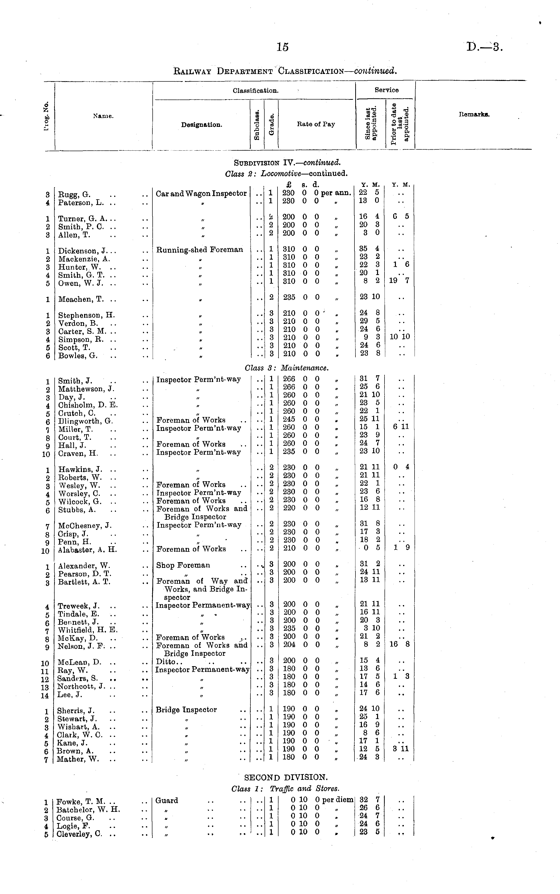 Clasi lifical iion. Service 6 z; 2 Name. Designation. m CO dl O A B W o es S Rate of Pay l| hi aft g a £& -a 3 fc Remarks. Subi IIVI! :sion IV.— continued. Locomotive —continued. HON Class i : I lOCOi 3 Rugg, G. 4 Paterson, L. .. 8 4 .. Car and Wagon Inspector £ s. d. Y. M. 1 230 0 0 per ann. 22 5 1 230 0 0 „ 13 0 1 1 Y. M. 1 Turner, G. A. .. 2 Smith, P. 0. .. 3 Allen, T. 1 2 3 2 200 0 0 „ 16 4 2 200 0 0 „ 20 3 2 200 0 0 „ 3 0 2 2 2 6 5 1 Dickenson, J. .. 2 Mackenzie, A. 3 Hunter, W. .. 4 Smith, G. T. 5 Owen, W. J. 1 2 3 4 5 .. Running-shed Foreman 1 310 0 0 „ 35 4 1 310 0 0 „ 23 2 1 310 0 0 „ 22 3 1 310 0 0 „ 20 1 1 310 0 0 „ 8 2 1 1 1 1 1 r'e 19"7 1 Meachen, T. .. 1 •. * 2 235 0 0 „ 23 10 2 1 Stephenson, H. 2 Verdon, B. 3 Carter, S. M. .. 4 Simpson, R. .. 5 Scott, T. 6 Bowles, G. 1 2 3 4 5 6 3 210 0 0 . 24 8 3 210 0 0 „ 29 5 3 210 0 0 « 24 6 3 210 0 0 , 9 3 3 210 0 0 „ 24 6 3 210 0 0 „ 23 8 3 3 3 3 3 3 io io C lass i 3: Maintenance. 3: 1 Smith, J. 2 Matthewson, J. 3 Day, J. 4 Chisholm, D. E. 5 Crutch, 0. 6 Illingworth, G. 7 Miller, T. 8 Court, T. 9 Hall, J. 10 Craven, H. 1 2 3 4 5 6 7 8 9 10 . . Inspector Perm'nt-way .. Foreman of Works .. Inspector Perm'nt-way .. Foreman of Works .. Inspector Perm'nt-way 1 266 0 0 „ 31 7 1 266 0 0 „ 25 6 1 260 0 0 „ 21 10 1 260 0 0 „ 23 5 1 260 0 0 „ 22 1 1 245 0 0 . 25 11 1 260 0 0 „ 15 1 1 260 0 0 „ 23 9 1 260 0 0 « 24 7 1 235 0 0 „ 23 10 1 1 1 1 1 1 1 1 1 1 6 ii 1 Hawkins, J. .. 2 Roberts, W. .. 3 Wesley, W. .. 4 Worsley, 0. .. 5 Wilcock, G. .. 6 Stubbs, A. 7 McChesney, J. 8 Crisp, J. 9 Penn, H. LO Alabaster, A. H. 1 2 3 4 5 6 .. Foreman of Works .. Inspector Perm'nt-way .. Foreman of Works .. Foreman of Works and Bridge Inspector .. Inspector Perm'nt-way .. Foreman of Works 2 230 0 0 „ 21 11 2 230 0 0 „ 21 11 2 230 0 0 „ 22 1 2 230 0 0 „ 23 6 2 230 0 0 „ 16 8 2 220 0 0 , 12 11 2 2 2 2 2 2 0 4 7 8 9 10 2 230 0 0 „ 31 8 2 230 0 0 „ 17 3 2 230 0 0 , 18 2 2 210 0 0 „ 0 5 2 2 2 2 l'*9 1 Alexander, W. 2 Pearson, D. T. 3 Bartlett, A. T. 4 Treweek, J. 5 Tindale, E. .. 6 Bennett, J. 7 Whitfield, H. E. 8 McKay, D. 9 Nelson, J. F. tO McLean, D. .. Ll Ray, W. L2 Sanders, S. .. L3 Northcott, J. .. L4 Lee, J. 1 2 3 .. Shop Foreman .. Foreman of Way and Works, and Bridge Inspector .. Inspector Permanent-way .. Foreman of Works .. Foreman of Works and Bridge Inspector .. Ditto.. .. Inspector Permanent-way 3 200 0 0 „ 31 2 3 200 0 0 „ 24 11 3 200 0 0 „ 13 11 3 3 3 4 5 6 7 8 9 3 200 0 0 „ 21 11 3 200 0 0 „ 16 11 3 200 0 0 „ 20 3 3 235 0 0 „ 3 10 3 200 0 0 « 21 2 3 204 0 0 , 8 2 3 3 3 3 3 3 16*8 .0 .1 .2 3 4 3 200 0 0 „ 15 4 3 180 0 0 „ 13 6 3 180 0 0 „ 17 5 3 180 0 0 „ 14 6 3 180 0 0 „ 17 6 3 3 3 3 3 1*8 1 2 3 4 5 6 7 1 Sherris, J. 2 Stewart, J. 3 Wishart, A. .. 4 Clark, W. 0. 5 Kane, J. 6 Brown, A. 7 Mather, W. .. .. Bridge Inspector 1 190 0 0 „ 24 10 1 190 0 0 „ 25 1 1 190 0 0 „ 16 9 1 190 0 0 „ 8 6 1 190 0 0 , 17 1 1 190 0 0 „ 12 5 1 180 0 0 „ 24 3 1 1 1 1 1 1 1 3 il SI SO DND DIVISION. Class 1 . Traffic and Stores. 1 Fowke, T. M. .. 2 Batchelor, W. H. 3 Course, G. 4 Logie, F. 5 Cleverley, 0. .. .. Guard 1 0 10 0 per diem 32 7 1 0 10 0 „ 26 6 1 0 10 0 „ 24 7 1 0 10 0 „ 24 6 1 0 10 0 . 23 5