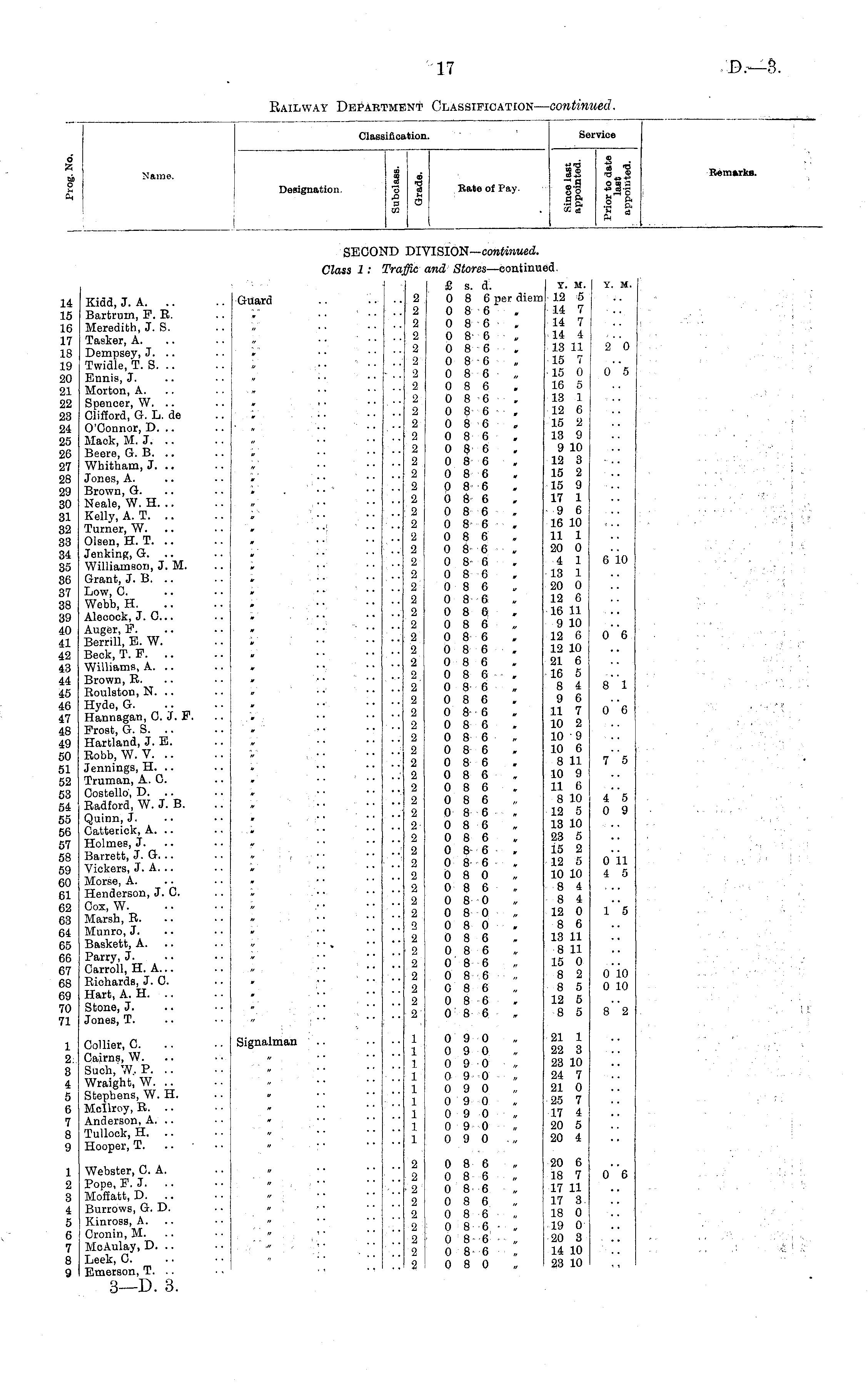 Clasi iification. Service d A t fa fc Name. Designation. m o b a Rate of Pay. il hi 0.9 ° 2 ° ° 2 " o II I S K co fa cd fc Remarks. j seco: :d VISION— continued. Class 1: "ra, ffic %nd Stores —continui ed. 14 15 16 17 18 19 20 21 22 23 24 25 26 27 28 29 30 31 32 33 34 35 36 37 38 39 40 41 42 43 44 45 46 47 48 49 50 51 52 53 54 55 56 57 58 59 60 Gl 62 G3 64 65 66 67 68 69 70 71 Kidd, J. A. Bartrum, F. R. Meredith, J. S. Tasker, A. Dempsey, J. .. Twidle, T. S. Ennis, J. Morton, A. Spencer, W. .. Clifford, G. L. de O'Connor, D. .. Mack, M. J. Beere, G. B. Whitham, J. .. Jones, A. Brown, G. Neale, W. H. .. Kelly, A. T. Turner, W. Olsen, H. T. .. Jenking, G. Williamson, J. M. Grant, J. B. Low, C. Webb, H. Alecock, J. C.. Auger, F. Berrill, E. W. Beck, T. F. Williams, A. .. Brown, R. Roulston, N. .. Hydo, G. Hannagan, 0. J. F. Frost, G. S. Hartland, J. E. Robb, W. V. Jennings, H. .. Truman, A. 0. Costello, D. .. Radford, W. J. B. Quinn, J. Catterick, A. .. Holmes, J. Barrett, J. G. .. Vickers, J. A. .. Morse, A. Henderson, J. 0. Cox, W. Marsh, R. Munro, J. Baskett, A. Parry, J. Carroll, H. A... Richards, J. 0. Hart, A. H. Stone, J. Jones, T. Guard •• I .. 2 2 2 2 2 2 2 2 2 2 2 2 2 2 2 2 2 2 2 2 2 2 2 2 2 2 2 2 2 2 2 2 2 2 2 2 2 2 2 2 2 2 22 2 2 2 2 2 2 2 2 2 2 2 2 2 2 £ s. d. 0 8 6 per diem 0 8 6 0 8 6, 0 8 6 0 8 6, 0 8-6 0 8 6 „ 0 8 6 0 8 6 . 0 8 6 - , 0 8 6 „ 0 8 6 0 8 6 0 8 6 0 8 6 0 8 6 0 8 6 0 8 6 0 8 6 . 0 8 6 0 8 6ft 0 8 6 0 8 6 0 8 6 0 8 6 0 8 6 0 8 6 0 8 6 0 8 6 . 0 8 6 0 8 6. 0 8 6 0 8 6 0 8 6 0 8 6 0 8 6 „ 0 8 6 0 8 6 . 0 8 6 0 8 6 0 8 6 0 8 6 » 0 8 6 0 8 6 0 8 6 . 0 8 6 . 0 8 0 0 8 6 0 8 0 0 8 0 „ 0 8 0 . 0 8 6 0 8 6 0 8 6 0 8 6 ■ ■ „ 0 8 6 0 8 6 0 8 6 Y. M. 12 5 14 7 14 7 14 4 13 11 15 7 15 0 16 5 13 1 12 6 15 2 13 9 9 10 12 3 15 2 15 9 17 1 9 6 16 10 11 1 20 0 4 1 13 1 20 0 12 6 16 11 9 10 12 6 12 10 21 6 16 5 8 4 9 6 11 7 10 2 10 9 10 6 8 11 10 9 11 6 8 10 12 5 13 10 23 5 15 2 12 5 10 10 8 4 8 4 12 0 8 6 13 11 8 11 15 0 8 2 8 5 12 5 8 5 Y. M. 2"0 0 5 6 10 0"6 s"l o"6 7"5 4"5 0 9 o'ii 4 5 l'*5 o'io 0 10 8"2 ! i: 1 2. 3 4 5 G 7 8 9 Collier, 0. Cairns, W. Such, W, P. .. Wraight, W. .. Stephens, W. H. Mcllroy, R. .. Anderson, A. .. Tullock, H. .. Hooper, T. Signalman 1 1 1 1 1 1 1 1 0 9 0 0 9 0 0 9 0 0 9 0 „ 0 9 0 0 9 0 0 9 0 0 9 0 0 9 0 ■„ 21 1 22 3 23 10 24 7 21 0 25 7 17 4 20 5 20 4 1 2 3 4 5 6 7 8 9 Webster, C A. Pope, F.J. .. Moffatt, D. .. Burrows, G. D. Kinross, A. Cronin, M. McAulay, D. .. Leek, C. Emerson, T. .. 2 2 ■ 2 2 2 2 2 2 2 ■ 0 8 6 0 8 6 „ 0 8 6 0 8 6 0 8 6 „ 0 8 6 - « 0 8 6 „ 0 8 6 „ 0 8 0 20 6 18 7 17 11 17 3. 18 0 19 0 20 3 14 10 23 10 0"6