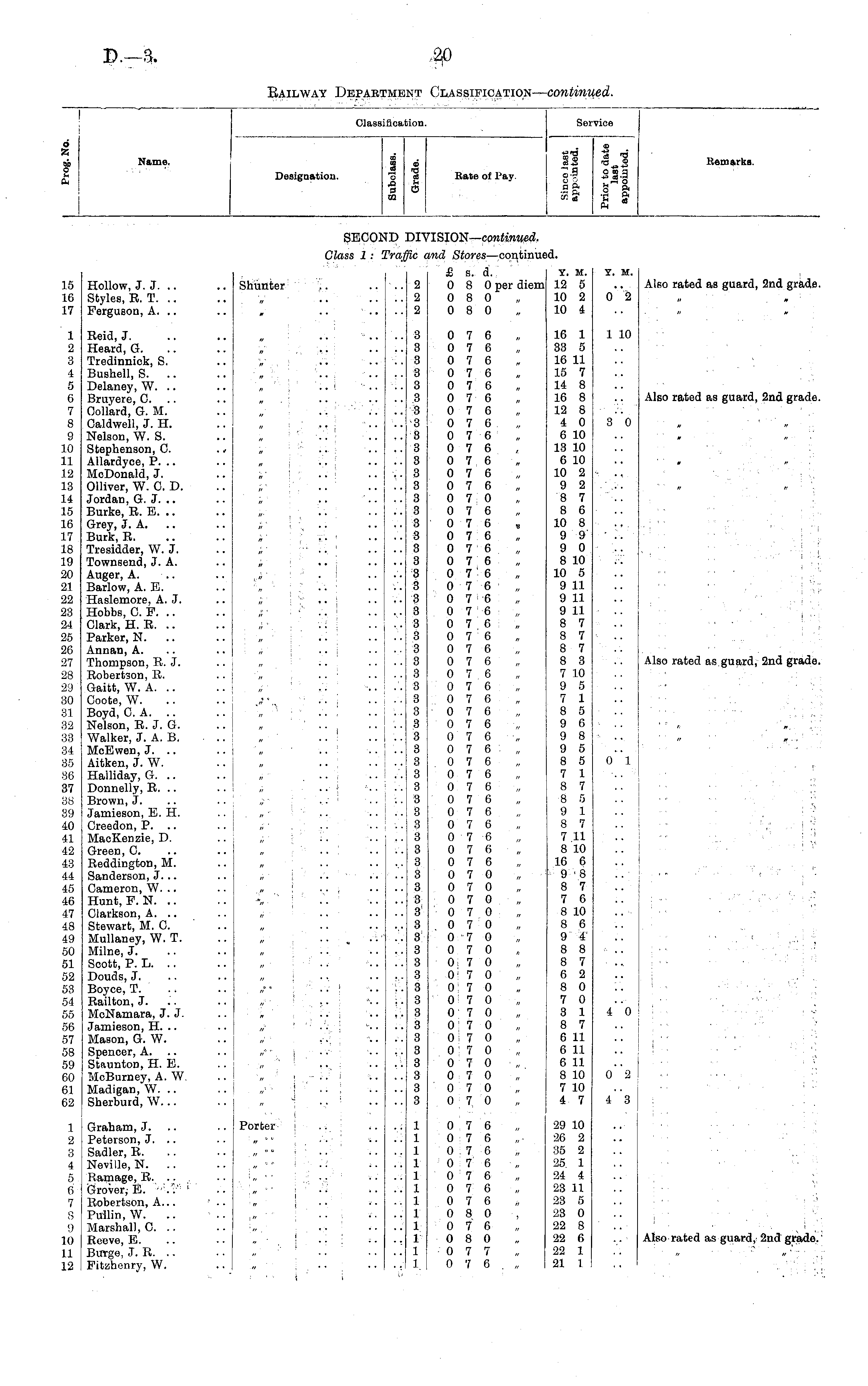 Classi ificafcion. Service 6 * Name. i Designation. CO oj £ "0 o cd a 3 OQ Rate of Pay. it Ij o -9 ° B a Remarks. SECOl Class 1 : '. Shunter D Y % 1SION— continued. md Stores —continue £ s. d. 0 8 0 per diem 0 8 0 0 8 0 id. Y. M. 12 5 10 2 10 4 Y. M. Also rated as guard, 2nd grade 15 16 17 Hollow, J. J. Styles, R. T. Ferguson, A. .. 2 2 2 0 "'2 1 2 3 4 5 6 7 8 9 10 11 12 13 14 15 1G 17 18 19 20 21 99 23 24 25 2G 27 28 29 30 31 32 33 34 35 86 37 38 39 40 41 42 43 44 45 46 47 48 49 50 51 52 53 54 55 56 57 58 59 00 61 62 Reid, J. Heard, G. Tredinnick, S. Bushell, S. .. Delaney, W. .. Bruyere, C. Oollard, G. M. Caldwell, J. H. Nelson, W. S. Stephenson, C Allardyce, P. .. McDonald, J. Olliver, W. 0. D. Jordan,G. J... Burke, R. E. .. Grey, J. A. Burk, R. Tresidder, W. J. Townsend, J. A. Auger, A. Barlow, A. E. Haslemore, A. J. Hobbs, C. F. Clark, H. R. Parker, N. Annan, A. Thompson, R. J. Robertson, R. Gaitt, W. A. Coote, W. Boyd, C.A. Nelson, R. J. G. Walker, J. A. B. McEwen, J. .. Aitken, J. W. Halliday, G. .. Donnelly, R. .. Brown, J. Jamieson, E. H. Creedon, P. .. MacKenzie, D. Green, C Reddington, M. Sanderson, J. .. Cameron, W. .. Hunt, F. N. Clarkson, A. .. Stewart, M. C. Mullaney, W. T. Milne, J. Scott, P. L. Douds, J. Boyce, T. Railton, J. McNamara, J. J. Jamieson, H. .. Mason, G. W. Spencer, A. Staunton, H. E. McBurney, A. W. Madigan, W. .. Sherburd, W. .. 3 3 3 3 3 3 3 •3 3 3 3 3 3 3 3 3 3 3 3 3 3 3 3 3 3 3 3 3 3 3 3 3 3 3 3 3 3 3 8 3 3 3 3 3 3 3 3 3 3 3 3 3 3 3 3 3 3 3 3 3 3 3 0 7 6 0 7 6 0 7 6 0 7 6 0 7 6 0 7 6 0 7 6 0 7 6 „ 0 7 6 0 7 6 0 7 6 0 7 6 0 7 6 0 7 0 0 7 6 0 7 6 0 7 6 0 7 6 0 7 6 0 7 6 0 7 6 0 7 ' 6 0 7 6 „ 0 7 6 „ 0 7 6 0 7 6 0 7 6 0 7 6 0 7 6 0 7 6 0 7 6 0 7 6 0 7 6 0 7 6 „ 0 7 6 0 7 6 0 7 6 0 7 6 0 7 6 0 7 6 0 7 6 0 7 6 „ 0 7 6 0 7 0 0 7 0 0 7 0 0 7 0 „ 0 7 0 0 7 0 0 7 0 0: 7 0 0! 7 0 07 0 07 0 0 7 0 0 7 0 0 7 0 0 7 0 - „ 0 7 0 0 7 0 0 7 0 0 7 0 16 1 33 5 16 11 15 7 14 8 16 8 12 8 4 0 6 10 13 10 6 10 10 2 9 2 8 7 8 6 10 8 9 9' 9 0 8 10 10 5 9 11 9 11 9 11 8 7 8 7 8 7 8 3 7 10 9 5 7 1 8 5 9 6 9 8 9 5 8 5 7 1 8 7 8 5 9 1 8 7 7 11 8 10 16 6 9 <8 8 7 7 6 8 10 8 6 9 4 8 8 8 7 6 2 8 0 7 0 3 1 8 7 6 11 6 11 6 11 8 10 7 10 4 7 1 10 3 0 Also rated as guard, 2nd grade • Also rated as guard, 2nd grade. " "| 0 1 I '■ 4 0 o"2 i ' .. ■ Porter .. 4 3 1 2 3 4 5 6 7 S 9 10 11 12 Graham, J. Peterson, J. .. Sadler, R. Neville, N. Ramage, R. Grover, E. •■'.'/' : Robertson, A... Pullin, W. .. Marshall, O. .. Reeve, E. Burge, J. R. .. Fitzhenry, W. ;" j ' * . 1 1 1 1 1 1 1 1 1 1 1 1 0 7 6 0 7 6 0 7 6 0 7 6 „ 0 7 6 0 7 6 0 7 6 0 8 0 0 7 6 0 8 0 0 7 7 0 7 6 29 10 26 2 35 2 25 1 24 4 23 11 23 5 23 0 22 8 22 6 22 1 21 1 ' '- Also rated as guard, 2nd grade. . • : ,