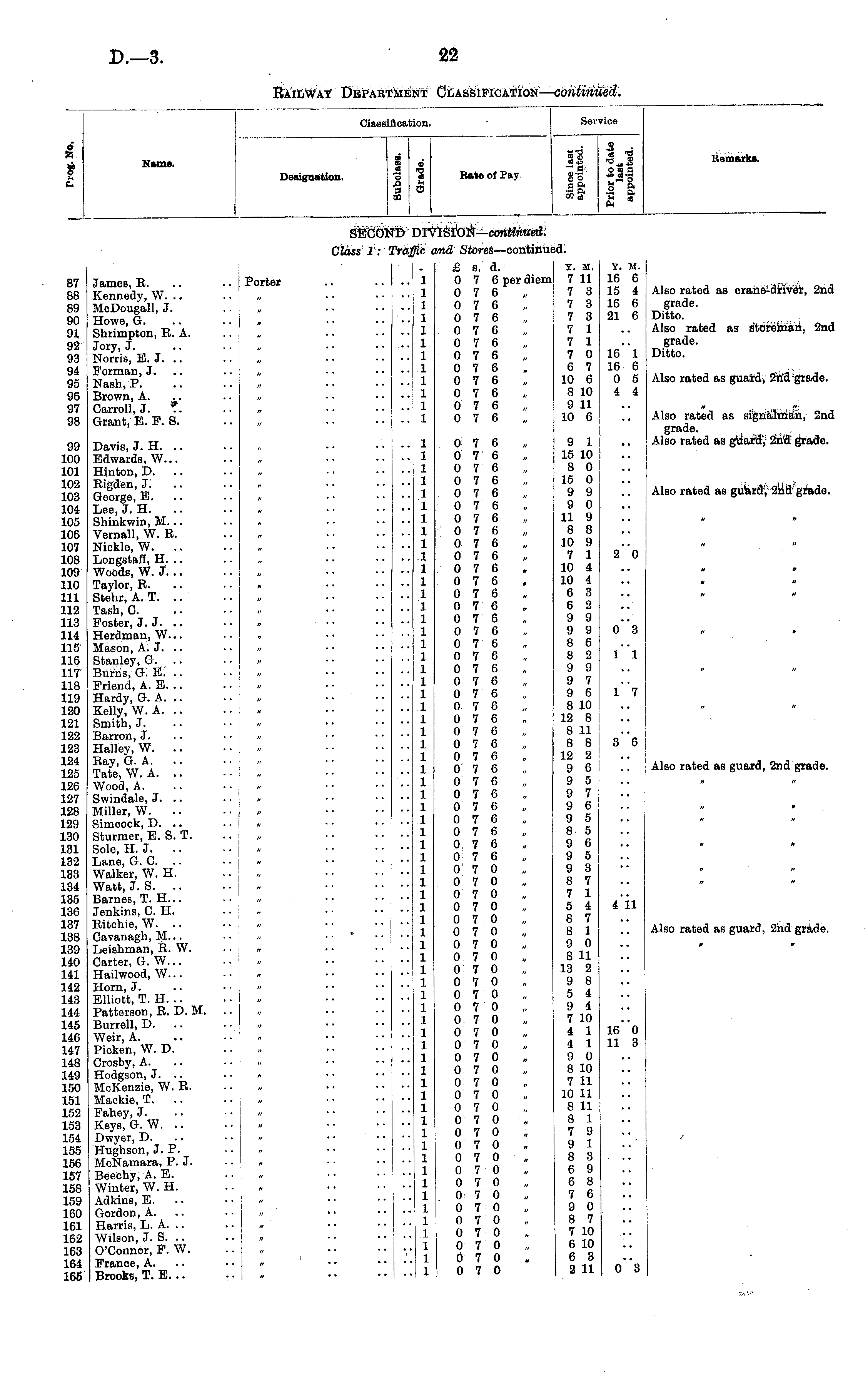 Class: Location. Service d A Name. Designation. m m CO cd & Rate of Pay ~* B o co a g& 8 & w cd S 7 fc Remarks. SECOl ic ISION— continued. 87 88 89 90 91 92 93 94 95 96 97 98 James, R. Kennedy, W. .. MoDougall, J. Howe, G. Shrimpton, R. A. Jory, J. Norris, E. J. Forman, J. Nash, P. Brown, A. Carroll, J. * Grant, E. F. S. Porter Class 1: Yaj 1 1 1 1 1 1 1 1 1 1 1 1 md Stores —continue £ s. d. 0 7 6 per diem 0 7 6 0 7 6 0 7 6 0 7 6 0 7 6 0 7 6 0 7 6 0 7 6 0 7 6 0 7 6 0 7 6 :d. Y. M. 7 11 7 3 7 3 7 3 7 1 7 1 7 0 6 7 10 6 8 10 9 11 10 6 Y. M. 16 6 15 4 16 6 21 6 Also rated as orane-driver, 2nd grade. Ditto. Also rated as storeman, 2nd grade. Ditto. 16 1 16 6 0 5 4 4 Also rated as guard, 2nd grade. 9 1 15 10 8 0 15 0 9 9 9 0 11 9 8 8 10 9 7 1 10 4 10 4 6 3 6 2 9 9 9 9 8 6 8 2 9 9 9 7 9 6 8 10 12 8 8 11 8 8 12 2 9 6 9 5 9 7 9 6 9 5 8 5 9 6 9 5 9 3 8 7 7 1 5 4 8 7 8 1 9 0 8 11 13 2 9 8 5 4 9 4 7 10 4 1 4 1 9 0 8 10 7 11 10 11 8 11 8 1 7 9 9 1 8 3 6 9 6 8 7 6 9 0 8 7 7 10 6 10 6 3 2 11 Also rated as signalman, 2nd grade. Also rated as guard, 2nd grade. 99 100 101 102 103 104 105 106 107 108 109 110 111 112 113 114 115 116 117 118 119 120 121 122 123 124 125 126 127 128 129 130 131 132 133 134 135 136 137 138 139 140 141 142 143 144 145 146 147 148 149 150 151 152 153 154 155 156 157 158 159 160 161 162 163 164 165 Davis, J. H. Edwards, W... Hinton, D. Rigden, J. George, E. Lee, J. H. Shinkwin, M... Vernall, W. R. Nickle, W. .. Longstaff, H. .. Woods, W. J. .. Taylor, R. Stehr, A. T. Tash, C. Foster, J.J. Herdman, W... Mason, A. J. Stanley,G. Burns, G. E. Friend, A. E. .. Hardy, G. A. Kelly, W. A. Smith, J. Barron, J. Halley, W. .. Ray, G. A. Tate, W. A. Wood, A. Swindale, J. .. Miller, W. Simoock, D. .. Sturmer, E. S. T. Sole, H. J. Lane, G. 0. Walker, W. H. Watt, J. S. Barnes, T. H... Jenkins, 0. H. Ritohie, W. .. Cavanagh, M... Leishman, R. W. Carter, G. W... Hailwood, W... Horn, J. Elliott, T. H. .. Patterson, R. D. M. Burrell, D. .. Weir, A. Picken, W. D. Crosby,A. Hodgson, J. .. McKenzie, W. R. Mackie, T. .. Fahey, J. Keys, G. W. Dwyer, D. Hughson, J. P. McNamara, P. J. Beechy, A. E. Winter, W. H. Adkins, E. Gordon, A. Harris, L. A. Wilson, J. S. O'Connor, F. W. France, A. Brooks, T. E. .. 1 1 1 1 1 1 1 1 1 1 1 1 1 1 1 1 1 1 1 1 1 1 1 1 1 1 1 1 1 1 1 1 1 1 1 1 1 1 1 1 1 1 1 1 1 1 1 1 1 1 1 1 1 1 1 1 1 1 1 1 1 1 1 1 1 1 1 0 7 6 0 7 6 0 7 6 0 7 6 0 7 6 0 7 6 0 7 6 0 7 6 0 7 6 0 7 6 0 7 6 0 7 6 0 7 6 0 7 6 0 7 6 0 7 6 0 7 6 0 7 6 0 7 6 0 7 6 0 7 6 0 7 6 0 7 6 0 7 6 0 7 6 0 7 6 0 7 6 0 7 6 0 7 6 0 7 6 0 7 6 0 7 6 0 7 6 0 7 6 0 7 0 0 7 0 0 7 0 0 7 0 0 7 0 0 7 0 0 7 0 0 7 0 0 7 0 0 7 0 0 7 0 0 7 0 0 7 0 0 7 0 0 7 0 0 7 0 0 7 0 0 7 0 0 7 0 0 7 0 0 7 0 0 7 0 0 7 0 0 7 0 0 7 0 0 7 0 0 7 0 0 7 0 0 7 0 0 7 0 0 7 0 0 7 0 0 7 0 2"o o"3 l"l 1*7 3"6 Also rated as guard, 2nd grade. » « a * Also rated as guard, 2nd grade. 4*il Also rated as guard, 2nd grade. 16 0 11 3 : o'*3 #