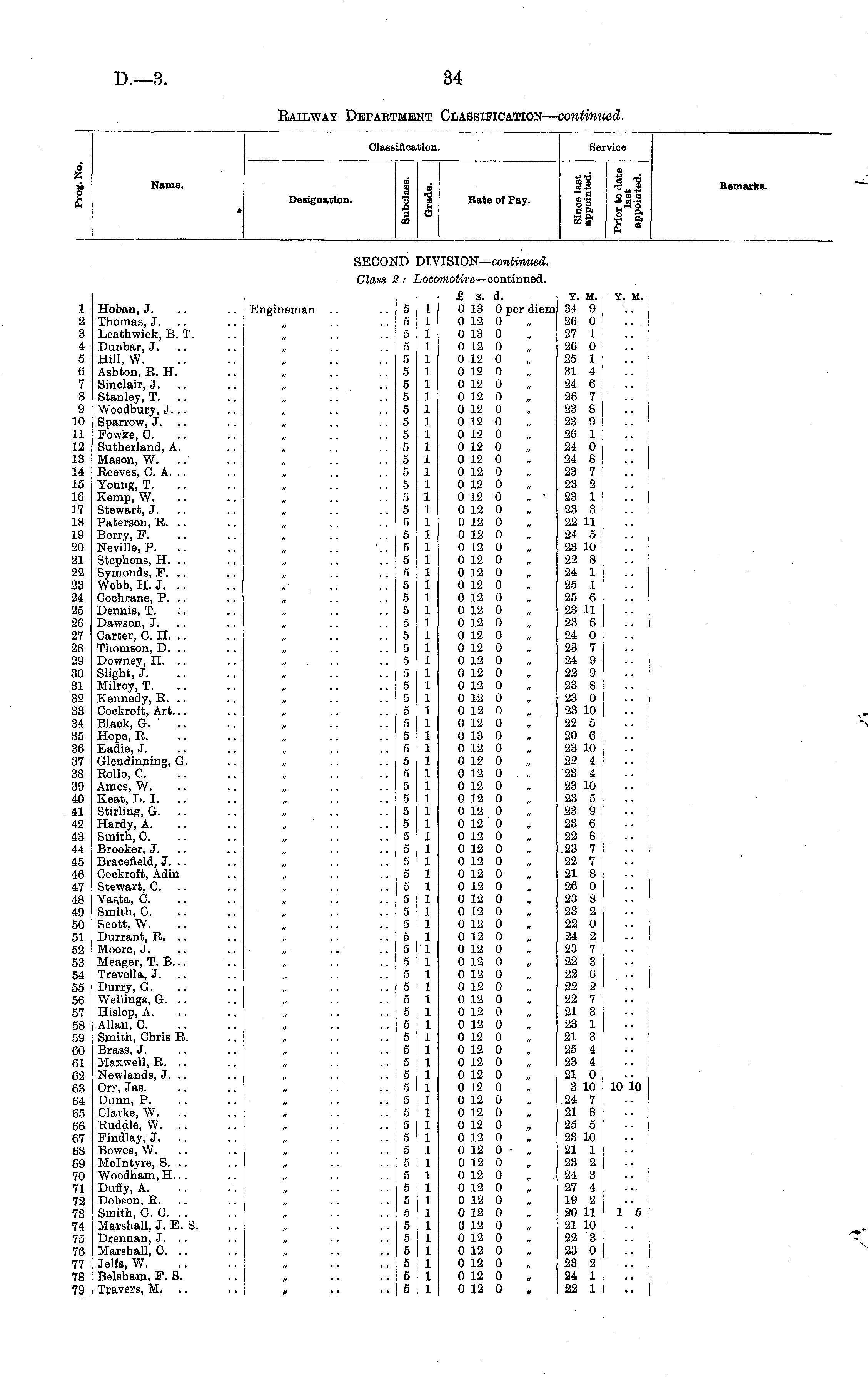d A i fc Name. Classi Lfical ,ion. Rate of Pay. oi .9 O 9 B 8§ **-3 •9g S I Service Designation. cd co £ "o A 3 00 s Remarks. seco: D )P VISION— continued. Class j ; tOCi motive —continued. 1 2 3 4 5 6 7 8 9 10 11 12 13 14 15 16 17 18 19 20 21 22 23 24 25 26 27 28 29 30 31 32 33 34 35 36 37 38 39 40 41 42 43 44 45 46 47 48 49 50 51 52 53 54 55 56 57 58 59 60 Gl 62 63 64 65 66 67 68 69 70 71 72 73 74 75 76 77 78 79 Hoban, J. Thomas, J. Leathwiok, B. T. Dunbar, J. Hill, W. Ashton, R. H. Sinclair, J. Stanley, T. .. Woodbury, J... Sparrow, J. Fowke, C. Sutherland, A. Mason, W. Reeves, C A. .. Young, T. Kemp, W. Stewart, J. Paterson, R. .. Berry, F. Neville, P. Stephens, H. .. Symonds, F. .. Webb, H. J. Cochrane, P. .. Dennis, T. Dawson, J. Carter, 0. H. .. Thomson, D. .. Downey, H. .. Slight, J. Milroy, T. Kennedy, R. .. Cockroft, Art... Black, G. ' Hope, R. Eadie, J. Glendinning, G. Rollo, C. Ames, W. Keat, L. I. Stirling, G. .. Hardy, A. Smith, 0. Brooker, J. Bracefield, J. .. Cockroft, Adin Stewart, 0. Vas,ta, C Smith, C. Scott, W. Durrant, R. .. Moore, J. Meager, T. B... Trevella, J. .. Durry, G. Wellings, G. .. Hislop, A. Allan, C. Smith, Chris R. Brass, J. Maxwell, R. .. Newlands, J. .. Orr, Jas. Dunn, P. Clarke, W. .. Ruddle, W. .. Findlay, J, Bowes, W. Mclntyre, S. .. Woodham, H... Duffy, A. ... Dobson, R. Smith, G. 0. Marshall, J. E. S. Drennan, J. .. Marshall, 0. .. Jelfs, W. Belsham, F. S, Travers, M, ,, Engineman 5 5 5 5 5 5 5 5 5 5 5 5 5 5 5 5 5 5 5 5 5 5 5 5 5 5 5 5 5 5 5 5 5 5 5 5 5 5 5 5 5 5 5 5 5 5 5 5 5 5 5 5 5 5 5 5 5 5 5 5 5 5 5 5 5 5 5 5 5 5 5 5 5 5 5 5 5 5 5 1 1 1 1 1 1 1 1 1 1 1 1 1 1 1 1 1 1 1 1 1 1 1 1 1 1 1 1 1 1 1 1 1 1 1 1 1 1 1 1 1 1 1 1 1 1 1 1 1 1 1 1 1 1 1 1 1 1 1 1 1 1 1 1 1 1 1 1 1 1 1 1 1 1 1 1 1 1 1 £ s. d. 0 13 0 per diem 0 12 0 0 13 0 0 12 0 0 12 0 0 12 0 0 12 0 0 12 0 0 12 0 0 12 0 0 12 0 0 12 0 0 12 0 0 12 0 0 12 0 0 12 0 0 12 0 0 12 0 0 12 0 0 12 0 0 12 0 0 12 0 0 12 0 0 12 0 0 12 0 0 12 0 0 12 0 0 12 0 0 12 0 0 12 0 0 12 0 0 12 0 0 12 0 0 12 0 0 13 0 0 12 0 0 12 0 0 12 0 0 12 0 0 12 0 0 12 0 0 12 0 0 12 0 0 12 0 0 12 0 0 12 0 0 12 0 0 12 0 0 12 0 0 12 0 0 12 0 0 12 0 0 12 0 0 12 0 0 12 0 0 12 0 0 12 0 0 12 0 0 12 0 0 12 0 0 12 0 0 12 0 0 12 0 0 12 0 0 12 0 0 12 0 0 12 0 0 12 0 „ 0 12 0 0 12 0 0 12 0 0 12 0 0 12 0 0 12 0 0 12 0 0 12 0 0 12 0 0 12 0 0 12 0 Y. M. 34 9 26 0 27 1 26 0 25 1 31 4 24 6 26 7 23 8 23 9 26 1 24 0 24 8 23 7 23 2 23 1 23 3 22 11 24 5 23 10 22 8 24 1 25 1 25 6 23 11 23 6 24 0 23 7 24 9 22 9 23 8 23 0 23 10 22 5 20 6 23 10 22 4 23 4 23 10 23 5 23 9 23 6 22 8 .23 7 22 7 21 8 26 0 23 8 23 2 22 0 24 2 23 7 22 3 22 6 22 2 22 7 21 3 23 1 21 3 25 4 23 4 21 0 3 10 24 7 21 8 25 5 23 10 21 1 23 2 24 3 27 4 19 2 20 11 21 10 22 3 23 0 23 2 24 1 22 1 y. m. 10 io 1 5 a u * *