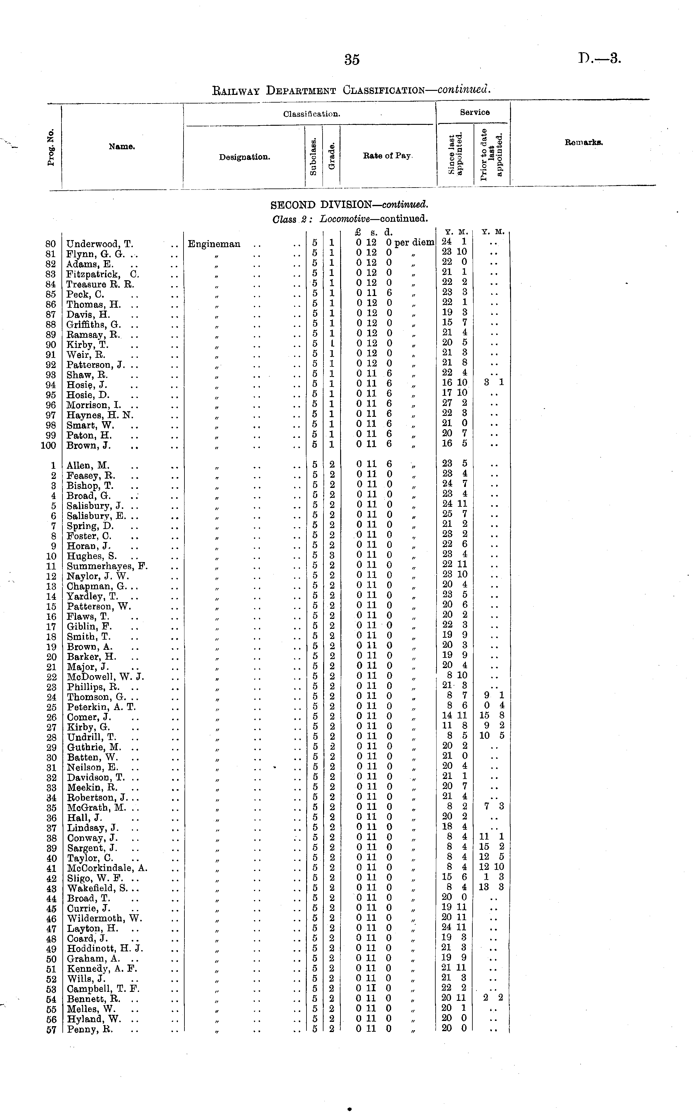Classificatio: Service 6 A ci o fa fc Name. Designation. cd co £ a A 3 CO © fa o Rate of Pay is ij if sal S - 8 ft fa. Remarks. SECOI ID m 'ISION— continued. Class . i. toei nnotive —continued. 80 81 82 S3 84 85 86 87 88 89 90 91 92 98 94 95 9G 97 98 99 .00 Underwood, T. Flynn, G. G. .-. Adams, E. Fitzpatrick, C. Treasure R. R. Peck, C Thomas, H. .. Davis, H. Griffiths, G. .. Ramsay, R. Kirby, T. Weir, R. Patterson, J. .. Shaw, R. Hosie, J. Hosie, D. Morrison, I. .. Haynes, H. N. Smart, W. Paton, H. Brown, J. Engineman 5 5 5 5 5 5 5 5 5 5 5 5 5 5 5 5 5 5 5 5 5 1 1 1 1 1 1 1 1 1 1 t 1 1 1 1 1 1 1 1 1 1 £ s. d. 0 12 0 per diem 0 12 0 0 12 0 0 12 0 0 12 0 0 11 6 0 12 0 0 12 0 0 12 0 0 12 0 0 12 0 0 12 0 0 12 0 0 11 6 0 11 6 0 11 6 0 11 6 0 11 6 0 11 6 0 11 6 0 11 6 Y. M. 24 1 23 10 22 0 21 1 22 2 23 3 22 1 19 3 15 7 21 4 20 5 21 3 21 8 22 4 16 10 17 10 27 2 22 3 21 0 20 7 16 5 Y. M. 3"l 1 2 3 4 5 6 7 8 9 10 .1.1 12 13 14 15 16 17 18 19 20 21 22 23 24 25 2G 27 28 29 30 81 32 33 34 35 36 37 38 39 40 41 42 43 44 45 46 47 48 49 50 51 52 53 54 55 56 57 Allen, M. Feasey, R. Bishop, T. Broad, G. Salisbury, J. .. Salisbury, E. .. Spring, D. Foster, 0. Horan, J. Hughes, S. Summerhayes, F. Naylor, J. W. Chapman, G. .. Yardley, T. .. Patterson, W. Flaws, T. Giblin, F. Smith, T. Brown, A. Barker, H. Major, J. McDowell, W. J. Phillips, R. .. Thomson, G. .. Peterkin, A. T. Comer, J. Kirby, G. Undrill, T. .. Guthrie, M. .. Batten, W. .. Neilson, E. Davidson, T. .. Meekin, R. Robertson, J. .. MoGrath, M. Hall, J. Lindsay, J. Conway, J. Sargent, J. Taylor, C. McCorkindale, A. Sligo, W. F. Wakefield, S. .. Broad,T. Currie, J. Wildermoth, W. Layton, H. Coard, J. Hoddinott, H. J. Graham, A. .. Kennedy, A. F. Wills, J. Campbell, T. F. Bennett, R. .. Melles, W. .. Hyland, W. .. Penny, R. 5 5 5 5 5 5 5 5 5 5 5 5 5 5 5 5 5 5 5 5 5 5 5 5 5 5 5 5 5 5 5 5 5 5 5 5 5 5 5 5 5 5 5 5 5 5 5 5 5 5 5 5 5 5 5 5 5 2 2 2 2 2 2 2 2 2 8 2 2 2 2 2 2 2 2 2 2 2 2 2 2 2 2 2 2 2 2 2 2 2 2 2 2 2 2 2 2 2 2 2 2 2 2 2 2 2 2 2 2 2 2 2 2 2 0 11 6 0 11 0 0 11 0 0 11 0 0 11 0 0 11 0 0 11 0 0 11 0 0 11 0 0 11 0 0 11 0 0 11 0 0 11 0 0 11 0 0 11 0 0 11 0 0 11 0 0 11 o 0 11 o 0 11 0 0 11 0 0 11 o 0 11 0 0 11 0 0 11 0 0 11 0 0 11 o 0 11 0 0 11 0 0 11 0 0 11 0 0 11 0 0 11 0 0 11 0 0 11 0 0 11 0 0 11 0 0 11 0 0 11 0 0 11 0 0 11 0 0 11 0 0 11 0 0 11 0 0 11 0 0 11 0 0 11 0 0 11 0 0 11 0 0 11 0 0 11 0 0 11 0 0 II 0 0 11 0 0 11 0 0 11 0 0 11 0 23 5 23 4 24 7 23 4 24 11 25 7 21 2 23 2 22 6 23 4 22 11 23 10 20 4 23 5 20 6 20 2 22 3 19 9 20 3 19 9 20 4 8 10 21 3 8 7 8 6 14 11 11 8 8 5 20 2 21 0 20 4 21 1 20 7 21 4 8 2 20 2 18 4 8 4 8 4 8 4 8 4 15 6 8 4 20 0 19 11 20 11 24 11 19 3 21 3 19 9 21 11 21 3 22 2 20 11 20 1 20 0 20 0 9 1 0 4 15 8 9 2 10 5 7'~3 11 1 15 2 12 5 12 10 1 3 13 3 2"2