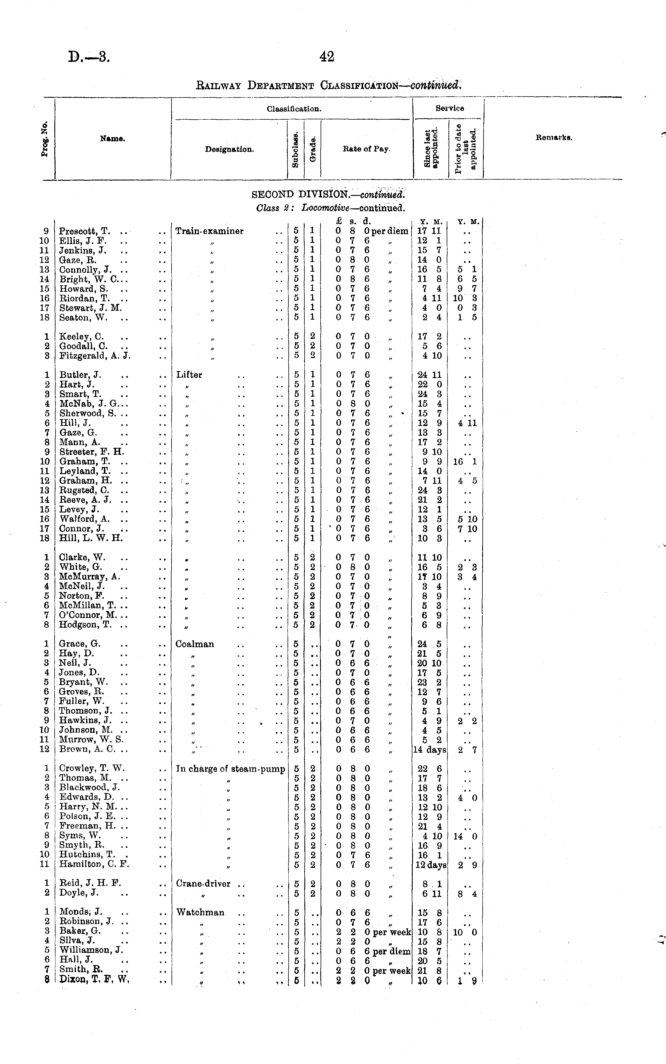 Classification. Service d A I Name. Designation. cd £ ■o •B X oo Rate of Pay. o Si's -£ "3 S3 4„s „ a o co a 83 ~«-3 •9g 2 ft co a fa S fc Remarks. SECON >IV ISION.— continued. Class i. ZtOC( >motive —continued. 9 10 11 12 13 14 15 16 17 IS Prescott, T. Ellis, J. F. Jenkins, J. Gaze, R. Connolly, J. .. Bright, W. C... Howard, S. Riordan, T. .. Stewart, J. M. Seaton, W. .. Train-examiner 5 5 5 5 5 5 5 5 5 5 1 1 1 1 1 1 1 1 1 1 £ s. d. 0 8 0 per diem 0 7 6 0 7 6 0 8 0 0 7 6 0 8 6 0 7 6 0 7 6 0 7 6 0 7 6 Y. M. 17 11 12 1 15 7 14 0 16 5 11 8 7 4 4 11 4 0 2 4 Y. M. 5 1 6 5 9 7 10 3 0 3 1 5 1 2 3 Keeley, 0. Goodall, 0. .. Fitzgerald, A. J. 5 5 5 2 2 2 0 7 0 0 7 0 0 7 0 17 2 5 6 4 10 1 2 3 4 5 6 7 8 9 10 11 12 13 14 15 16 17 18 Butler, J. Hart, J. Smart, T. McNab, J. G... Sherwood, S. .. Hill, J. Gaze, G. Mann, A. Streeter, F. H. Graham, T. .. Leyland, T. .. Graham, H. .. Rugsted, C Reeve, A. J. Levey, J. Walford, A. .. Connor, J. Hill, L. W. H. Lifter 5 5 5 5 5 5 5 5 5 5 5 5 5 5 5 5 5 5 1 1 1 1 1 1 1 1 1 1 1 1 1 1 1 1 1 1 0 7 6 0 7 6 0 7 6 0 8 0 0 7 6 0 7 6 0 7 6 0 7 6 0 7 6 0 7 6 0 7 6 0 7 6 0 7 6 0 7 6 0 7 6 0 7 6 0 7 6 0 7 6 24 11 22 0 24 3 15 4 15 7 12 9 13 3 17 2 9 10 ; 9 9 ! 14 0 7 11 24 3 21 2 12 1 13 5 3 6 10 3 4 il 16 1 4 - 5 5 io 7 10 1 2 3 4 5 6 7 8 Clarke, W. .. White, G. McMurray, A. McNeil, J. .. Norton, F. McMillan, T. .. O'Connor, M. .. Hodgson, T. .. 5 5 5 5 5 5 5 5 2 2 2 2 2 2 2 2 0 7 0 0 8 0 0 7 0 0 7 0 0 7 0 „ 0 7 0 0 7 0 0 7 0 11 10 16 5 17 10 3 4 8 9 5 3 6 9 6 8 2*3 3 4 1 2 3 4 5 6 7 8 9 10 11 12 Grace, G. Hay, D. Neil, J. Jones, D. Bryant, W. .. Groves, R. Fuller, W. .. Thomson, J. .. Hawkins, J. .. Johnson, M. .. Murrow, W. S. Brown, A. C. Coalman 5 5 5 5 5 5 5 5 5 5 5 5 0 7 0 0 7 0 0 6 6 0 7 0 0 6 6 0 6 6 0 6 6 0 6 6 0 7 0 0 6 6 0 6 6 0 6 6 24 5 21 5 20 10 17 5 23 2 12 7 9 6 5 1 4 9 4 5 5 2 14 days 2"2 2"7 1 2 3 4 5 6 7 8 9 10 11 Crowley, T. W. Thomas, M. .. Blackwood, J. Edwards, D. .. Harry, N. M. .. Poison, J. E. Freeman, H. .. Syms, W. Smyth, R. Hutchins, T. . Hamilton, C. F. In charge of steam-pump 5 5 5 5 5 5 5 5 5 5 5 2 2 2 2 2 2 2 2 2 2 2 0 8 0 0 8 0 0 8 0 0 8 0 0 8 0 0 8 0 0 8 0 0 8 0 0 8 0 0 7 6 0 7 6 22 6 17 7 18 6 13 2 12 10 12 9 21 4 4 10 16 9 16 1 12 days 4 - 0 14 0 2"9 1 2 Reid, J. H. F. Doyle, J. Crane-driver 5 5 2 2 0 8 0 0 8 0 8 1 6 11 8' 4 1 2 3 4 5 6 7 8 Monds, J. Robinson, J. .. Baker, G. Silva, J. Williamson, J. Hall, J. Smith, R. Dixon, T, F, W, Watchman 5 5 5 5 5 5 5 5 0 6 6 0 7 6 2 2 0 per week 2 2 0 0 6 6 per diem 0 6 6 , 2 2 0 per week 2 8 0 „ 15 8 17 6 10 8 15 8 18 7 20 5 21 8 10 6 io"o l"» tt i, ,.