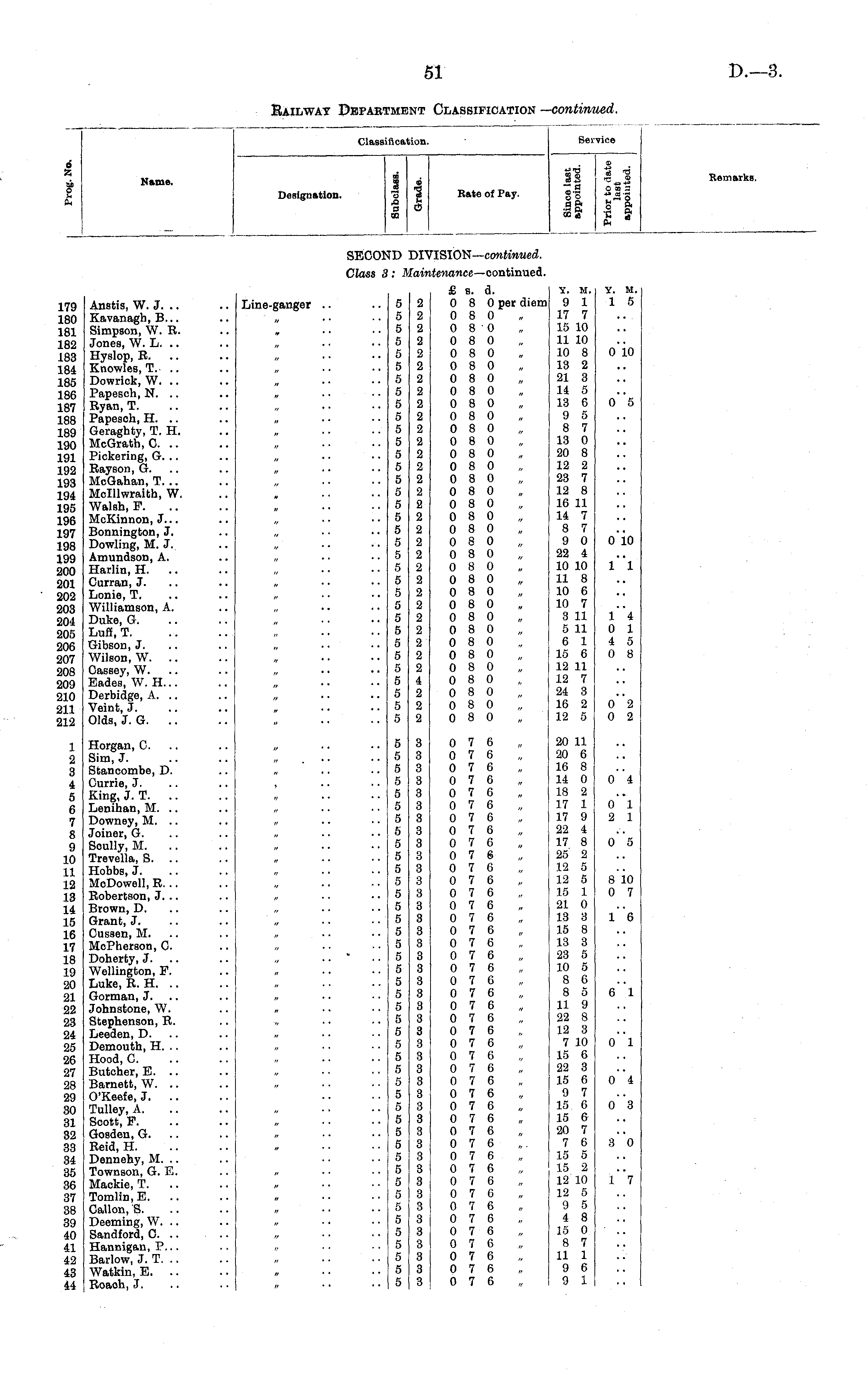 Classification. Service i ti o u Name. Designation. no I "o A a oo o 1 & Rate of Pay. is hi ~1 fl o m 3 II I | fc " Remarks. SECOM ;d DI' VISION— continued. Class 3 r ai; itenance— continued. 179 180 181 182 183 184 185 186 187 188 189 190 191 192 193 194 195 196 197 198 199 200 201 202 203 204 205 206 207 208 209 210 211 212 Anstis, W. J. Kavanagh, B... Simpson, W. R. Jones, W. L. Hyslop, R. Knowles, T. .. Dowrick, W. .. Papesch, N. .. Ryan, T. Papesoh, H. .. Geraghty, T. H. McGrath, 0. .. Pickering, G. .. Rayson, G. McGahan, T. .. Mclllwraith, W. Walsh, F. McKinnon, J... Bonnington, J. Dowling, M. J. Amundson, A. Harlin, H. .. Curran, J. Lonie, T. Williamson, A. Duke, G. Luff, T. Gibson, J. Wilson, W. .. Cassey, W. Eades, W. H... Derbidge, A. .. Veint, J. Olds, J. G. Line-ganger .. 5 5 5 5 5 5 5 5 5 5 5 5 5 5 5 5 5 5 5 5 5 5 5 5 5 5 5 5 5 5 5 5 5 5 2 2 2 2 2 2 2 2 2 2 2 2 2 2 2 2 2 2 2 2 2 2 2 2 2 2 2 2 2 2 4 2 2 2 £ s. d. 0 8 0 per diem 0 8 0 0 8 0 0 8 0 0 8 0 0 8 0 0 8 0 0 8 0 0 8 0 0 8 0 0 8 0 0 8 0 0 8 0 0 8 0 0 8 0 0 8 0 0 8 0 0 8 0 0 8 0 0 8 0 0 8 0 0 8 0 0 8 0 0 8 0 0 8 0 0 8 0 0 8 0 0 8 0 0 8 0 0 8 0 0 8 0 0 8 0 0 8 0 0 8 0 Y. M. 9 1 17 7 15 10 11 10 10 8 13 2 21 3 14 5 13 6 9 5 8 7 13 0 20 8 12 2 23 7 12 8 16 11 14 7 8 7 9 0 22 4 10 10 11 8 10 6 10 7 3 11 5 11 6 1 15 6 12 11 12 7 24 3 16 2 12 5 Y. M. 1 5 o'io 0 - 5 o'io i"i 1 4 0 1 4 5 0 8 o"2 0 2 1 2 3 4 5 6 7 8 9 10 11 12 13 14 15 16 17 18 19 20 21 22 23 24 25 26 27 28 29 30 31 32 33 34 35 36 37 38 39 40 41 42 43 44 Horgan, C. Sim, J. Stancombe, D. Currie, J. King, J. T. Lenihan, M. .. Downey, M. .. Joiner, G. Soully, M. Trevella, S. .. Hobbs, J. McDowell, R. .. Robertson, J. .. Brown, D. Grant, J. Cussen, M. McPherson, 0. Doherty, J. Wellington, F. Luke, R. H. Gorman, J. Johnstone, W. Stephenson, R. Leeden, D. Demouth, H. .. Hood, C Butcher, E. Barnett, W. .. O'Keefe, J. .. Tulley, A. Scott, F. Gosden, G. Reid, H. Dennehy, M. .. Townson, G. E. Maokie, T. Tomlin, E. Callon, S. Deeming, W. .. Sandford, 0. .. Hannigan, P... Barlow, J. T. Watkin, E. .. Roaoh, J. 5 5 5 5 5 5 5 5 5 5 5 5 5 5 5 5 5 5 5 5 5 5 5 5 5 5 5 5 5 5 5 5 5 5 5 5 5 5 5 5 5 5 5 5 3 3 3 3 3 3 3 3 3 3 3 3 3 3 3 3 3 3 3 3 3 3 3 3 3 3 3 3 3 3 3 3 3 3 3 3 3 3 3 3 3 3 3 3 0 7 6 0 7 6 0 7 6 0 7 6 0 7 6 0 7 6 0 7 6 0 7 6 0 7 6 0 7 6 0 7 6 0 7 6 0 7 6 0 7 6 0 7 6 0 7 6 0 7 6 0 7 6 0 7 6 0 7 6 0 7 6 0 7 6 0 7 6 0 7 6 0 7 6 0 7 6 0 7 6 0 7 6 0 7 6 0 7 6 0 7 6 0 7 6 0 7 6 0 7 6 0 7 6 0 7 6 0 7 6 0 7 6 0 7 6 0 7 6 0 7 6 0 7 6 0 7 6 0 7 6 20 11 20 6 16 8 14 0 18 2 17 1 17 9 22 4 17 8 25 2 12 5 12 5 15 1 21 0 13 3 15 8 13 3 23 5 10 5 8 6 8 5 11 9 22 8 12 3 7 10 15 6 22 3 15 6 9 7 15 6 15 6 20 7 7 6 15 5 15 2 12 10 12 5 9 5 4 8 15 0 8 7 11 1 9 6 9 1 0 "4 0*1 2 1 0 5 8*io 0 7 16 6 "l 0 "l 0 4 0 3 3 0 1**7