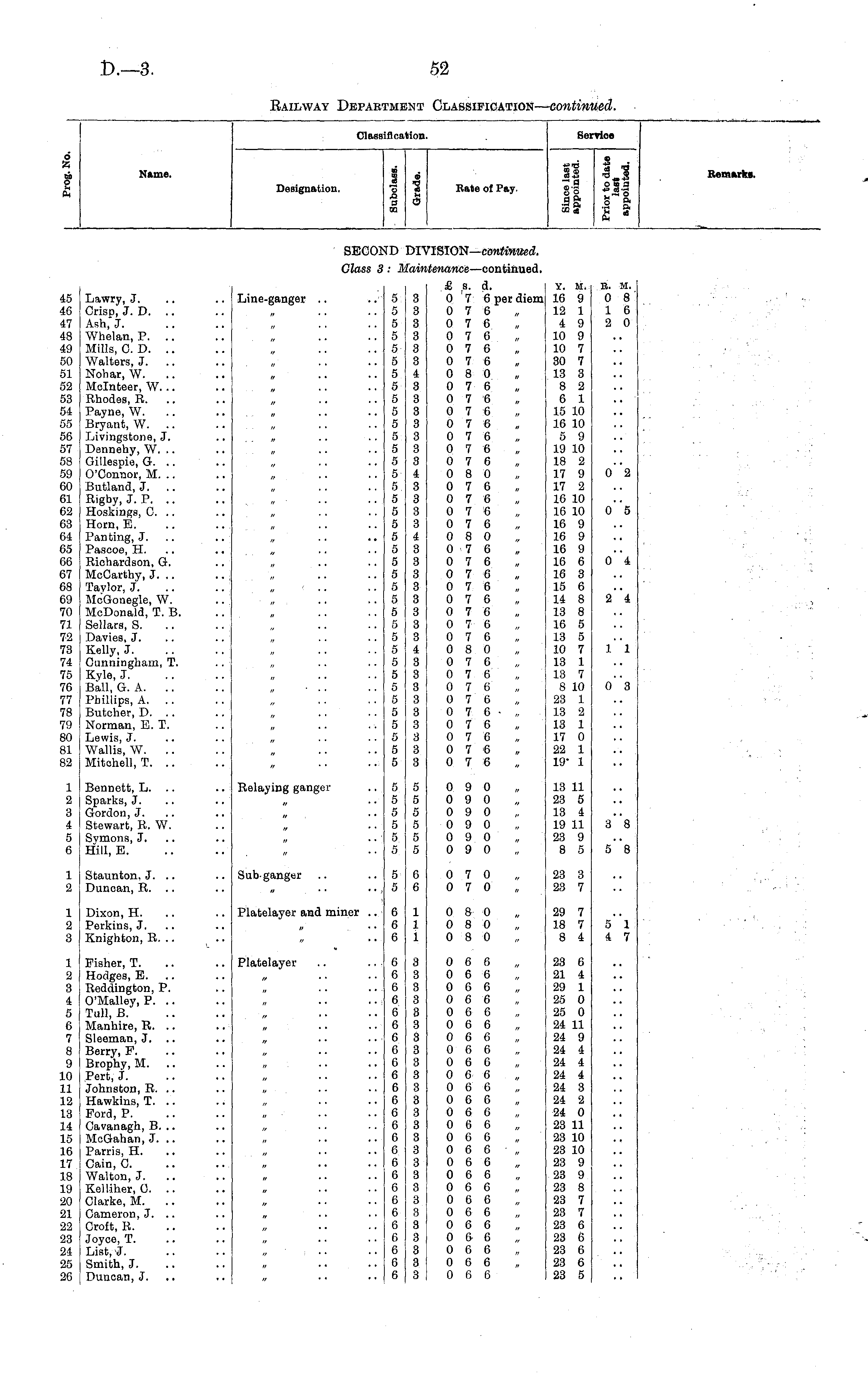 Classification. Service 6 A i fa fc Name. Designation. CO CD £ "o A a ax o ■o cd s Rate of Pay. +.tri §0 «.s o£ a& "i ft ■°-3 3S-9 .2 g & * Remarks. SECOND DP /ISION— continue d. Class 3 : J lai, •itenance —continued. !5 L6 L7 L8 L9 50 il i2 53 54 55 >6 57 58 59 i0 il i2 S3 54 io >0 57 18 59 '0 '1 '2 13 '4 15 '6 '7 '8 '9 SO il 52 Lawry, J. Crisp, J. D. Ash, J. Whelan, P. .. Mills, CD. Walters, J. Nohar, W. Mclnteer, W. .. Rhodes, R. Payne, W. Bryant, W. .. Livingstone, J. Dennehy, W. .. Gillespie, G. .. O'Connor, M. .. Butland, J. Rigby, J. P. .. Hoskings, 0. .. Horn, E. Panting, J. Pascoe, H. Richardson, G. McCarthy, J. .. Taylor, J. McGonegle, W. McDonald, T. B. Sellars, S. Davies, J. Kelly, J. Cunningham, T. Kyle, J. Ball, G. A. Phillips, A. .. Butcher, D. .. Norman, E. T. Lewis, J. Wallis, W. .. Mitchell, T. .. Line-ganger .. .. 5 ..5 ..5 ..5 tX ..5 K ..5 ..5 ..5 ..5 IX. -„ .. .. 5 . „ .. ..5 K „ • • • • 5 ..5 ..5 ..5 IX . . 5 n „ .. ..5 ..5 IX ..5 5 5 5 5 5 5 5 5 5 5 5 5 5 5 5 5 5 5 5 5 5 5 5 5 5 5 5 5 5 5 5 5 5 5 5 5 5 5 3 3 3 3 3 3 4. 3 3 3 3 3 8 3 4 3 3 3 3 4 3 3 3 3 3 3 3 3 4 3 8 3 3 3 3 3 3 3 £ s. d. 0 7 6 per diem 0 7 6 0 7 6 0 7 6 0 7 6 0 7 6 0 8 0 0 7 6 0 7 6 0 7 6 0 7 6 0 7 6 0 7 6 0 7 6 0 8 0 0 7 6 0 7 6 0 7 6 0 7 6 0 8 0 0 7 6 0 7 6 0 7 6 0 7 6 0 7 6 0 7 6 0 76 0 7 6 0 8 0 0 7 6 0 7 6 0 7 6 0 7 6 0 7 6- „ 0 7 6 0 7 6 0 7 6 0 7 6 Y. M. 16 9 12 1 4 9 10 9 10 7 30 7 13 3 8 2 6 1 15 10 16 10 5 9 19 10 18 2 17 9 17 2 16 10 16 10 16 9 16 9 16 9 16 6 16 3 15 6 14 8 13 8 16 5 13 5 10 7 13 1 13 7 8 10 23 1 13 2 13 1 17 0 22 1 19- 1 B. M. 0 8' 1 6 2 0 0 "2 0 "5 ..5 ..5 0 "4 ..5 -„ .. ..5 <-.. ..5 „ ' . . V 2 - 4 ..5 ..5 ..5 ..5 tx 1 "l ..5 ..5 ..5 0 "3 „ ■ . . . . u ..5 tx ..5 ..5 ..5 • •5 ..; 5 1 2 3 4 5 6 Bennett, L. Sparks, J. Gordon, J. Stewart, R. W. Svmons, J. Hill, E. Relaying ganger .. 5 ..5 K ..5 IX 5 5 5 5 5 5 5 5 5 5 5 5 0 9 0 0 9 0 0 9 0 0 9 0 0 9 0 0 9 0 13 11 23 5 13 4 19 11 23 9 8 5 3"8 .. 5 ..5 tx • •5 5"8 1 2 Staunton, J. .. Duncan, R. .. Sub-ganger .. .. 5 5 5 6 6 0 7 0 0 7 0 23 3 23 7 ..,5 1 2 3 Dixon,H. Perkins, J. Knighton, R. .. Platelayer and miner .. 6 ... 6 6 6 6 1 1 1 0 8 0 0 8 0 0 8 0 29 7 18 7 8 4 5 1 4 7 ..6 1 2 3 4 5 6 7 8 9 .0 :i 12 .3 .4 L5 16 .7 .8 .9 20 21 22 23 2.1 25 26 Fisher, T. Hodges, B. Reddington, P. O'Malley, P. .. Tull, B. Manhire, R. .. Sleeman, J. .. Berry, F. Brophy, M. .. Pert, J. Johnston, R. .. Hawkins, T. .. Ford, P. Cavanagh, B. .. McGahan, J. .. Parris, H. Cain, 0. Walton, J. Kelliher, 0. .. Clarke, M. Cameron, J. .. Croft, R. Joyce, T. List, J. Smith, J. Duncan, J. Platelayer .. .. 6 « ..6 a ..6 a ■•: 6 ..6 a ..6 .. 6 a ..6 a „ .. ..6 C ••6 a „ .. ..6 ..6 ..6 6 6 6 6 G G 6 6 6 6 6 6 6 6 6 6 6 6 6 6 6 6 6 G 6 6 3 3 3 3 3 3 3 8 3 3 3 3 3 3 8 3 3 3 3 3 3 3 8 3 3 3 0 6 6 0 6 6 0 6 6 0 6 6 0 6 6 0 6 6 0 6 6 0 6 6 0 6 6 0 6 6 0 6 6 0 6 6 0 6 6 0 6 6 0 6 6 0 6 6 „ 0 6 6 0 6 6 0 6 6 0 6 6 0 6 6 0 6 6 0 6 6 0 6 6 0 6 6 0 6 6 23 6 21 4 29 1 25 0 25 0 24 11 24 9 24 4 24 4 24 4 24 3 24 2 24 0 23 11 23 10 23 10 23 9 23 9 23 8 23 7 23 7 23 6 23 6 23 6 23 6 23 5 ..6 a ..6 a ..6 a ..6 ..6 ..6 ..6 a ..6 ..6 ..6 ... ..6 ..6 a ..6