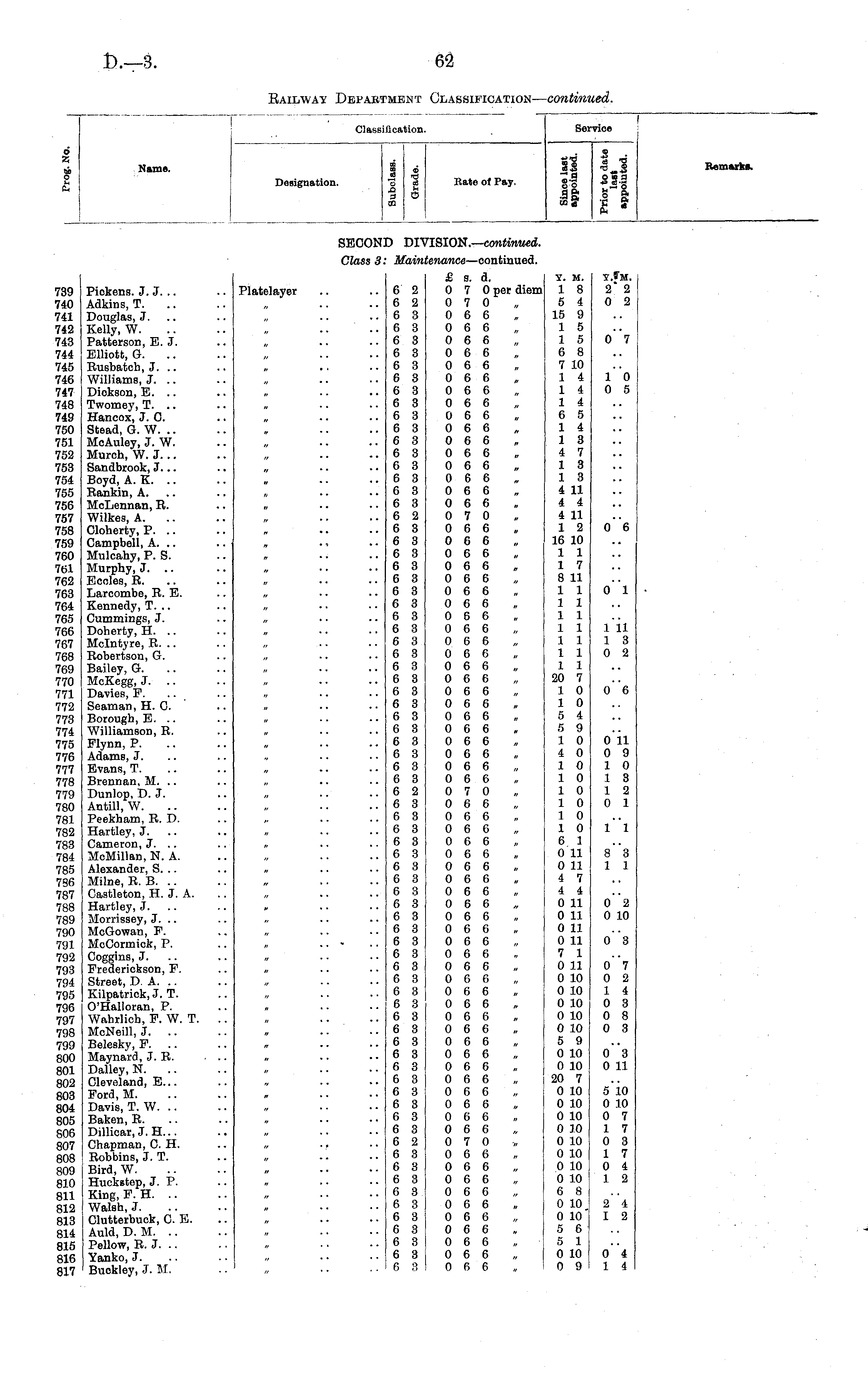 I Class: fication. Service d fa Name. Designation. tit m cd £ "B o cd 3 Ci CO Rate of Pay. +jfd si •I ■9 a ic3 CO * 'S "mi o co a I * Remarks. SECON ID DI\ ISION.— continued. Class 3 : Maim lenance —continued. 739 740 741 742 743 744 745 746 747 748 749 750 751 752 753 754 755 756 757 758 759 760 761 762 763 764 765 766 767 768 769 770 771 772 773 774 775 776 777 778 779 780 781 782 783 784 785 7S6 787 788 789 790 791 792 793 794 795 796 797 798 799 800 801 802 803 804 805 806 807 808 809 810 811 812 813 814 815 816 817 Piekens. J.J... Adkins, T. Douglas, J. Kelly, W. Patterson, E. J. Elliott, G. Rusbatch, J. Williams, J. .. Dickson, E. .. Twomey, T. .. Hancox, J. 0. Stead, G. W. McAuley, J. W. Murch, W. J. .. Sandbrook, J... Boyd, A. K. Rankin, A. MoLennan, R. Wilkes, A. Cloherty, P. .. Campbell, A. .. Mulcahy, P. S. Murphy, J. .. Ecoles, R. Larcombe, R. E. Kennedy, T. .. Cummings, J. Doherty, H. .. Mclntyre, R. .. Robertson, G. Bailey, G. McKegg, J. Davies, F. Seaman, H. C. Borough, E. Williamson, R. Flynn, P. Adams, J. Evans, T. Brennan, M. .. Dunlop, D. J. Antill, W. Peekham, R. D. Hartley, J. Cameron, J. .. McMillan, N. A. Alexander, S. .. Milne, R. B. Castleton, H. J. A. Hartley, J. Morrissey, J. .. McGowan, F. McCormick, P. Coggins, J. Frederickson, F. Street, DA. Kilpatrick, J. T. O'Halloran, P. Wahrlich, F. W. T. McNeill, J. .. Belesky, F. .. Maynard, J. R. Dalley, N. Cleveland, E... Ford, M. Davis, T. W. Baken, R. Dillicar, J. H... Chapman, 0. H. Robbins, J. T. Bird, W. Huckstep, J. P. King, F. H. Walsh, J. Clutterbuck, 0. E. Auld, D. M. Pellow, R. J. Yanko, J. Buokley, J. M. Platelayer 6 2 6 2 6 3 6 3 6 3 6 3 6 3 6 3 6 3 6 3 6 3 6 3 6 3 6 3 6 3 6 3 6 3 6 3 6 2 6 3 6 3 6 3 6 3 6 3 6 3 6 3 6 3 6 3 6 3 6 3 6 3 6 3 6 3 6 3 6 3 6 3 6 3 6 3 6 3 6 3 6 2 6 3 6 3 6 3 6 3 6 3 6 3 6 3 6 3 6 3 6 3 6 3 6 3 6 3 6 3 6 3 6 3 6 3 6 3 6 3 6 3 6 3 6 3 6 3 6 3 6 3 6 3 6 3 6 2 6 3 6 3 6 3 6 3 6 3 6 3 6 3 6 3 6 3 6 3 £ s. d. 0 7 0 per diem 0 7 0 0 6 6 0 6 6 0 6 6 0 6 6 0 6 6 0 6 6 0 6 6 0 6 6 0 6 6 0 6 6 0 6 6 0 6 6 0 6 6 0 6 6 0 6 6 0 6 6 0 7 0 0 6 6 0 6 6 0 6 6 0 6 6 0 6 6 0 6 6 0 6 6 0 6 6 0 6 6 0 6 6 0 6 6 0 6 6 0 6 6 0 6 6 0 6 6 0 6 6 0 6 6 0 6 6 0 6 6 0 6 6 0 6 6 0 7 0 0 6 6 0 6 6 0 6 6 0 6 6 0 6 6 0 6 6 0 6 6 0 6 6 0 6 6 0 6 6 0 6 6 0 6 6 0 6 6 0 6 6 0 6 6 0 6 6 0 6 6 0 6 6 0 6 6 0 6 6 0 6 6 0 6 6 0 6 6 0 6 6 0 6 6 0 6 6 0 6 6 0 7 0 0 6 6 0 6 6 0 6 6 0 6 6 0 6 6 0 6 6 0 6 6 0 6 6 0 6 6 0 6 6 Y. M. 1 8 5 4 15 9 1 5 1 5 6 8 7 10 1 4 1 4 1 4 6 5 1 4 1 3 4 7 1 3 1 3 4 11 4 4 4 11 1 2 16 10 1 1 1 7 8 11 1 1 1 1 1 1 1 1 1 1 1 1 1 1 20 7 1 0 1 0 5 4 5 9 1 0 4 0 1 0 1 0 1 0 1 0 1 0 1 0 6 1 0 11 0 11 4 7 4 4 0 11 0 11 0 11 0 11 7 1 0 11 0 10 0 10 0 10 0 10 0 10 5 9 0 10 0 10 20 7 0 10 0 10 0 10 0 10 0 10 0 10 0 10 0 10 6 8 0 10 0 10 5 6 5 1 0 10 0 9 y.Sm. 2" 2 0 2 0 "7 10 0 5 0 6 0 1 1 11 1 3 0 2 0 "6 0 11 0 9 1 0 1 3 1 2 0 1 1 "l 8"3 1 1 0 "2 0 10 0 "3 0 7 0 2 1 4 0 3 0 8 0 3 0"3 0 11 5 10 0 10 0 7 1 7 0 3 1 7 0 4 1 2 2 "4 I 2 0 "4 1 4