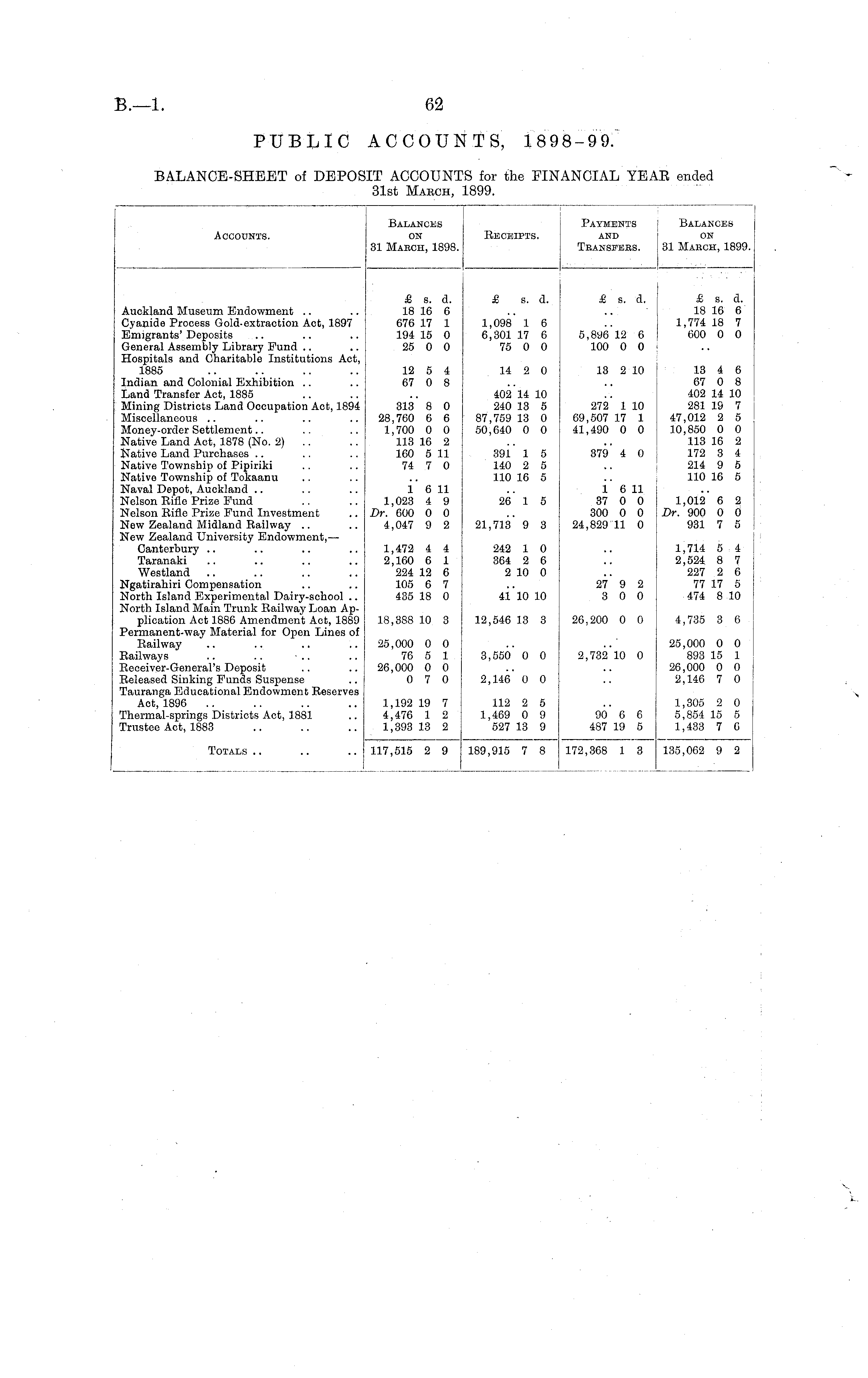Accounts. Balances on 31 Maech, 1898. Receipts. Payments AND Transfers. Balances on 31 March, 189! Auckland Museum Endowment Cyanide Process Gold-extraction Act, 1897 Emigrants' Deposits General Assembly Library Fund Hospitals and Charitable Institutions Act, 1885 Indian and Colonial Exhibition Land Transfer Act, 1885 Mining Districts Land Occupation Act, 1894 Miscellaneous Money-order Settlement Native Land Act, 1878 (No. 2) .. Native Land Purchases Native Township of Pipiriki Native Township of Tokaanu Naval Depot, Auckland Nelson Rifle Prize Fund Nelson Rifle Prize Fund Investment New Zealand Midland Railway New Zealand University Endowment, — Canterbury Taranaki Westland Ngatirahiri Compensation North Island Experimental Dairy-school .. North Island Main Trunk Railway Loan Application Act 1886 Amendment Act, 1889 Permanent-way Material for Open Lines of Railway Railways .. .. ■ .. Receiver-General's Deposit Released Sinking Funds Suspense Tauranga Educational Endowment Reserves Act, 1896 Thermal-springs Districts Act, 1881 Trustee Act, 1883 £ s. d. 18 16 6 676 17 1 194 15 0 25 0 0 £ s. d. 1,098 1 6 6,301 17 6 75 0 0 £ s. d. £ s. d. 18 16 6 1,774 18 7 600 0 0 5,896 12 6 100 0 0 12 5 4 67 0 8 14 2 0 13 2 10 13 4 6 67 0 8 402 14 10 281 19 7 47,012 2 5 10,850 0 0 113 16 2 172 3 4 214 9 5 110 16 5 313 8 0 28,760 6 6 1,700 0 0 113 16 2 160 5 11 74 7 0 402 14 10 240 13 5 87,759 13 0 50,640 0 0 272 1 10 69,507 17 1 41,490 0 0 391 1 5 140 2 5 110 16 5 379 4 0 1 6 11 1,023 4 9 Dr. 600 0 0 4,047 9 2 26 1 5 1 6 11 37 0 0 300 0 0 24,829 11 0 1,012 6 2 Dr. 900 0 0 931 7 5 21,713 9 3 1,472 4 4 2,160 6 1 224 12 6 105 6 7 435 18 0 242 1 0 364 2 6 2 10 0 27 9 2 3 0 0 1,714 5 4 2,524 8 7 227 2 6 77 17 5 474 8 10 41 10 10 18,388 10 3 12,546 13 3 26,200 0 0 4,735 3 6 25,000 0 0 76 5 1 26,000 0 0 0 7 0 3,550 0 0 2,732 10 0 25,000 0 0 893 15 1 26,000 0 0 2,146 7 0 2,146 0 0 1,192 19 7 4,476 1 2 1,393 13 2 112 2 5 1,469 0 9 527 13 9 90 6 6 487 19 5 1,305 2 0 5,854 15 5 1,433 7 0 Totals .. 117,515 2 9 189,915 7 8 172,368 1 3 135,062 9 2