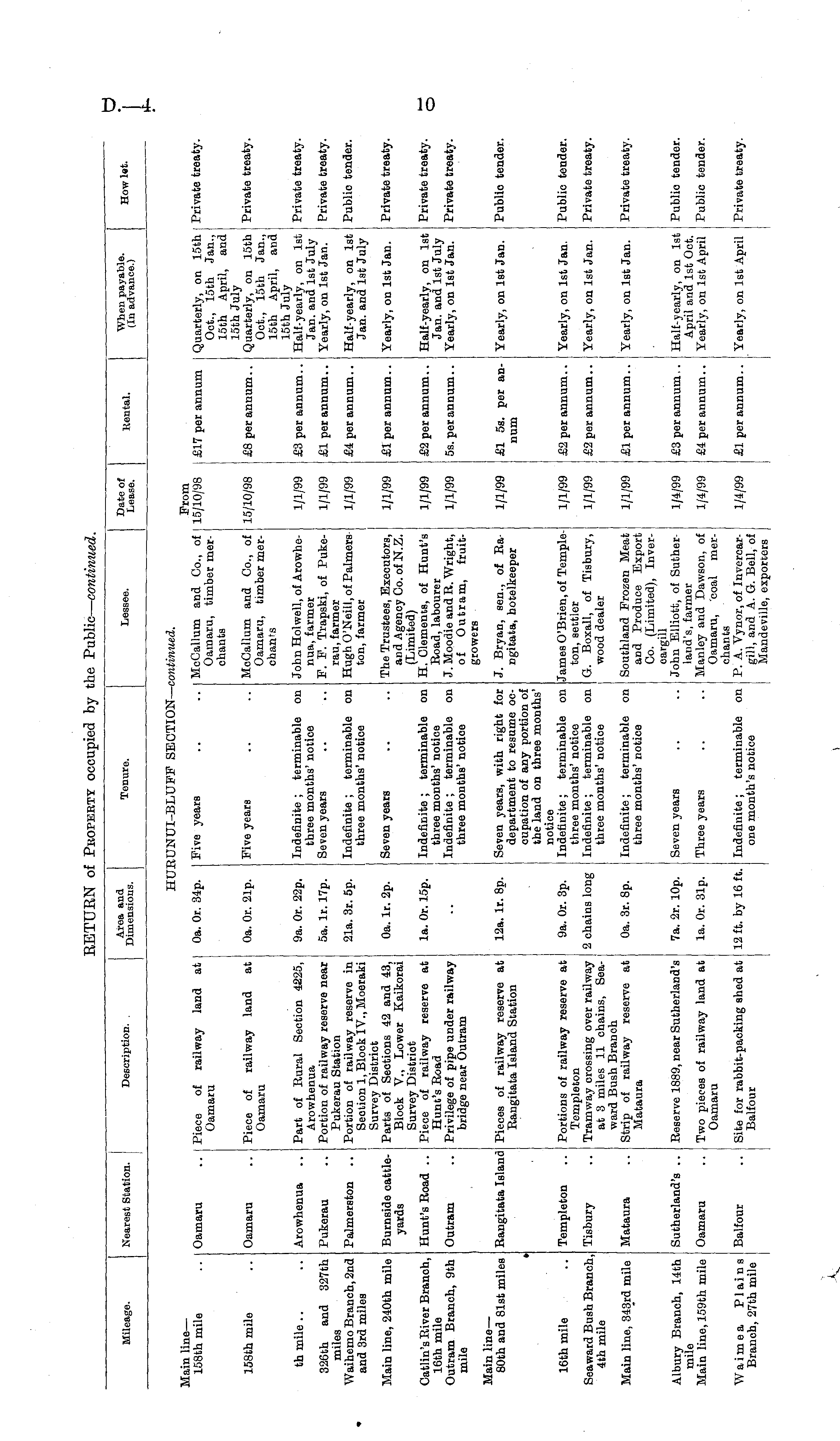 Mileage. Nearest Station. Description. . Area and Dimensions. Tenure. Lessee. Date of Lease. Rental. When payable. (In advance.) How let. hu: 1UNUI-BLUFF SECTION—( continued. Main line — 158th mile Oamaru Piece of railway land at Oamaru Oa. Or. 34p. Five years McCallum and Co., of Oamaru, timber merchants From 15/10/98 £17 per annum Quarterly, on 15th Oct., 15th Jan., 15th April, and 15th July Quarterly, on 15th Oct., 15th Jan., 15th April, and 15th July Half-yearly, on 1st Jan. and 1st July Yearly, on 1st Jan. Private treaty. 158th mile Oamaru Piece of railway land at Oamaru Oa. Or. 21p. Five years McCallum and Co., of Oamaru, timber merchants 15/10/98 £8 per annum.. Private treaty. th mile Arowhenua Part of Rural Section 4225, Arowhenua Portion of railway reserve near Pukerau Station Portion of railway reserve in Seotion 1, Block IV., Moeraki Survey District Parts of Seotions 42 and 43, Block V., Lower Kaikorai Survey Distriot Piece of railway reserve at Hunt's Road Privilege of pipe under railway bridge near Outram 9a. Or. 22p. Indefinite ; terminable on three months' notice Seven years John Holwell, of Arowhenua, farmer F. F. Trapski, of Pukerau, farmer Hugh O'Neill, of Palmers ton, farmer 1/1/99 £3 per annum.. Private treaty. 326th and 327th miles Waihemo Branch, 2nd and 3rd miles Pukerau Palmerston 5a. lr. 17p. 21a. 3r. 5p. Indefinite ; terminable on three months' notice 1/1/99 1/1/99 £1 per annum.. £4 per annum.. Half-yearly, on 1st Jan. and 1st July Private treaty. Public tender. Main line, 240th mile Burnside cattleyards Oa. lr. 2p. Seven years The Trustees, Executors, and Agency Co. of N.Z. (Limited) H. Clements, of Hunt's Road, labourer J. Moodie and R. Wright, of Outram, fruitgrowers 1/1/99 £1 per annum.. Yearly, on 1st Jan. Private treaty. Catlin's River Branch, 16th mile Outram Branch, 9th mile Hunt's Road .. la. Or. 15p. Indefinite ; terminable on three months' notice Indefinite ; terminable on three months' notioe 1/1/99 £2 per annum.. Half-yearly, on 1st Jan. and 1st July Yearly, on 1st Jan. Private treaty. Outram 1/1/99 5s. per annum.. Private treaty. Main line — 80th and 81st miles Rangitata Island Pieces of railway reserve at Rangitata Island Station 12a. lr. 8p. Seven years, with right for department to resume occupation of any portion of the land on three months' notice Indefinite; terminable on three months' notice Indefinite; terminable on three months' notice J. Bryan, sen., of Ra ngitata, hotelkeeper 1/1/99 £1 5s. per annum Yearly, on 1st Jan. Publio tender. • Templeton Portions of railway reserve at Templeton Tramway crossing over railway at 3 miles 11 chains, Seaward Bush Branch Strip of railway reserve at Mataura 9a. Or. 3p. James O'Brien, of Templeton, settler G. Boxall, of Tisbury, wood dealer 1/1/99 £2 per annum.. Yearly, on 1st Jan. Public tender. 16th mile Seaward Bush Branch, 4th mile Tisbury 2 chains long 1/1/99 £2 per annum.. j Yearly, on 1st Jan. Private treaty. Main line, 343rd mile Mataura Oa. 3r. 8p. Indefinite; terminable on three months' notice Southland Frozen Meat and Produce Export Co. (Limited), Inveroargill John Elliott, of Sutherland's, farmer Manley and Dawson, of Oamaru, coal merchants P. A. Vynor, of Inveroargill, and A. G. Bell, of Mandeville, exporters 1/1/99 £1 per annum.. Yearly, on 1st Jan. Private treaty. Albury Branch, 14th mile Main line, 159th mile Sutherland's .. Reserve 1889, near Sutherland's 7a. 2r. lOp. Seven years 1/4/99 £3 per annum,. Half-yearly, on 1st April and 1st Oct. Yearly, on 1st April Publio tender. Oamaru Two pieces of railway land at Oamaru la. Or. 31p. Three years 1/4/99 £4 per annum.. Public tender. Waimea Plains Branch, 27th mile Balfour Site for rabbit-packing shed at Balfour 12 ft. by 16 ft. Indefinite; terminable on one month's notice 1/4/99 £1 per annum.. Yearly, on 1st April Private treaty.