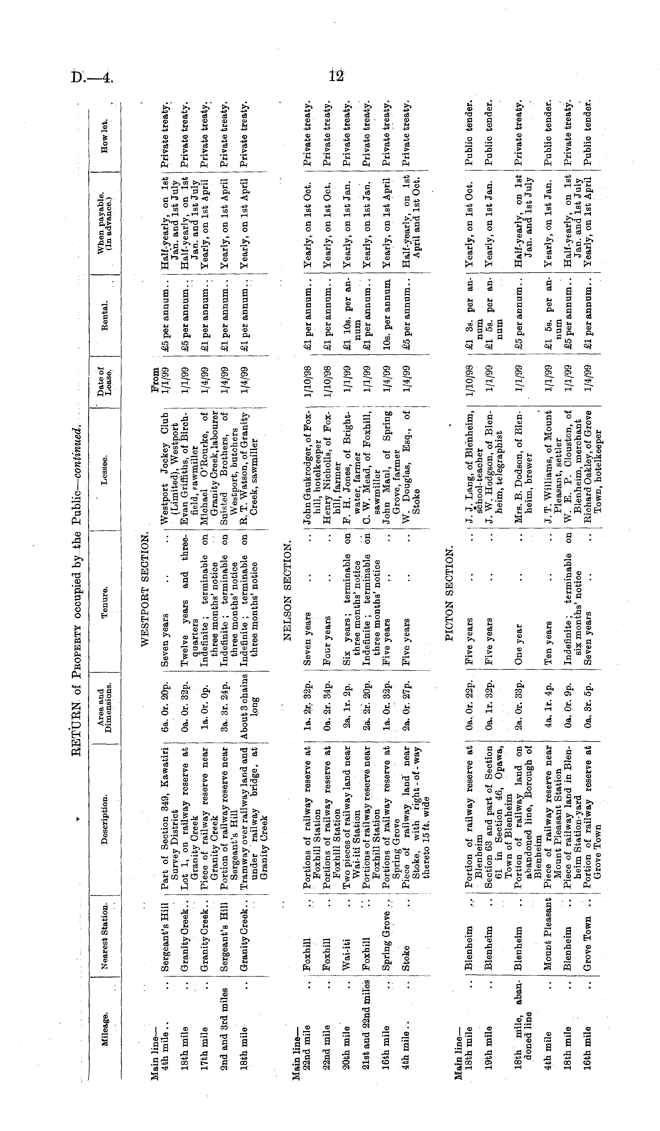 Mileage. Nearest Station. Description. Area and Dimensions. Tenure. Lessee. Date of Lease. Rental. When payable. (In advance.) How let. WESTPORT SECTION. Main line — 4th mile Sergeant's Hill Part of Section 349, Kawatiri Survey District Granity Creek.. Lot 1, on railway reserve at Granity Creek Granity Creek.. Pieoe of railway reserve near Granity Creek Sergeant's Hill Portion of railway reserve near Sergeant's Hill Granity Creek.. Tramway over railway land and under railway bridge, at Granity Creek 6a. Or. 20p. Seven years Twelve years and threequarters Indefinite ; terminable on three months' notice Indefinite ; terminable on three months' notice Indefinite ; terminable on three months' notice From Westport Jockey Club 1/1/99 (Limited), Westport Evan Griffiths, of Birch- 1/1/99 field, fawmiller Michael O'Rourke, of 1/4/99 Granity Creek, labourer Suisted Brothers, of 1/4/99 Westport, butchers R. T. Watson, of Granity 1/4/99 Creek, sawmiller From 1/1/99 £5 per annum.. £5 per annum.. £1 per annum.. £1 per annum.. £1 per annum.. Half-yearly, on 1st Jan. and 1st July Half-yearly, on 1st Jan. and 1st July Yearly, on 1st April Yearly, on 1st April Yearly, on 1st April Private treaty. Private treaty. Private treaty. Private treaty. Private treaty. 18th mile Oa. Or. 32p. 1/1/99 17th mile la. Or. Op. 1/4/99 2nd and 3rd miles 3a. 3r. 24p. 1/4/99 18th mile About 3 chains long 1/4/99 Main line — 22nd mile NELSON SECTION. 22nd mile 20th mile 21st and 22nd miles Foxhill .. Portions of railway reserve at Foxhill Station Foxhill .. Portions of railway reserve at Foxhill Station Wai-iti .. Two pieces of railway land near Wai-iti Station Foxhill '.'. Portions of railway reserve near Foxhill Station Spring Grove .. Portions of railway reserve at Spring Grove Stoke .. Piece of railway land near Stoke, with right - of - way thereto 15 ft. wide I la. 2r. 32p. Oa. 2r. 34p. 2a. lr. 2p. 2a. 2r. 20p. Seven years Four years Six years; terminable on three months' notice Indefinite ; terminable on three months' notice Five years .. ., Five years John Gaukrodger, of Fox- 1 1/10/98 hill, hotelkeeper Henry Nicholls, of Fox- j 1/10/98 hill, farmer F. H. Jones, of Bright- j 1/1/99 water, farmer C. W. Mead, of Foxhill, j 1/1/99 sawmiller John Maul, of Spring ! 1/4/99 Grove, farmer W. Douglas, Esq., of | 1/4/99 Stoke £1 per annum., £1 per annum.. £1 10s. per annum £1 per annum.. 10s. per annum £5 per annum.. Yearly, on 1st Oct. Yearly, on 1st Oct. Yearly, on 1st Jan. Yearly, on 1st Jan. Yearly, on 1st April Half-yearly, on 1st April and 1st Oct. Private treaty. Private treaty. Private treaty. Private treaty. Private treaty. Private treaty. 16th mile la. Or. 32p. 4th mile 2a. Or. 27p. Main line — 18th mile Blenheim .. Portion of railway reserve at Blenheim Blenheim .. Section 63 and part of Section 61 in Section 46, Opawa, Town of Blenheim Blenheim .. Portion of railway land on abandoned line, Borough of Blenheim Mount Pleasant Piece of railway reserve near Mount Pleasant Station Blenheim .. Piece of railway land in Blenheim Station-yard Grove Town .. Portion of railway reserve at Grove Town j Oa. Or. 22p. PICTON SECTION. 19th mile Oa. lr. 32p. Five years Five years J. J. Lang, of Blenheim, 1/10/98 school-teacher J. W. Hodgson, of Blen- 1/1/99 heim, telegraphist £1 3s. per annum £1 5s. per annum Yearly, on 1st Oct. Yearly, on 1st Jan. Public tender, Public tender. 18th mile, abandoned line 2a. Or. 33p. One year Mrs. B. Dodson, of Blen- 1/1/99 heim, brewer £5 per annum.. Half-yearly, on 1st Jan. and 1st July Private treaty. 4th mile 4a. lr. 4p. Ten years Indefinite; terminable on six months' notice Seven years • J. T. Williams, of Mount 1/1/99 Pleasant, settler W. E. P. Clouston, of 1/1/99 Blenheim, merchant Richard Oakley, of Grove 1/4/99 Town, hotelkeeper £1 5s. per annum £5 per annum.. £1 per annum.. Yearly, on 1st Jan. Half-yearly, on 1st Jan. and 1st July Yearly, on 1st April Public tender. Private treaty. Publio tender. 18th mile Oa. Or. 9p. 16th mile Oa. 3r. 5p.