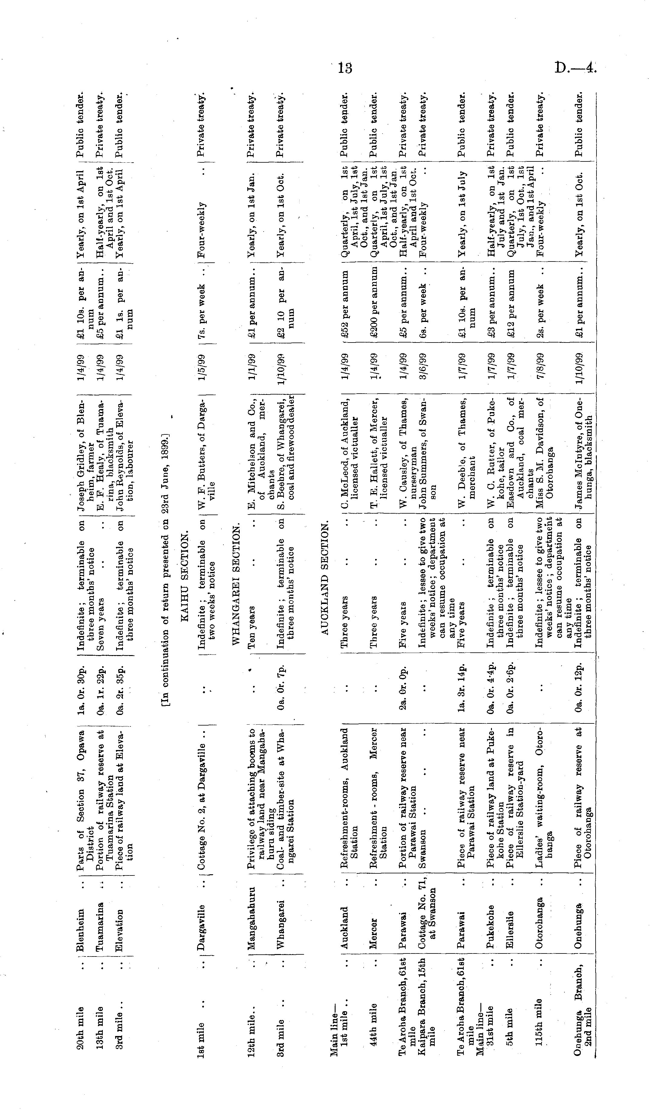 20th mile .. Blenheim .. Parts of Section 37, Opawa la. Or. 30p. Indefinite; terminable on Joseph Gridley, of Blen- 1/4/99 £1 10s. per an- Yearly, on 1st April Public tender. District three months' notice heim, farmer num 13th mile .. Tuamarina ,. Portion of railway reserve at Oa. lr. 22p. Seven years .. .. E. F. Healy, of Tuama- 1/4/99 £5 per annum.. Half-yearly, on 1st Private treaty. Tuamarina Station rina, blacksmith April and 1st Oct. 3rd mile .. .. Elevation .. Piece of railway land at Eleva- Oa. 2r. 35p. Indefinite ; terminable on John Reynolds, of Eleva- 1/4/99 £1 Is. per an- Yearly, on 1st April Public tender. tion three months' notice tion, labourer num [In continuation of return presented cn 23rd June, 1899.] KAIHU SECTION. 1st mile .. .. I Dargaville .. | Cottage No. 2, at Dargaville .. I .. j Indefinite ; terminable on I W. F. Butters, of Darga- I 1/5/99 | 7s. per week .. I Four-weekly .. I Private treaty. two weeks' notice ville WHANGAREI SECTION. 12th mile.. .. Mangahahuru Privilege of attaching booms to .. * Ten years .. .. E. Mitchelson and Co., 1/1/99 £1 per annum.. Yearly, on 1st Jan. Private treaty. railway land near Mangaha- of Auckland, merhuru siding chants 3rd mile .. .. Whangarei .. Coal- and timber-site at Wha- Oa. Or. 7p. Indefinite ; terminable on S. Beehre, of Whangarei, 1/10/99 £2 10 per an- Yearly, on 1st Oot. Private treaty. ngarei Station three months' notice coal and firewood dealer num AUCKLAND SECTION. Main line — 1st mile .. .. Auckland .. Refreshment-rooms, Auckland .. Three years .. ..IO. McLeod, of Auckland, 1/4/99 £52 per annum Quarterly, on 1st Public tender. Station licensed victualler April, 1st July, 1st Oct., and 1st Jan. 44th mile .. Mercer .. Refreshment - rooms, Mercer .. Three years .. .. T. E. Hallett, of Mercer, 1/4/99 £200 per annum Quarterly, on 1st Public tender. Station licensed victualler April, 1st July, 1st Oct., and 1st Jan. Te Aroha Branch, 61st Parawai .. Portion of railway reserve near 2a. Or. Op. Five years .. .. W. Causley, of Thames, 1/4/99 £5 per annum.. Half-yearly, on 1st Private treaty. mile Parawai Station nurseryman April and 1st Oct. Kaipara Branch, 15th Cottage No. 71, Swanson .. .. .. ... Indefinite; lessee to give two John Summers, of Swan- 3/6/99 6s. per week .. Four- weekly .. Private treaty. mile at Swanson weeks'notice; department son can resume occupation at any time Te Aroha Branoh, 61st Parawai .. Piece of railway reserve near la. 3r. Up. Five years .. .. W. Deebie, of Thames, 1/7/99 £1 10s. per an- Yearly, on 1st July Public tender. mile Parawai Station merchant num Main line — 31st mile .. Pukekohe .. Piece of railway land at Puke- 0a. Or. 4-4p. Indefinite; terminable on W. C. Rutter, of Puke- 1/7/99 £3 per annum.. Half-yearly, on 1st Private treaty. kohe Station three months' notice kohe, tailor July and 1st Jan. 5 th mile .. Ellerslie .. Piece of railway reserve in 0a. Or. 2-6p. Indefinite; terminable on Easdown and Co., of 1/7/99 £12 per annum Quarterly, on 1st Public tender, Ellerslie Station-yard three months' notice Auckland, coal mer- July, 1st Oct., 1st chants Jan., and 1st April 115th mile .. Otorohanga .. Ladies' waiting-room, Otoro- .. Indefinite; lessee to give two Miss S. M. Davidson, of 7/8/99 2s. per week .. Four- weekly .. Private treaty. hanga weeks' notice ; department Otorohanga can resume occupation at any time Onehunga Branoh, Onehunga .. Piece of railway reserve at 0a. Or. 12p. Indefinite ; terminable on James Mclntyre, of One- 1/10/99 £1 per annum.. Yearly, on 1st Oct. Publio tender. 2nd mile Otorohanga three months' notice hunga, blacksmith