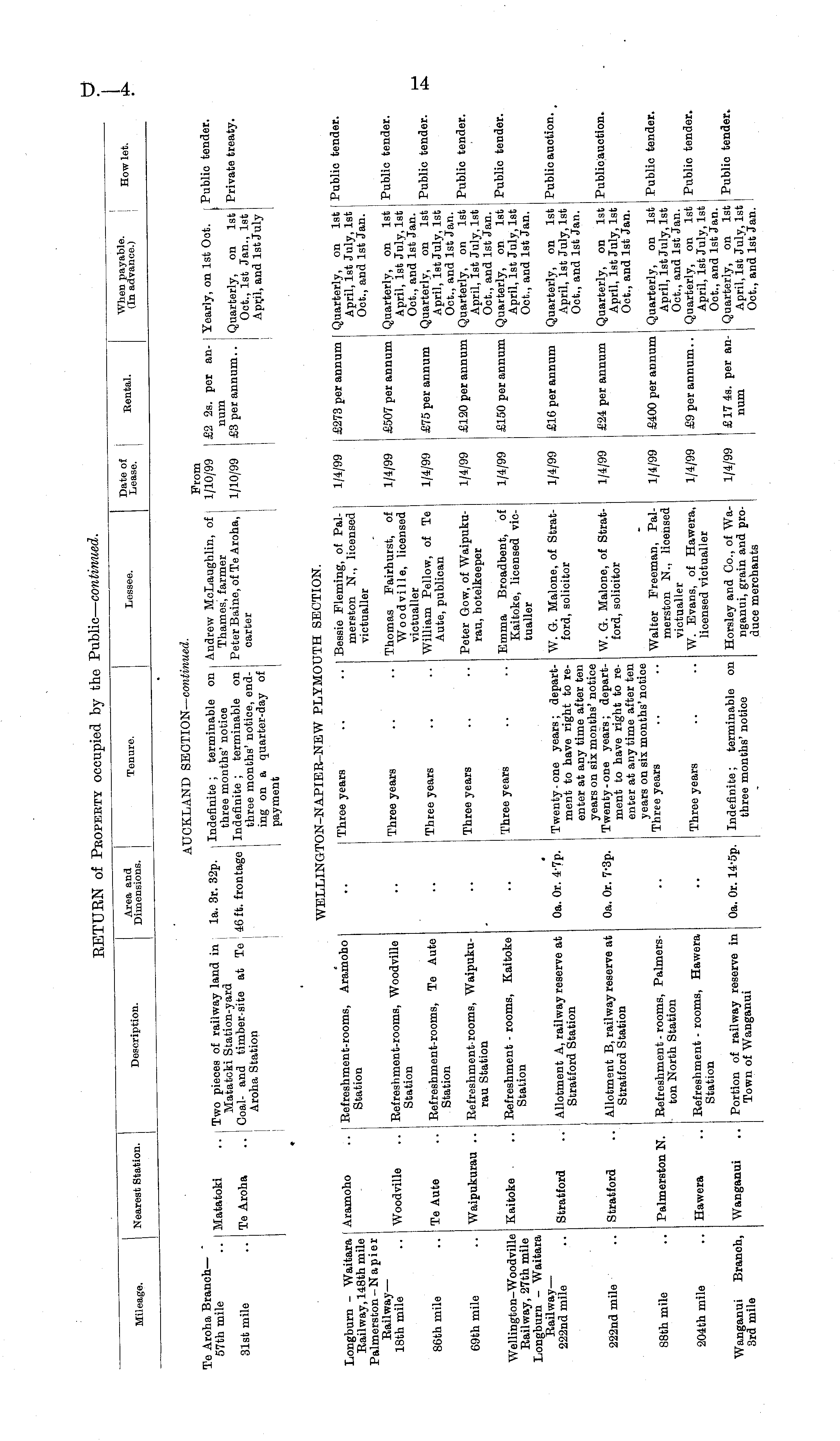 Nearest Station. Area and Dimensions. Tenure. Lessee. Date of Lease. Rental. When payable. (In advance.) How let. Description. Mileage. AT ICKLAND SECTION— contim ted. le Aroha Branch — 57th mile 31st mile Matatoki .. i Te Aroha Two pieces of railway land in ; Matatoki Station-yard Coal- and timber-site at Te Aroha Station la. 3r. 32p. =6 ft. frontage Indefinite ; terminable on three months' notice Indefinite ; terminable on three months' notice, ending on a quarter-day of payment indrew McLaughlin, of Thames, farmer Peter Baine, of Te Aroha, carter From 1/10/99 1/10/99 E2 2s. per an- j num £3 per annum.. Yearly, on 1st Oct. j Quarterly, on 1st Oct., 1st Jan., 1st Apr.il, and 1st July j ublio tender. 'rivate treaty. 1 I I I <f WELLINGTi )N-NAPIER-NEW PLYMOX FTH SECTION. £273 per annum Longburn - Waitara Railway, 148th mile Palmerston -Napier Railway — 18th mile Aramoho .. [ Refreshment-rooms, Aramoho Station Three years Bessie Fleming, of Palmerston N., licensed victualler 1/4/99 Quarterly, on 1st April, 1st July, 1st Oct., and 1st Jan. Public tender. Woodville Refreshment-rooms, Woodville Station Three years ' Thomas Fairhurst, of Woodville, licensed victualler William Pellow, of Te Aute, publican 1/4/99 £507 per annum Quarterly, on 1st April, 1st July, 1st Oct., and 1st Jan. Quarterly, on 1st April, 1st July, 1st Oct., and 1st Jan. Quarterly, on 1st April, 1st July, 1st Oct., and 1st Jan. Quarterly, on 1st April, 1st July, 1st Oct., and 1st Jan. Public tender. 86th mile Te Aute Refreshment-rooms, Te Aute Station Three years 1/4/99 £75 per annum Public tender. 69th mile Waipukurau .. Refreshment-rooms, Waipukurau Station Three years Peter Gow, of Waipukurau, hotelkeeper 1/4/99 £120 per annum Public tender. Wellington-Woodville Railway, 27th mile Longburn - Waitara Railway — 222nd mile Kaitoke Refreshment - rooms, Kaitoke Station Three years Emma Broadbent, of Kaitoke, licensed victualler 1/4/99 £150 per annum Public tender. Stratford Allotment A, railway reserve at Stratford Station ( Oa. Or. 4-7p. Twenty-one years; department to have right to reenter at any time after ten years on six months' notice Twenty-one years; department to have right to reenter at any time after ten years on six months' notice Three years W. G. Malone, of Stratford, solioitor 1/4/99 £16 per annum Quarterly, on 1st April, 1st July, 1st Oct., and 1st Jan. Public auotion. 222nd mile Stratford Allotment B, railway reserve at Stratford Station Oa. Or. 7-3p. W. G. Malone, of Stratford, solioitor 1/4/99 £24 per annum Quarterly, on 1st April, 1st July, 1st Oot., and 1st Jan. Publicauctiom 88th mile Palmerston N. I Refreshment - rooms, Palmers- - ton North Station Walter Freeman, Palmerston N., licensed victualler W. Evans, of Hawera, licensed victualler 1/4/99 £400 per annum Quarterly, on 1st April, 1st July, 1st Oct., and 1st Jan. Quarterly, on 1st April, 1st July, 1st Oct., and 1st Jan. Quarterly, on 1st April, 1st July, 1st Oct., and 1st Jan. Public tender. 204th mile Hawera Refreshment - rooms, Hawera Station Three years 1/4/99 £9 per annum.. Public tender. Wanganui Oa. Or. 14-5p. Indefinite; terminable on three months' notice Horsley and Co., of Wanganui, grain and produce merchants 1/4/99 £ 17 4s. per annum Public tender* Wanganui Branoh, 3rd mile Portion of railway reserve in Town of Wanganui I