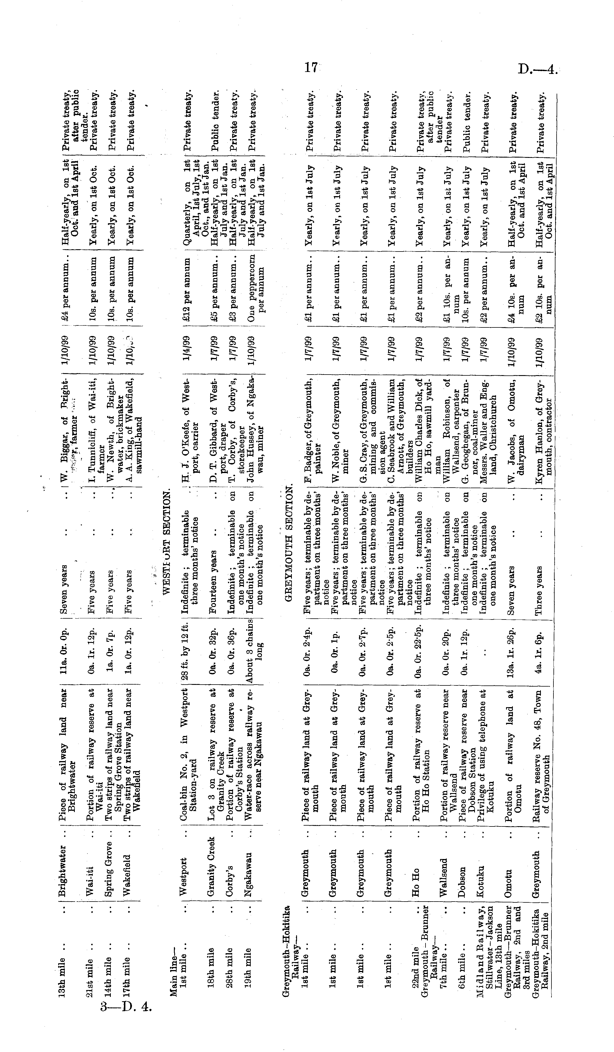 * ■" 13th mile Brightwater .. Pieoe of railway land near Brightwater 11a. Or. Op. | i Seven years .. .. I W. Biggar, of Brighter, farmer ■■■-■• 1/10/99 £4 per annum.. Half-yearly, on 1st I Oct. and 1st April Yearly, on 1st Oot. Private treaty, after public tender. Private treaty. 21st mile .. Wai-iti Portion of railway reserve at Wai-iti Two strips of railway land near Spring Grove Station Two strips of railway land near Wakefield Oa. lr. 12p. Five years .. .. I. Tunniclifi, of Wai-iti, farmer Five years .. ...W. Newth, of Brightwater, brickmaker Five years ... .. A. A. King, of Wakefield, sawmill-hand 1/10/99 1/10/99 1/10/99 10s. per annum a - 0 14th mile Spring Grove .. la. Or. 7p. 10s. per annum Yearly, on 1st Oot. Private treaty. ■j 17th mile .. Wakefield la. Or. 12p. 10s. per annum Yearly, on 1st Oot. Private treaty. I Main line — 1st mile .. .. | j Westport Coal-bin No. 2, in Westport Station-yard 28 ft. by 12 ft. j WESTruRT SECTION. £12 per annum Quarterly, on 1st April, 1st July, 1st Oct., and 1st Jan. Half-yearly, on 1st July and 1st Jan. Half-yearly, on 1st July and 1st Jan. Half-yearly, on 1st July and 1st Jan. Private treaty. Public tender. Private treaty. Private treaty. 18th mile 28th mile Granity Creek Corby's Lot 3 on railway reserve at Granity Creek Portion of railway reserve at Corby's Station Water-race across railway reserve near Ngakawau Oa. Or. 32p. Oa. Or. 36p. Indefinite ; terminable I H. J. O'Keefe, of Westthree months' notice . j port, carrier Fourteen years .. .. D. T. Gibbard, of WestI port, draper Indefinite ; terminable on T. Corby, of Corby's, one month's notice storekeeper Indefinite ; terminable on John Hussey, of Ngakaone month's notice wau, miner 1/4/99 1/7/99 1/7/99 1/10/99 £5 per annum.. £3 per annum.. 19th mile Ngakawau About 3 chains long One peppercorn per annum Greymouth-Hokitika Railway — 1st mile .. .. j | Greymouth Piece of railway land at Greymouth Oa. Or. 2-4p. . GREYMOUTH SECTION. £1 per annum.. 1st mile .. 1st mile 1st mile Greymouth Greymouth Greymouth .. Piece of railway land at Greymouth Piece of railway land at Greymouth Piece of railway land at Greymouth Oa. Or. lp. Oa. Or. 2-7p. Oa. Or. 2-5p. Five years; terminable by de- F. Badger, of Greymouth, partment on three months' painter notioe Five years ; terminable by de- W. Noble, of Greymouth, partment on three months' miner notice Five years; terminable by de- G.S.Cray, of Greymouth, partment on three months' mining and commisnotice sion agent Five years; terminable by de- C. Seabrook and William partment on three months' Arnott, of Greymouth, notice builders Indefinite ; terminable on William Charles Dick, of three months' notice Ho Ho, sawmill yardman Indefinite ; terminable on William Robinson, of three months' notice Wallsend, carpenter Indefinite ; terminable on G. Geoghegan, of Brunone month's notice ner, coal-miner Indefinite ; terminable on Messrs. Waller and Engone month's notice land, Christchurch 1/7/99 1/7/99 1/7/99 1/7/99 1/7/99 1/7/99 1/7/99 1/7/99 £1 per annum.. £1 per annum.. £1 per annum.. Yearly, on 1st July i Yearly, on 1st July I Yearly, on 1st July Yearly, on 1st July I Private treaty. Private treaty. Private treaty. Private treaty. 22nd mile Greymouth - Brunner Railway — 7th mile Ho Ho Wallsend Portion of railway reserve at Ho Ho Station Oa. Or. 22-5p. £2 per annum.. Yearly, on 1st July Yearly, on 1st July Private treaty, after public tender Private treaty. Portion of railway reserve near Wallsend Piece of railway reserve near Dobson Station Privilege of using telephone at Kotuku Oa. Or. 20p. £1 10s. per annum 10s. per annum 6th mile Dobson Oa. lr. 12p. Yearly, on 1st July Public tender. Midland Railway, Stillwater - Jackson Line, 13th mile Greymouth —Brunner Railway, 2nd and 3rd miles Greymouth-Hokitika Railway, 2nd mile Kotuku Omotu Greymouth Portion of railway land at Omotu 13a. lr. 26p. Seven years .. .. W. Jacobs, of Omotu, dairyman 1/10/99 £2 per annum.. £4 10s. per annum Yearly, on 1st July Half-yearly, on 1st Oct. and 1st April Private treaty. Private treaty. Railway reserve No. 48, Town of Greymouth 4a. lr. 6p. Three years .. .. Kyren Hanlon, of Greymouth, contractor 1/10/99 £2 10s. per annum Half-yearly, on 1st Oct. and 1st April Private treaty.